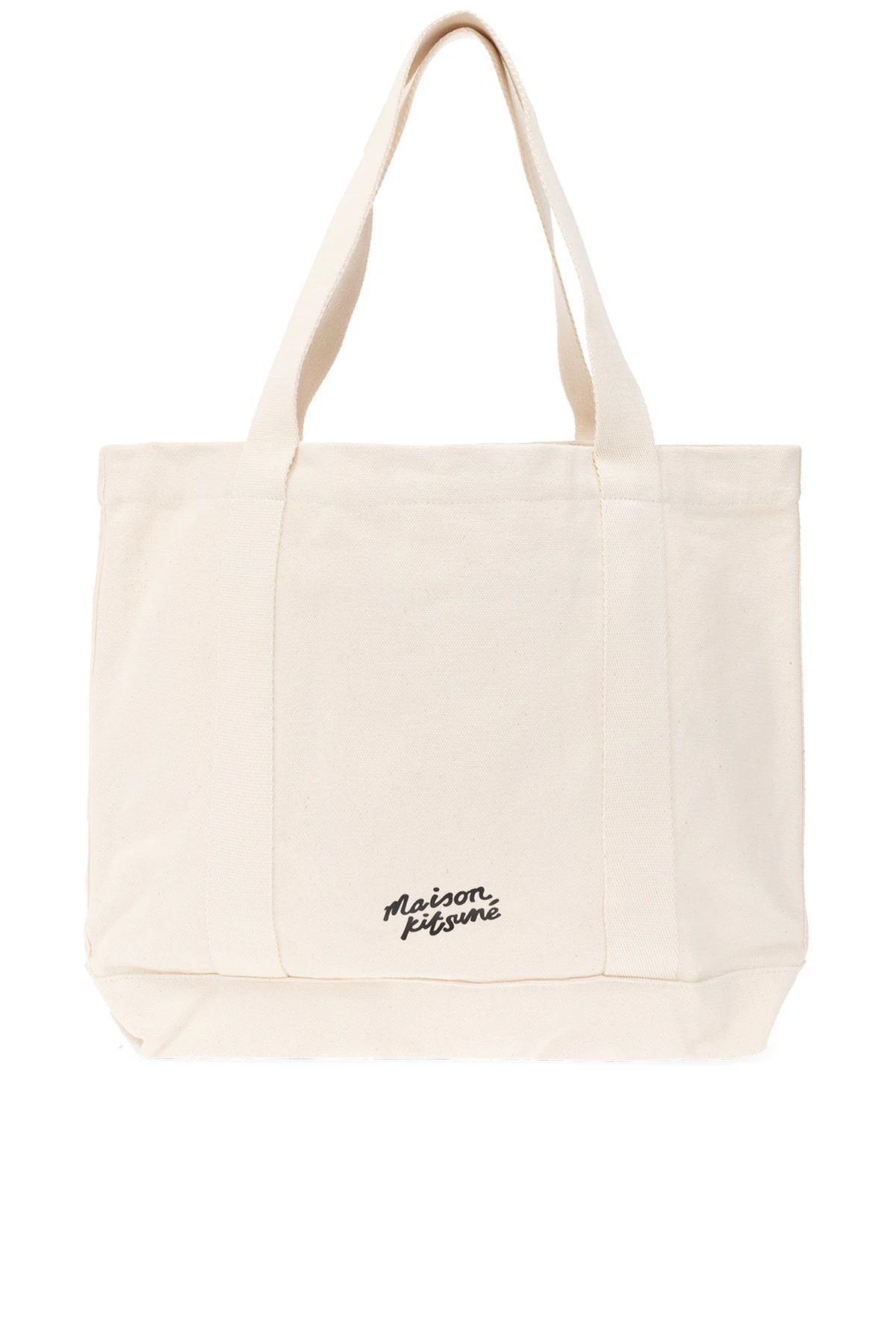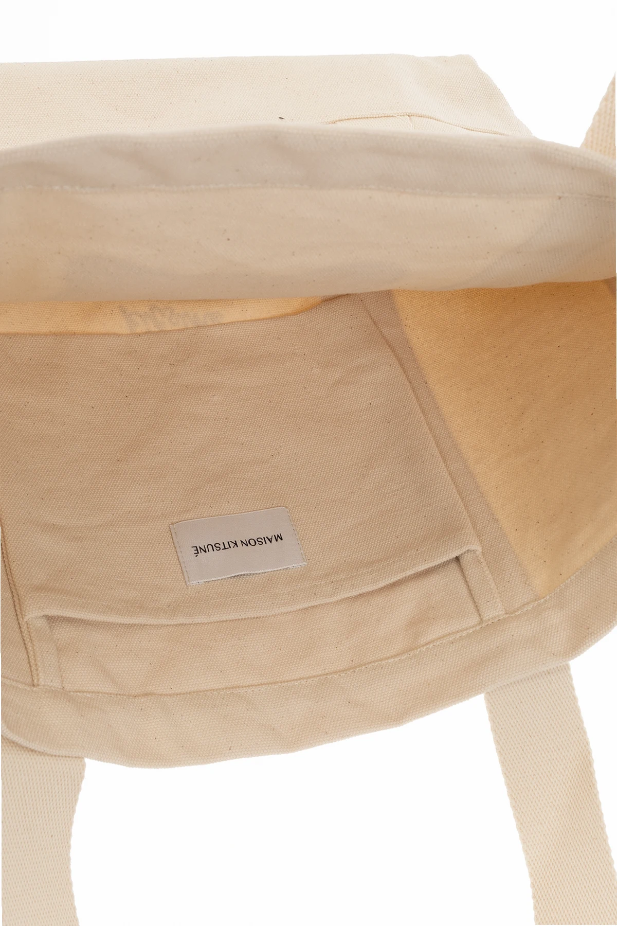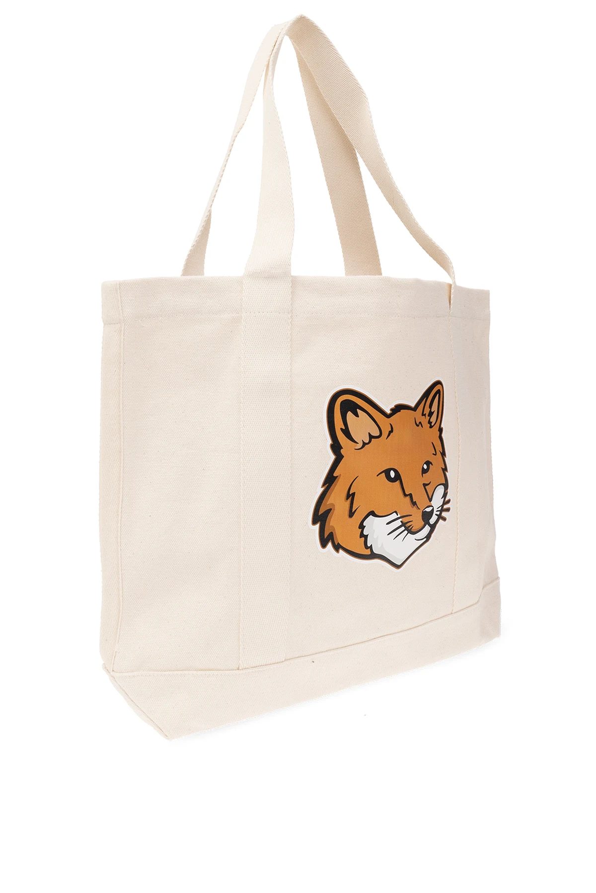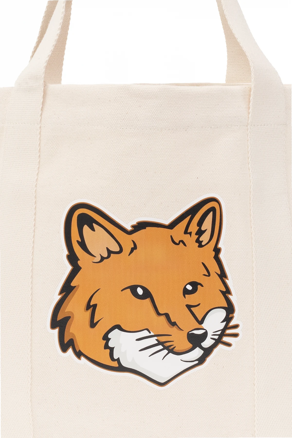 Kremowa torba typu ‘shopper’ Maison Kitsune. Wykonana z bawełny. Z przodu ozdobiona brązowo-biało-czarnym, nadrukowanym wzorem z logo. Z tyłu czarne logo. Dwie półokrągłe rączki. Wewnątrz komora i wsuwana kieszeń.
