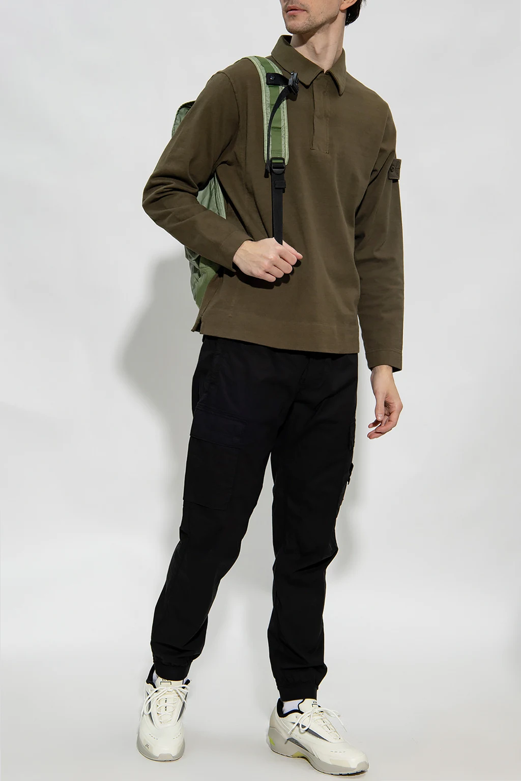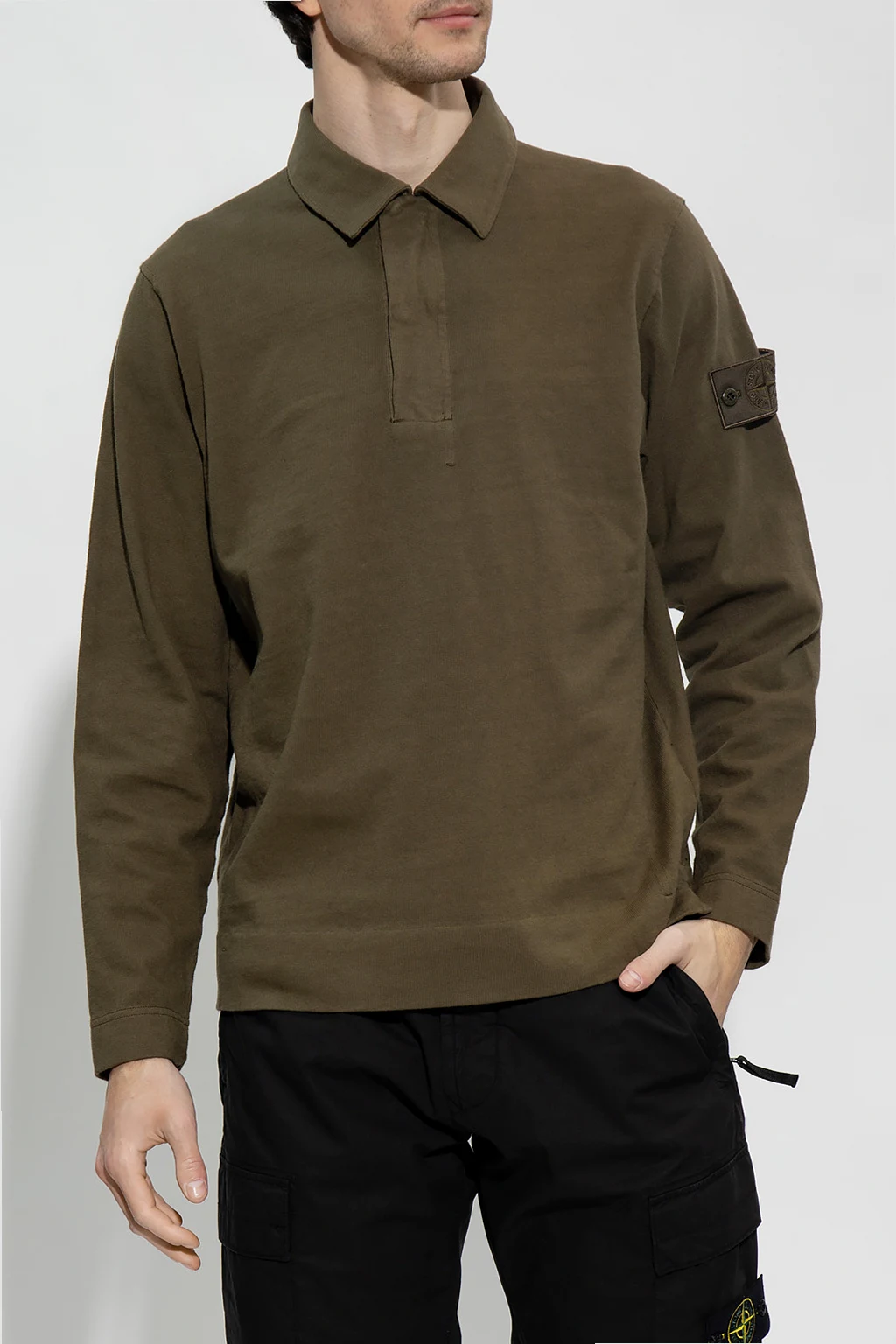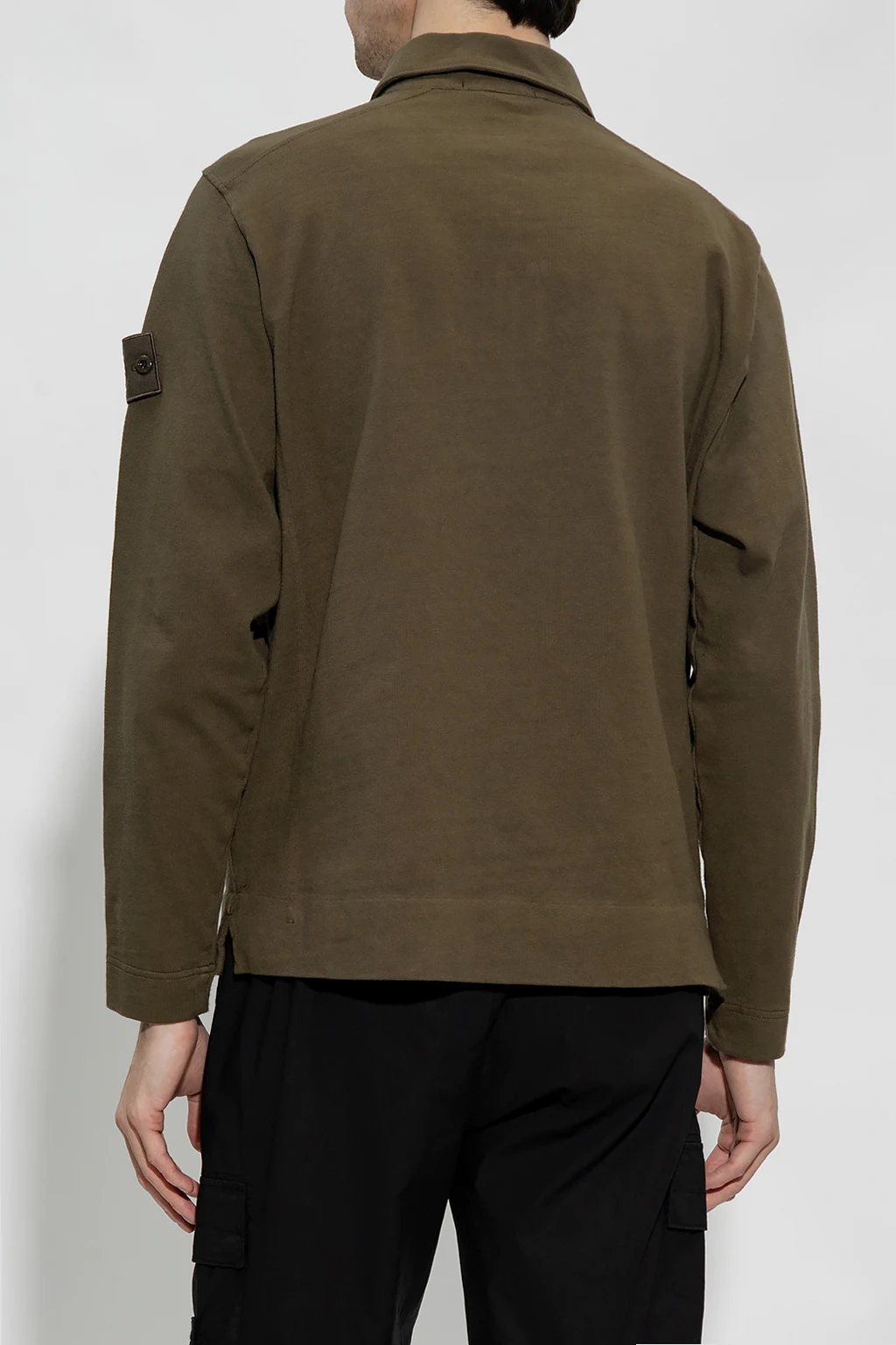 T-shirt w kolorze khaki, model 'Ghost Piece' Stone Island. Wykonany z bawełny. Z przodu krótkie zapięcie na zatrzaski. Na rękawie dekoracyjna naszywka z logo. Długie rękawy.