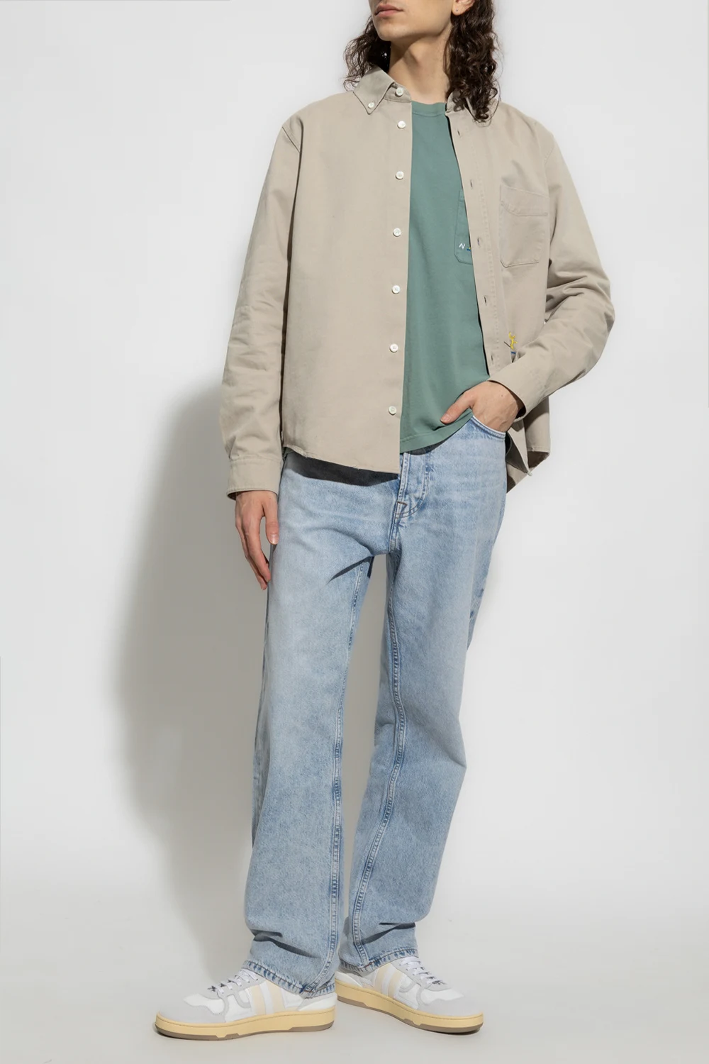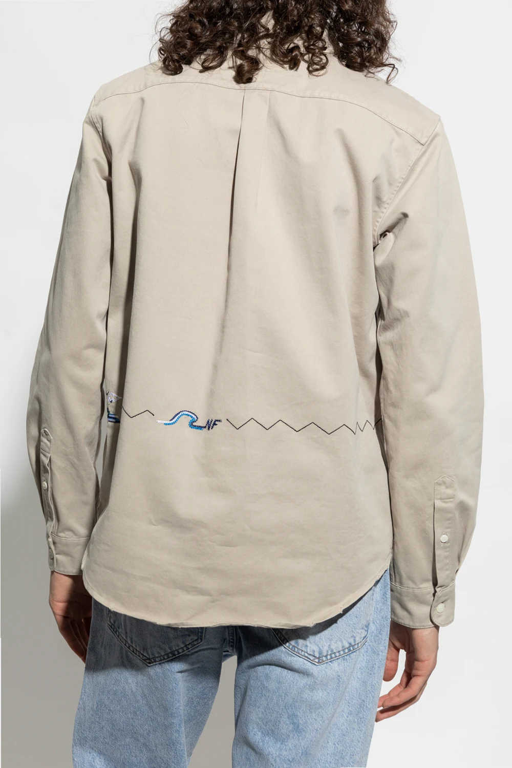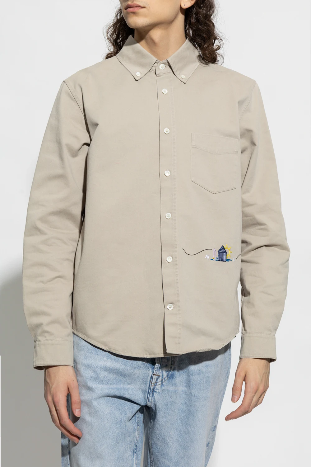 Jasnoszara, bawełniana koszula Nick Fouquet. Zapinana na guziki. Ozdobiona kolorowym haftem z logo. Z przodu kieszeń. Długie rękawy, mankiety zapinane na guzik.