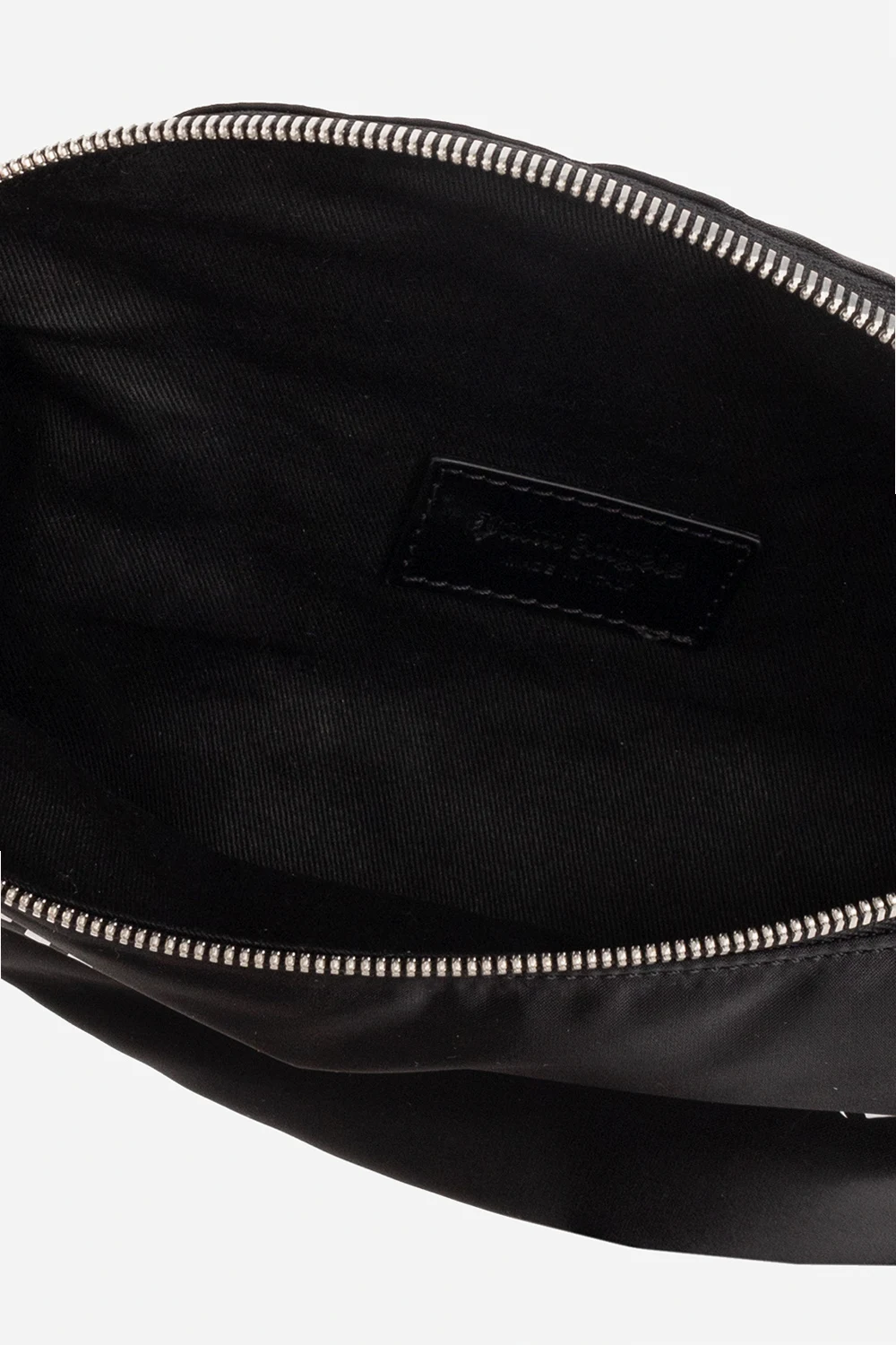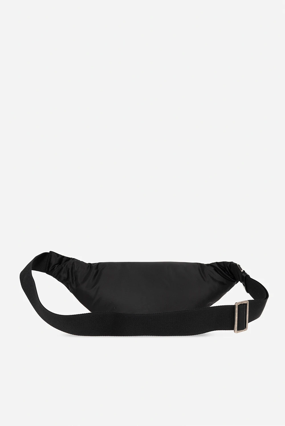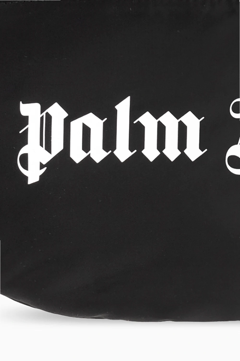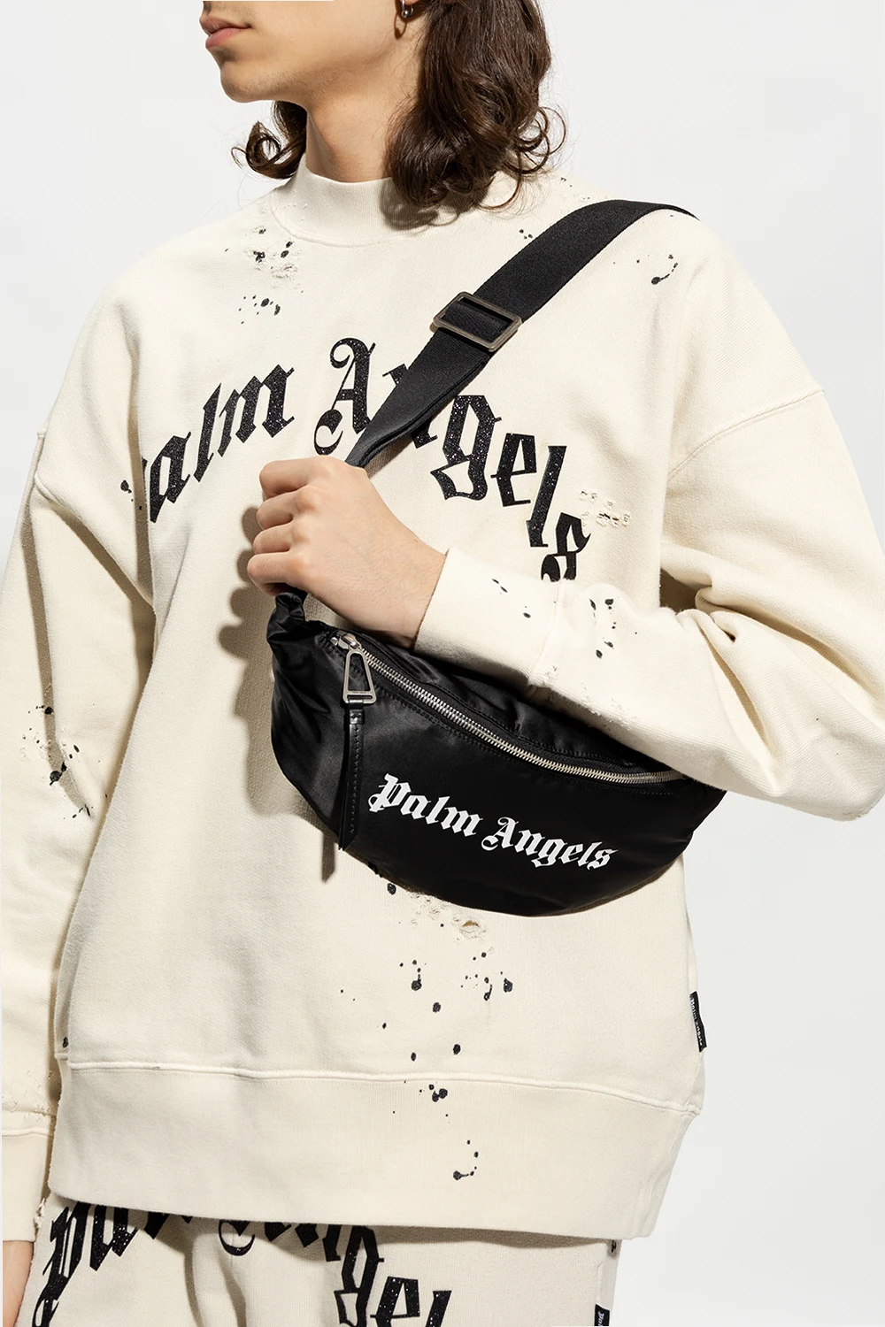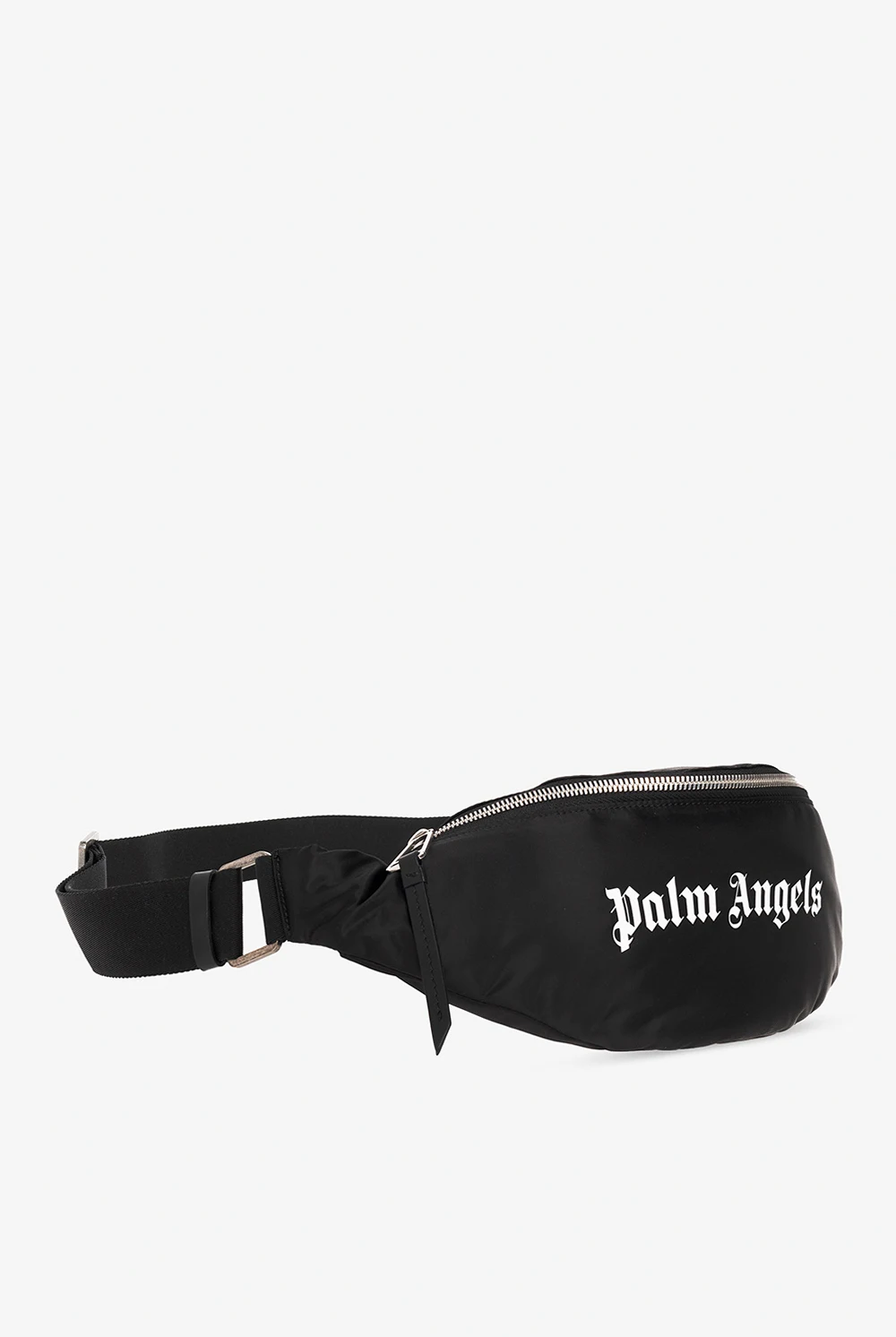 Czarna torba na pas Palm Angels. Zamykana na zamek. Z przodu ozdobiona nadrukowanym logo w kolorze białym. Pas na pas z możliwością regulacji długości. Wewnątrz komora. Metalowe elementy w kolorze postarzanego srebra.