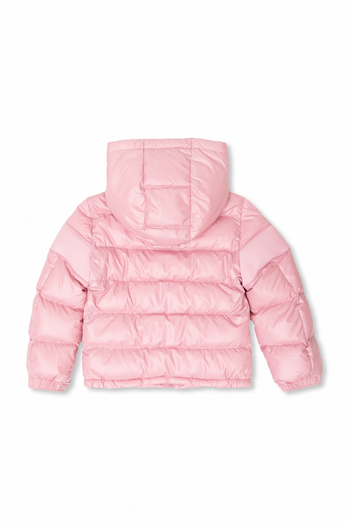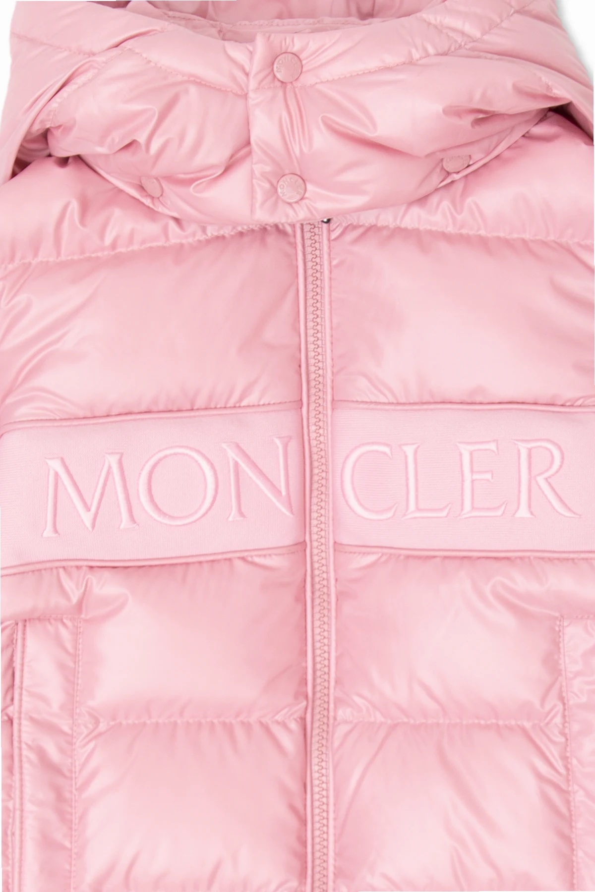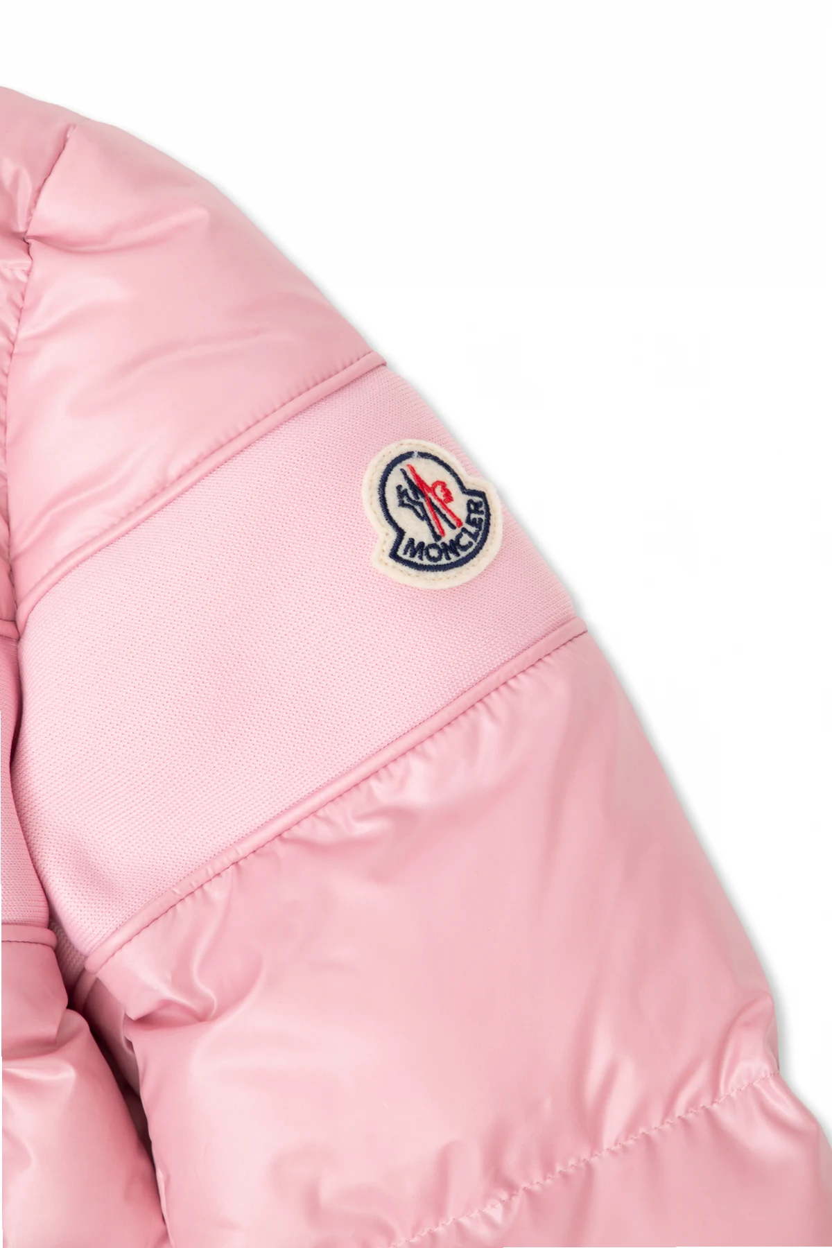 Różowa, puchowa kurtka, model ‘Truyere’ Moncler Enfant. Zapinana na zamek. Ozdobiona wyszytym logo. Na ramieniu naszywka z logo. Odpinany kaptur. Długie rękawy zakończone ściągaczem i regulowanym paskiem. Dwie kieszenie zapinane na zatrzask. Dół wykończony ściągaczem.