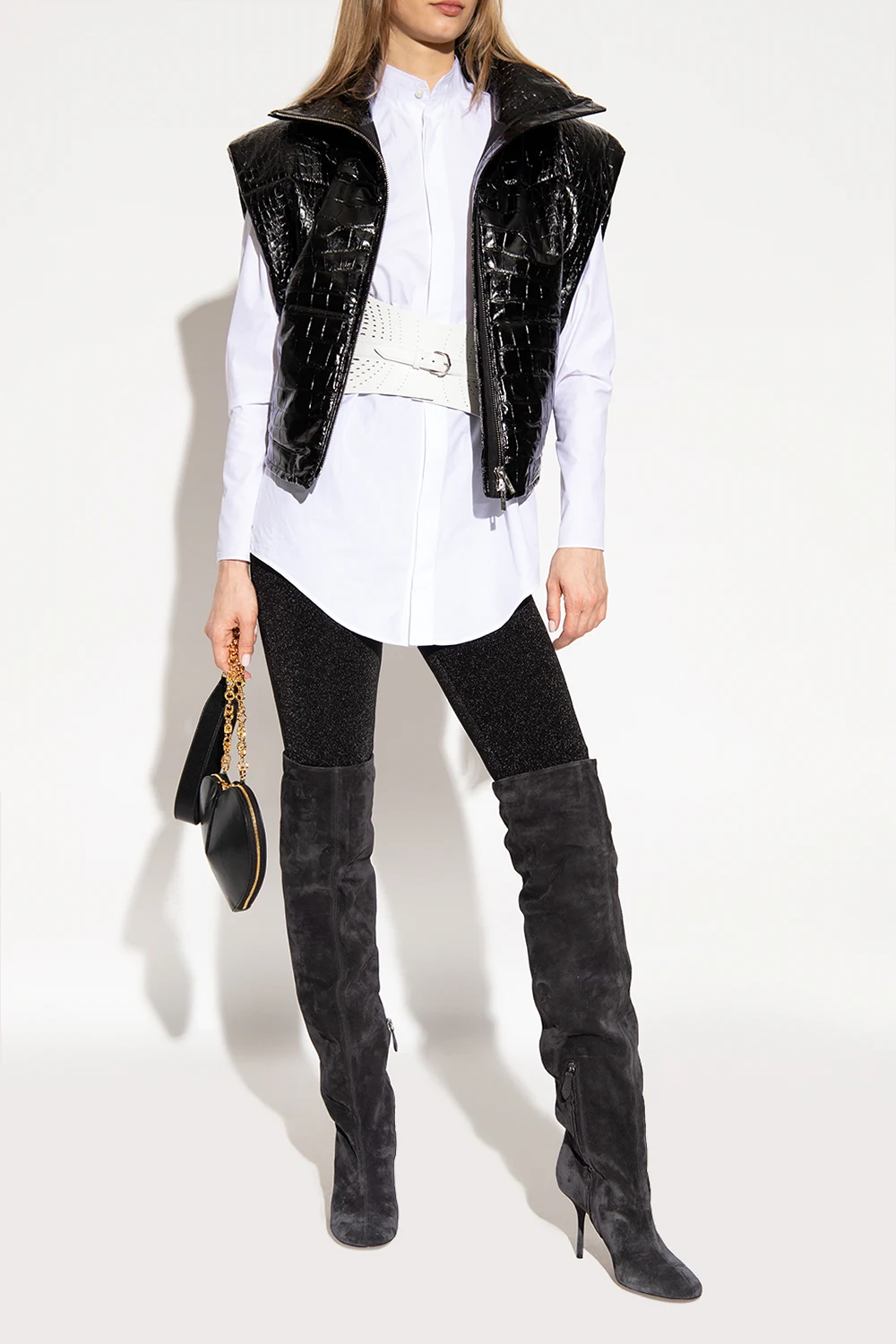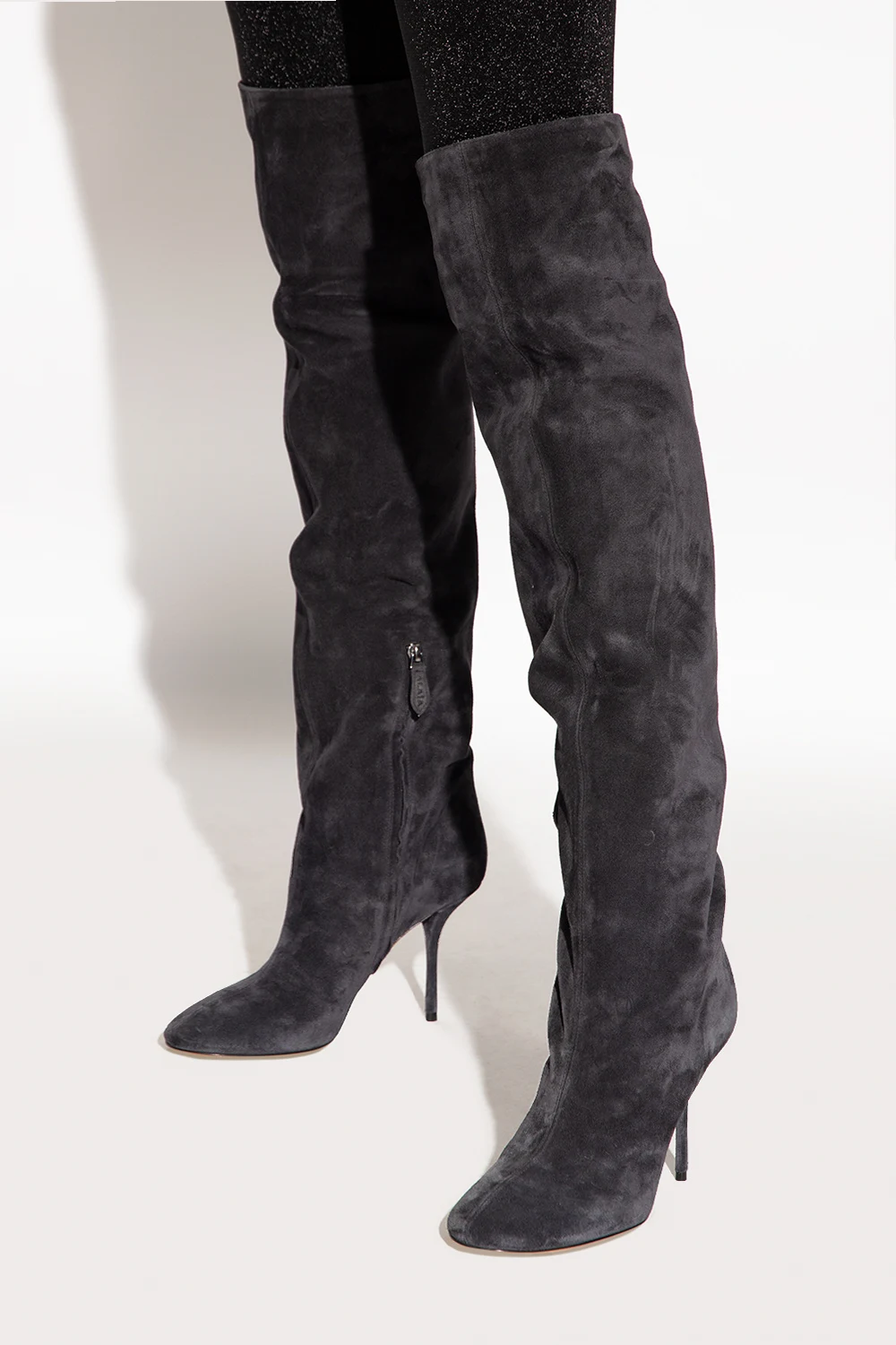 Ciemnoszare kozaki na obcasie, model ‘Fluide Boot’ Alaia. Wykonane z zamszu. Z boku zapinana na zamek. Brązowa podeszwa wykonana ze skóry i gumy.