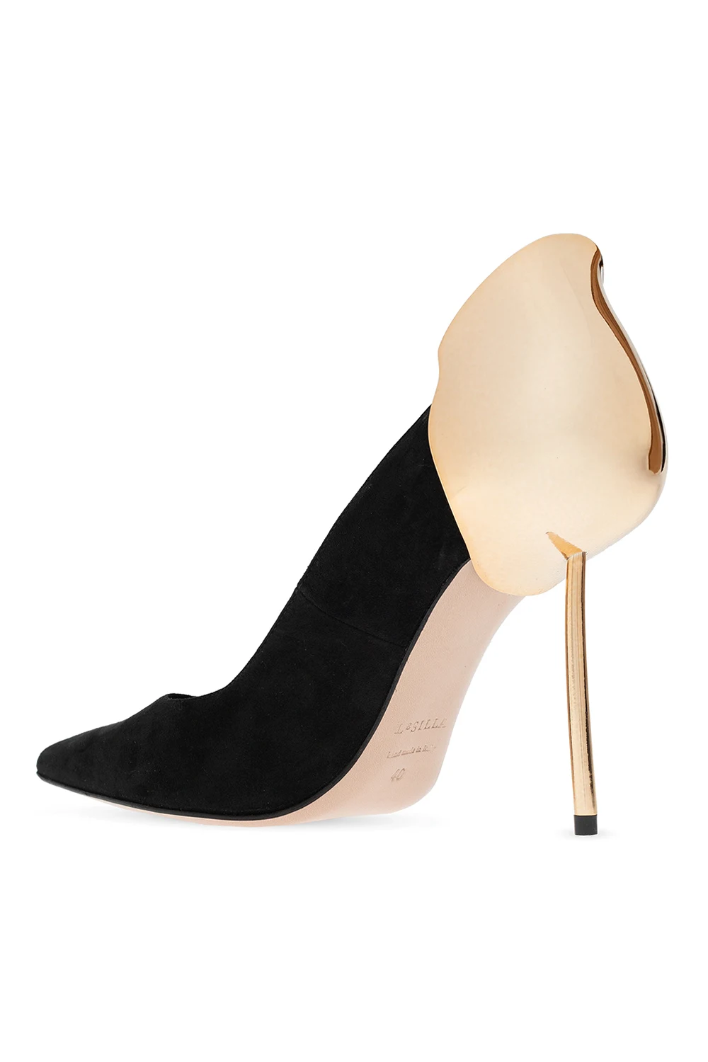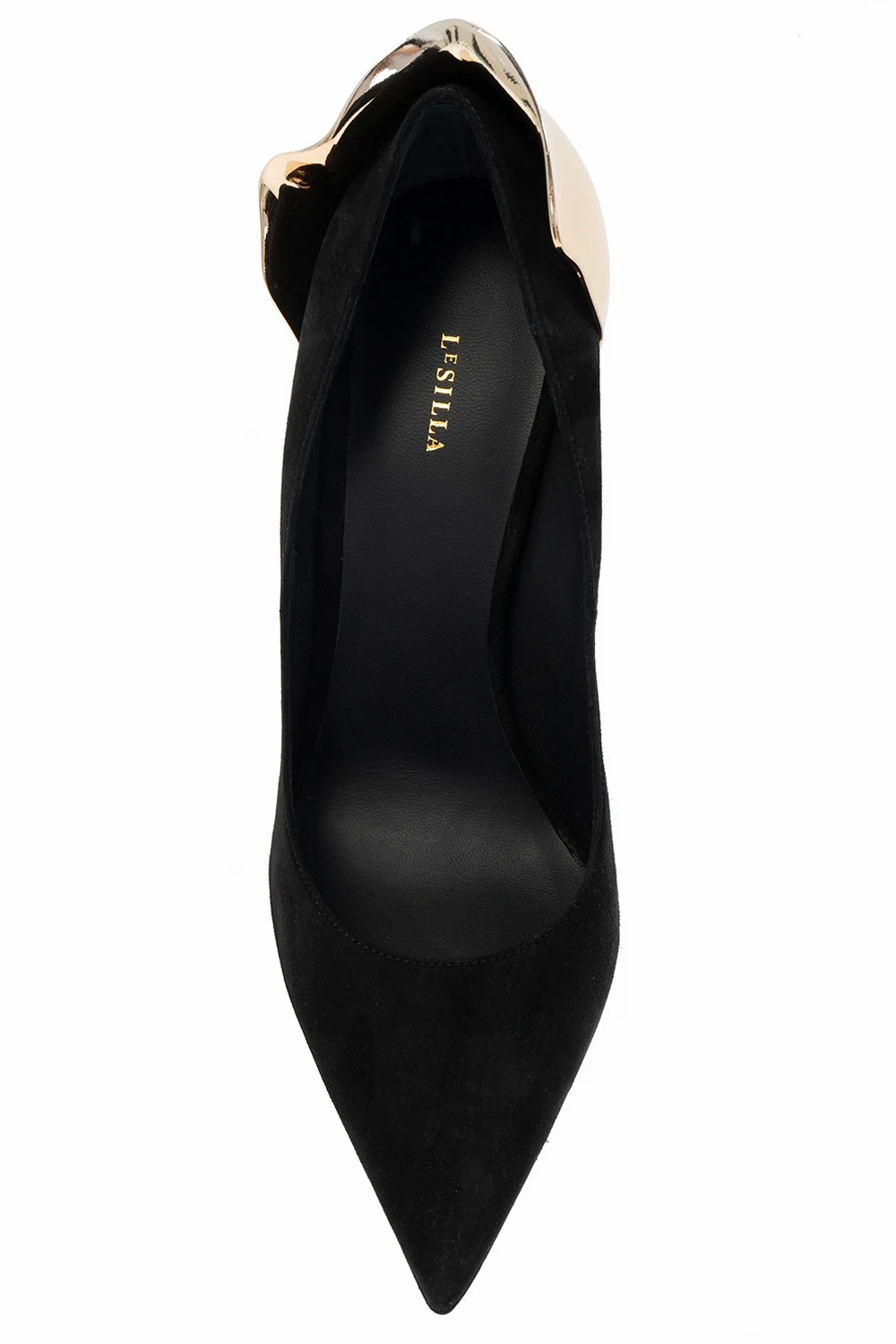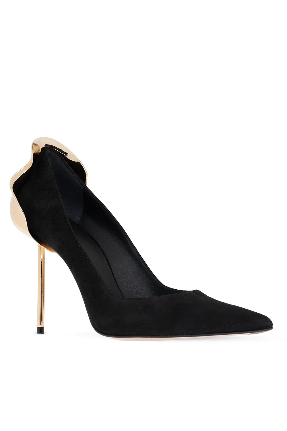 Buty na obcasie w kolorze czarno-złotym, model ‘ Deco Petalo’ Le Silla. Wykonane z zamszu. Dekoracyjne wykończenie. Nosek w szpic. Beżowa podeszwa wykonana ze skóry i gumy.