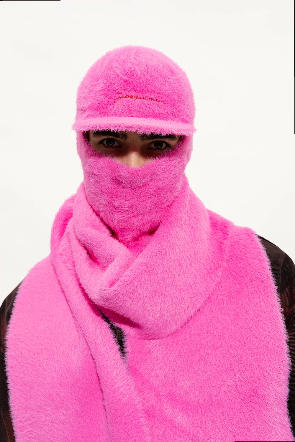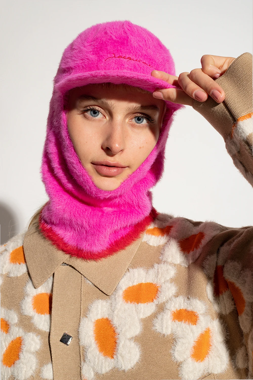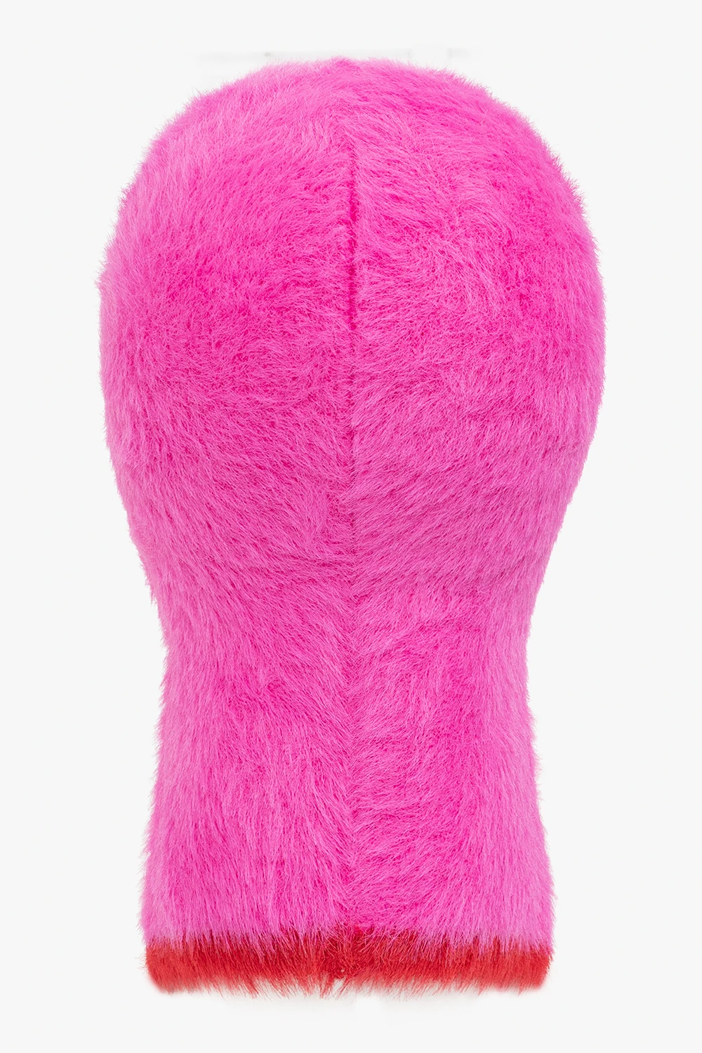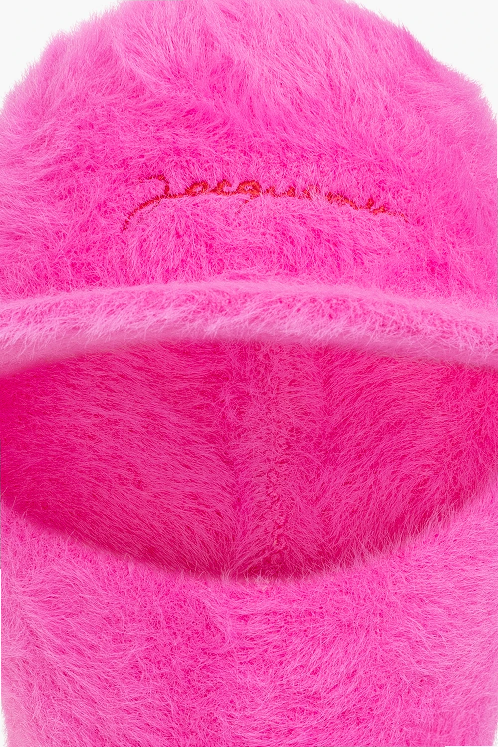 Różowa kominiarka z daszkiem Jacquemus. Wykonana z materiału o puszystym wykończeniu. Góra ozdobiona wyszytym logo, dół z czerwonym wykończeniem.