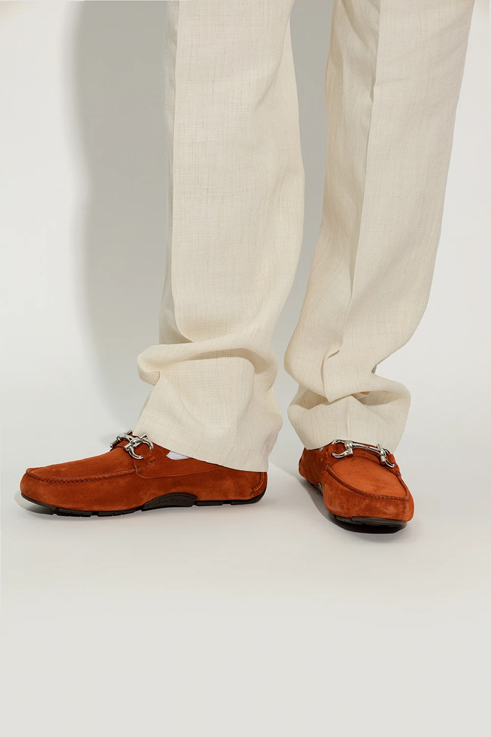 Pomarańczowe mokasyny, model ‘Parigi’ FERRAGAMO. Wykonane ze skóry. Ozdobione charakterystyczną dla marki aplikacją. Gumowa podeszwa.