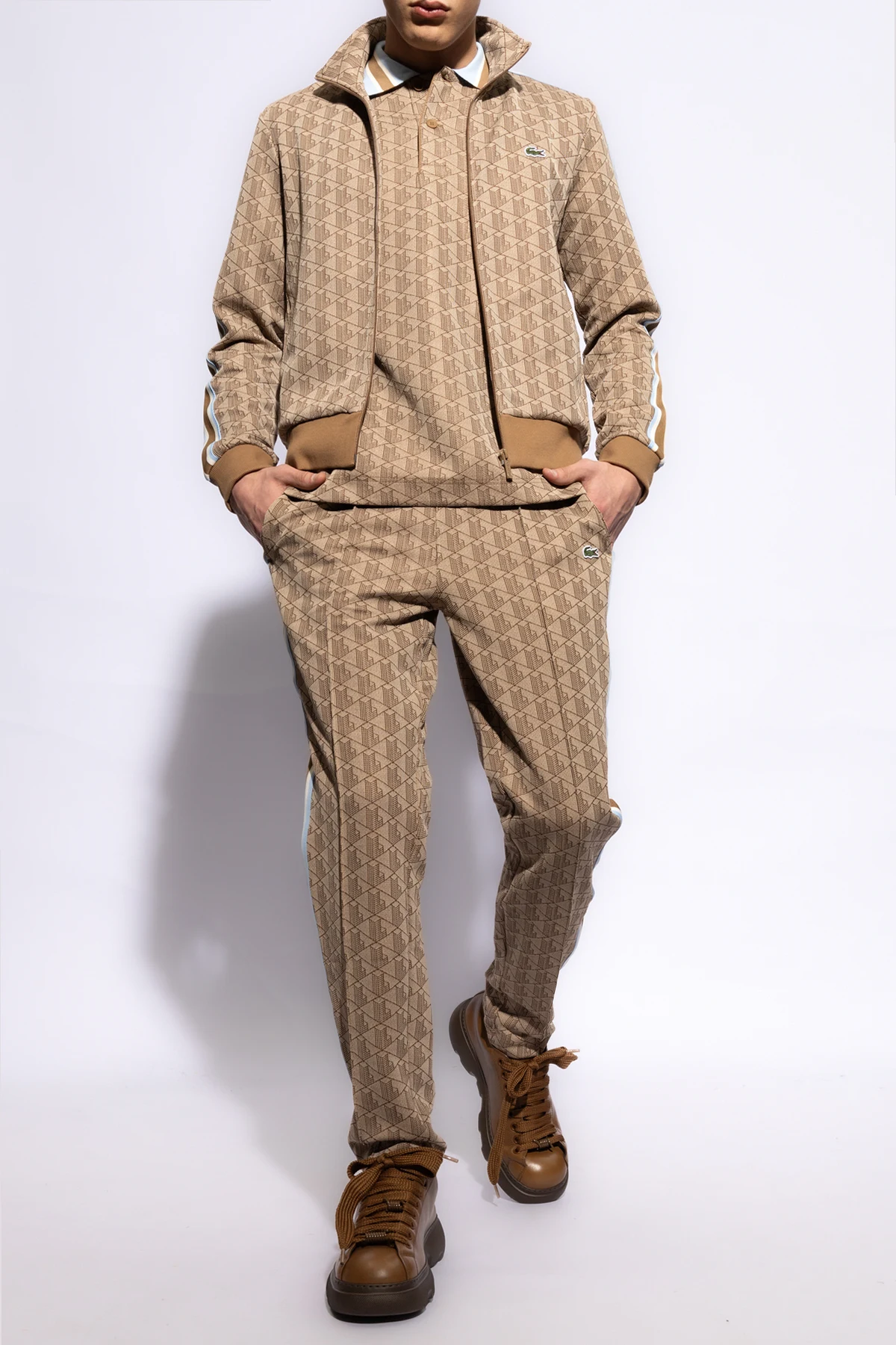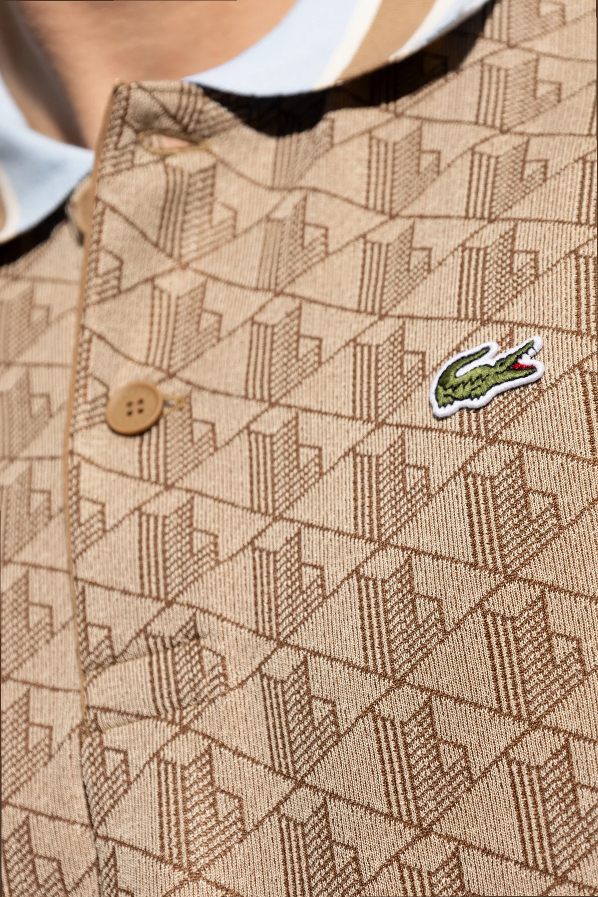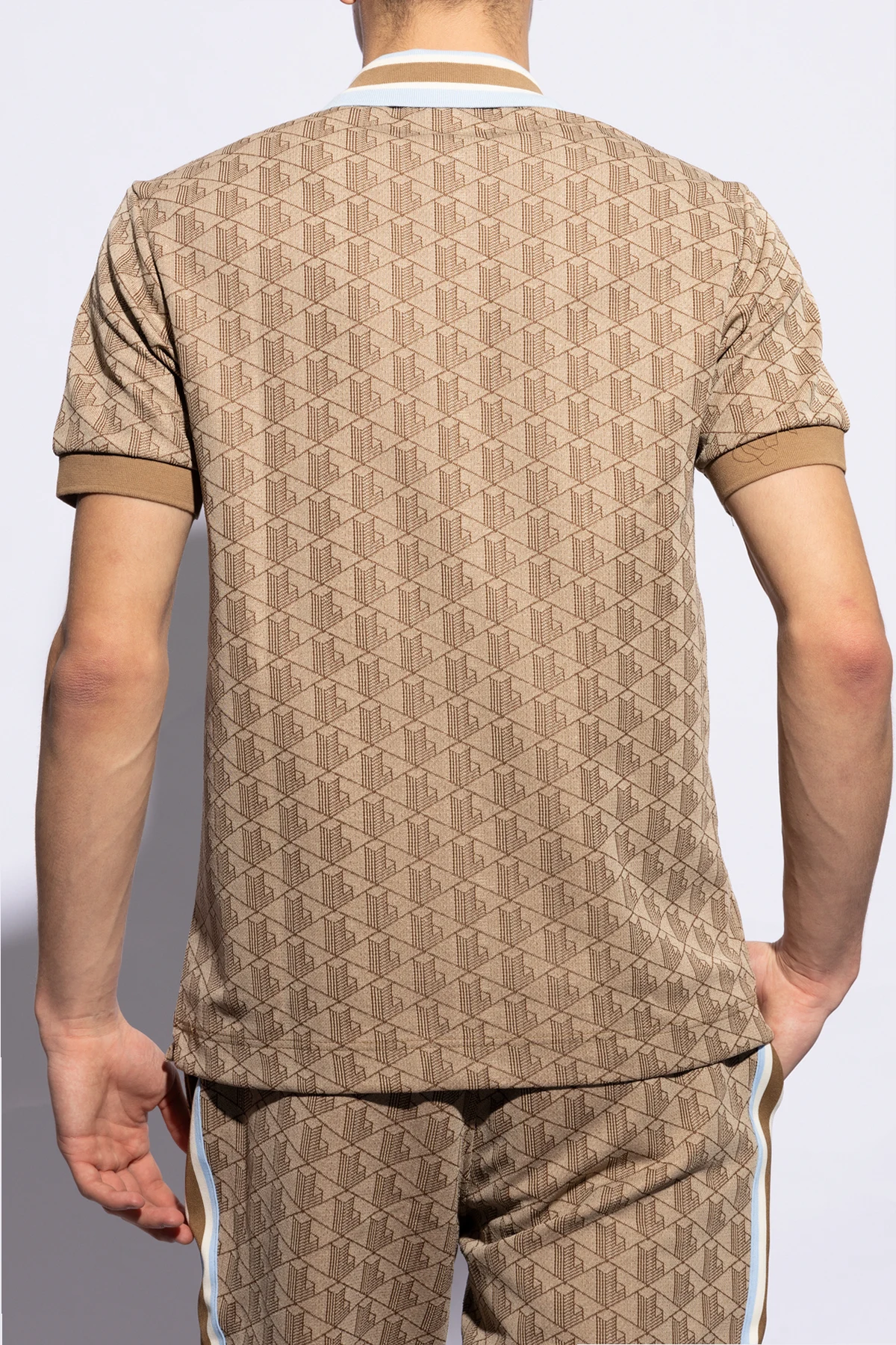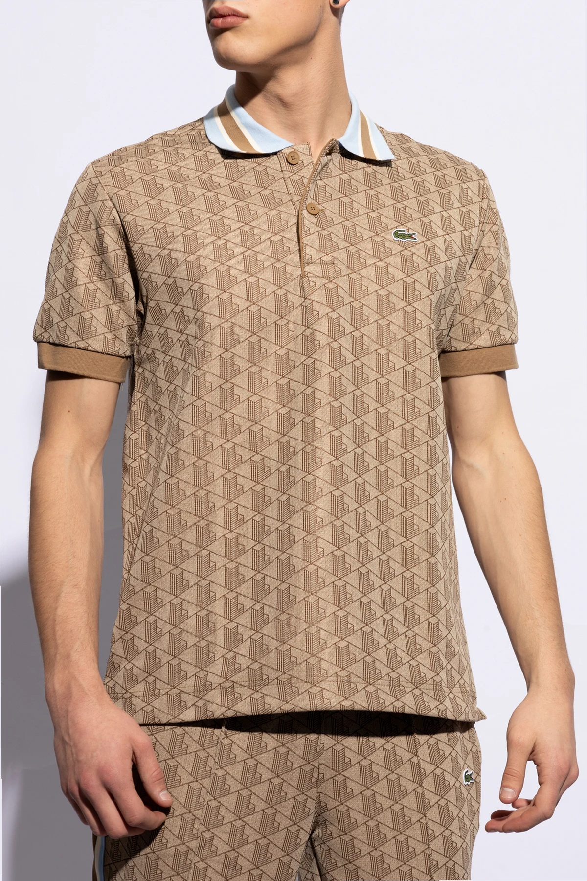 Beżowo-brązowe polo Lacoste. Kołnierz zapinany na guziki. Ozdobione wzorem z monogramem. Z przodu naszywka z logo. Krótkie rękawy zakończone ściągaczem w paski.