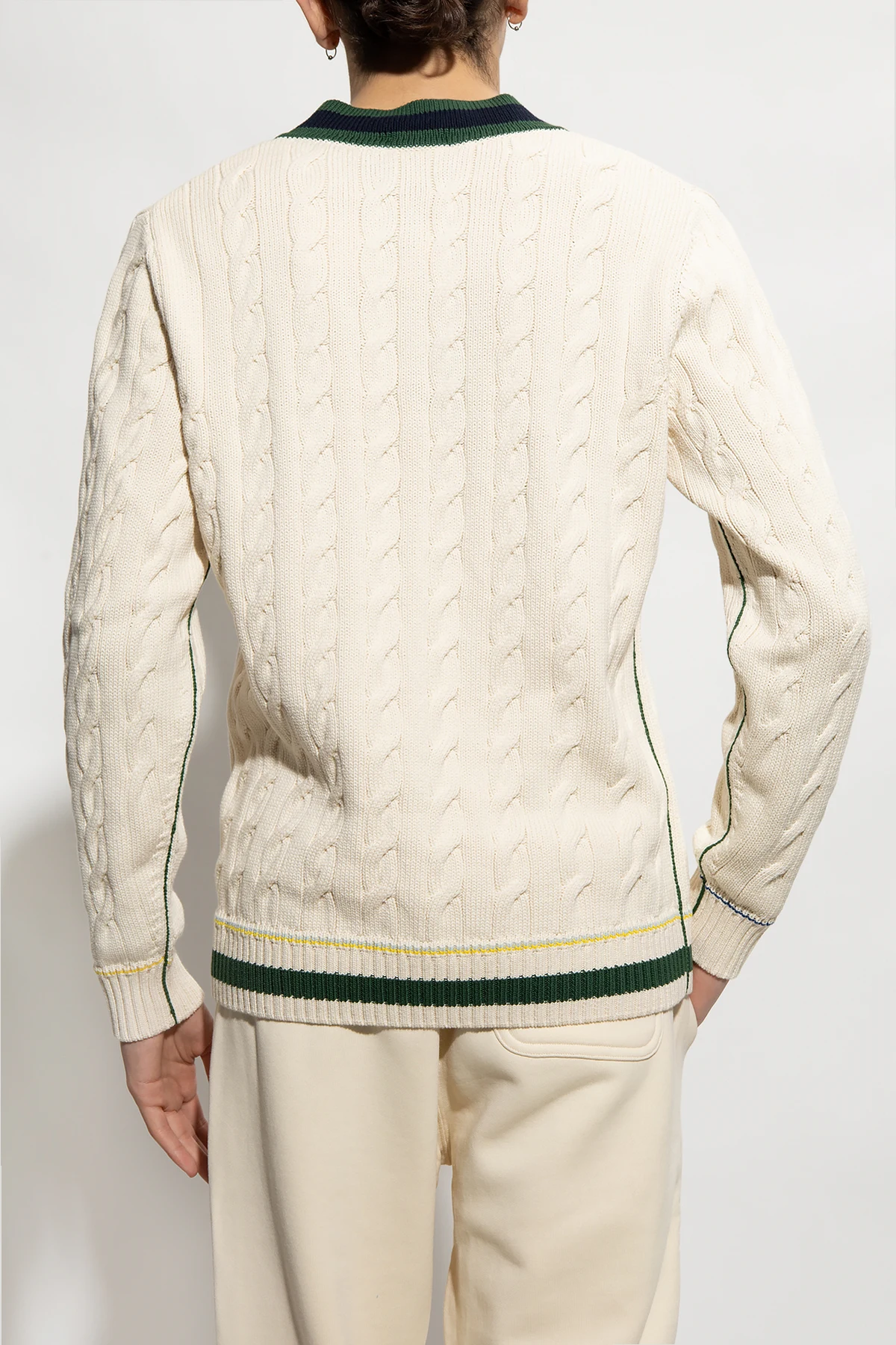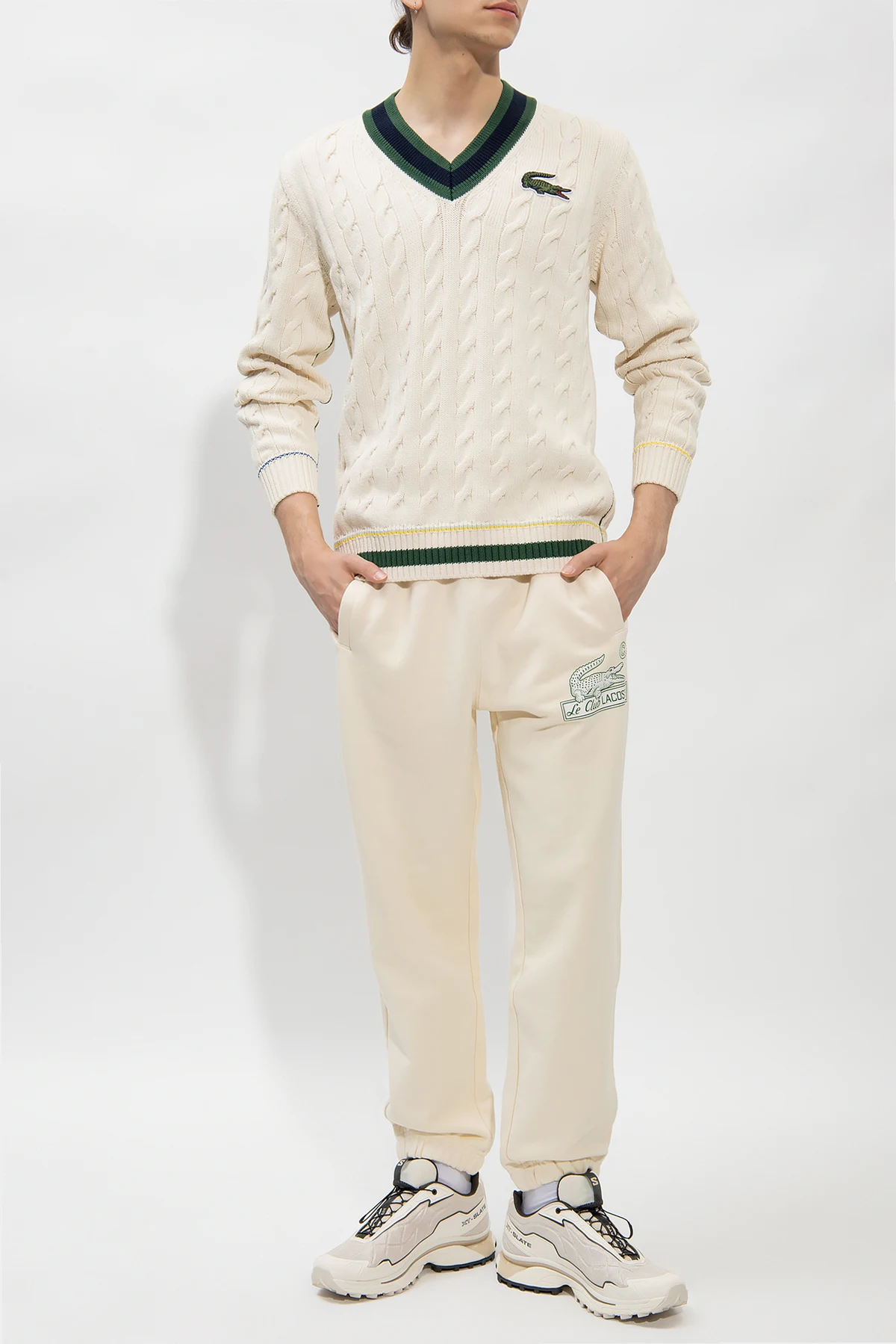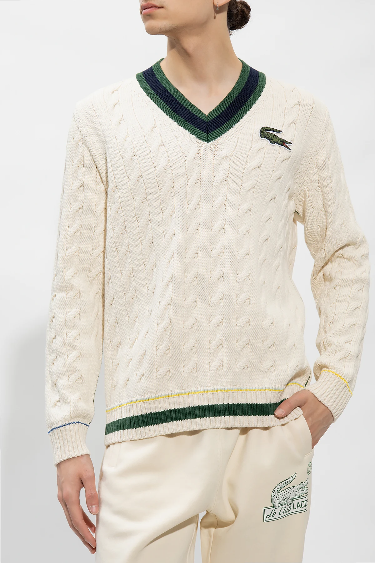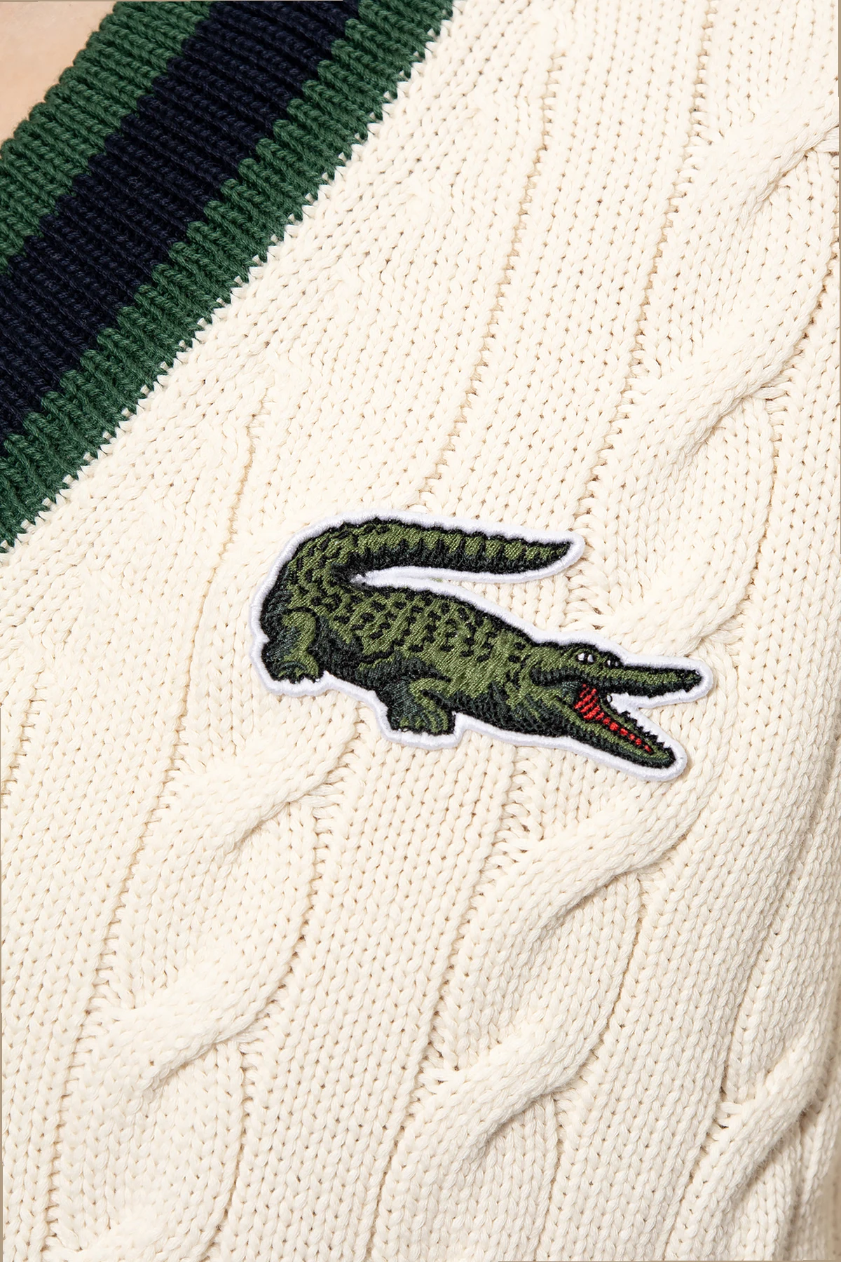 Kremowo-zielony sweter Lacoste. Wykonany z bawełny. Ozdobiony naszywką z logo. Dekolt w serek, dół i długie rękawy wykończone ściągaczem.