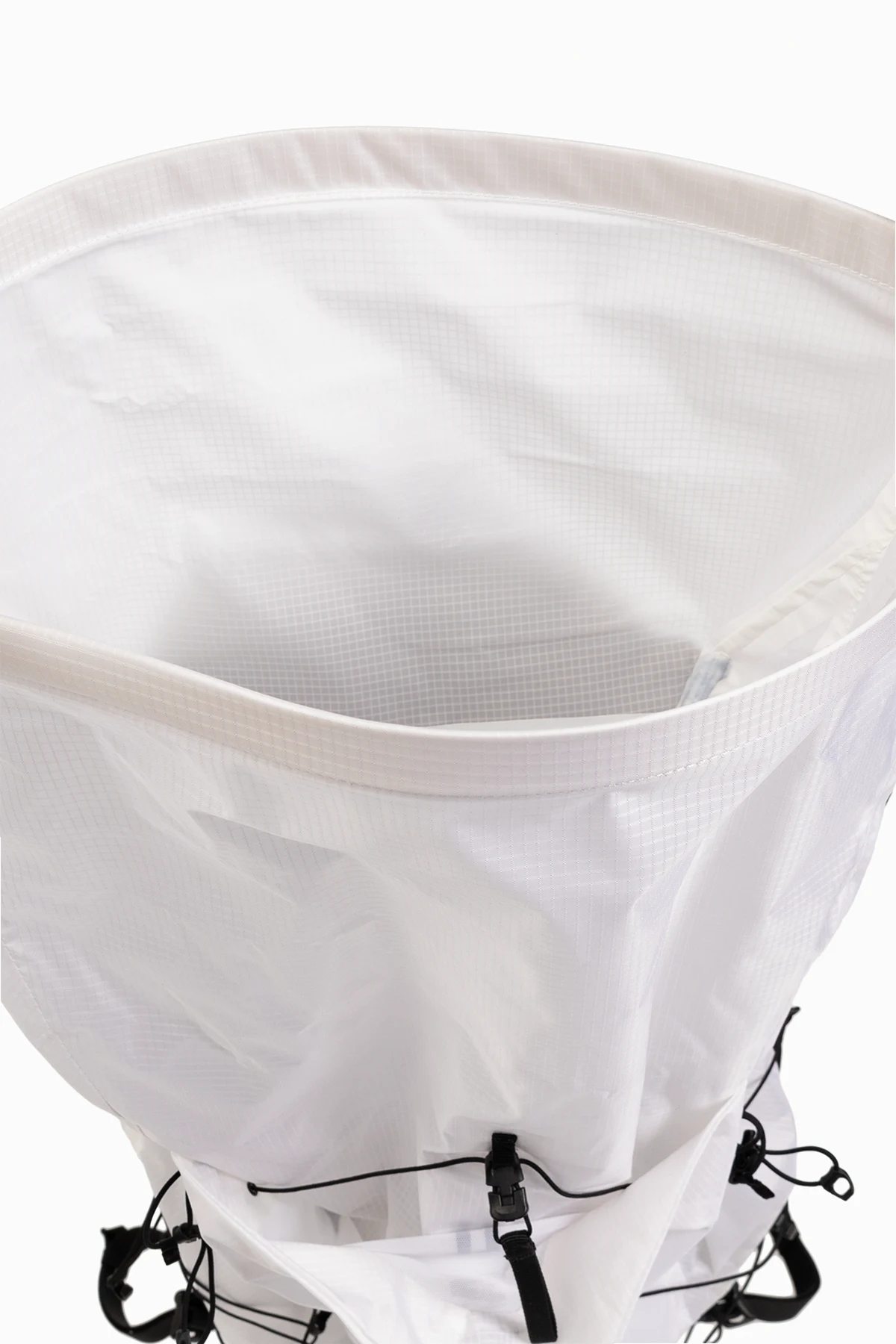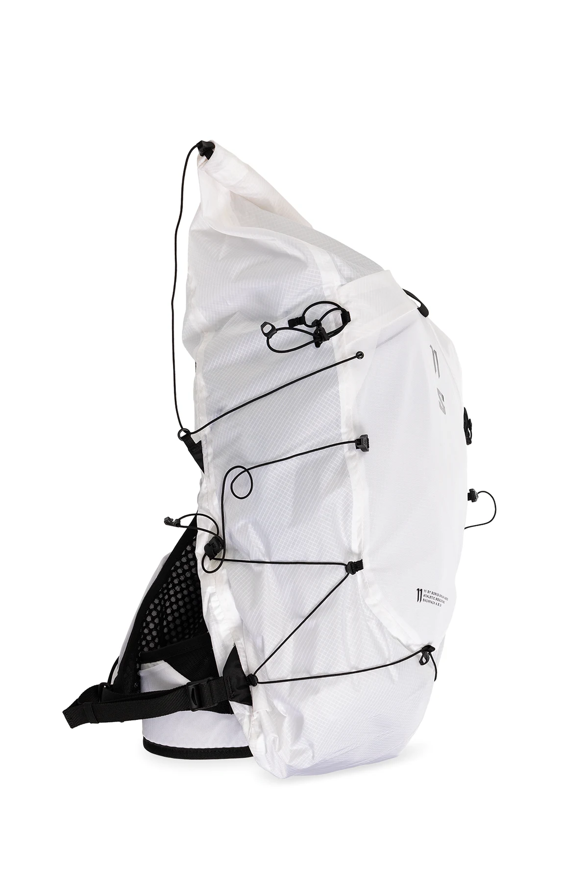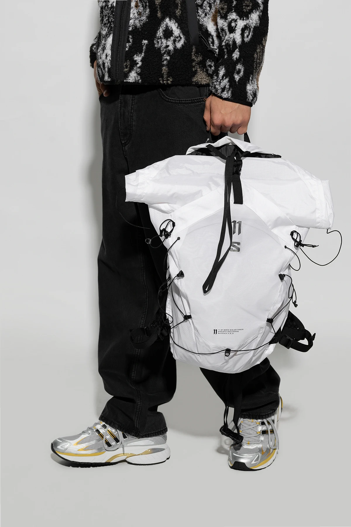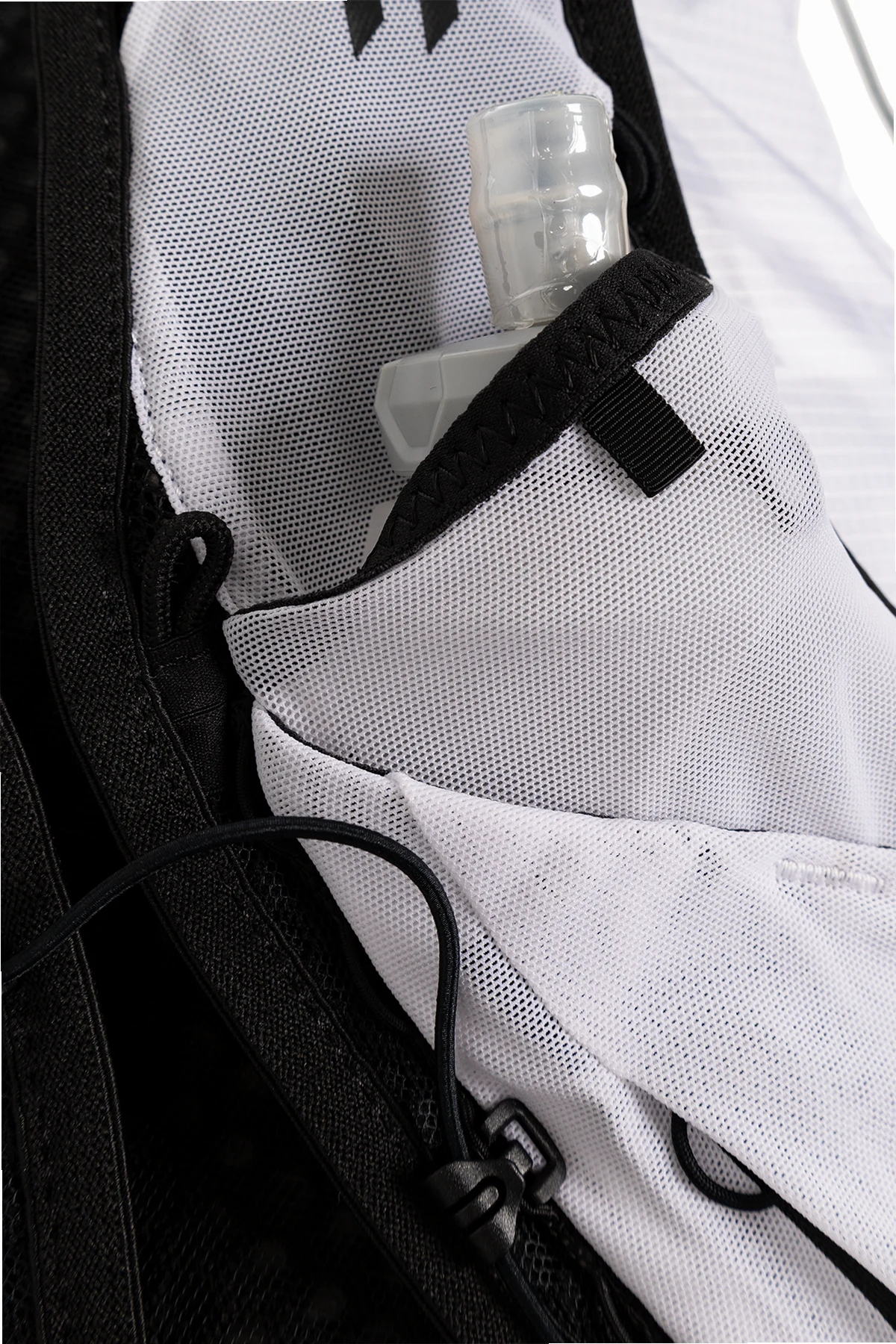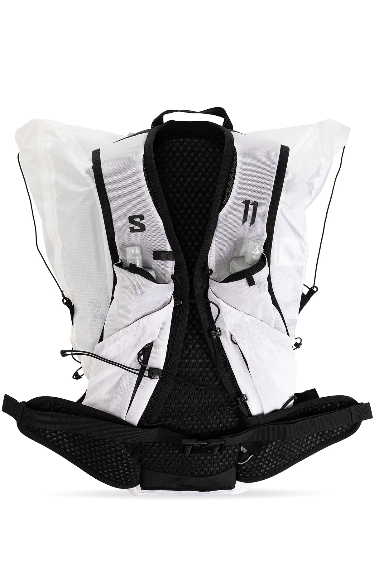 Biało-czarny plecak, model '11S' Salomon x Boris Bidjan Saberi. Wykonany z materiału o dużej odporności na niekorzystne warunki pogodowe. Zamykany na zatrzask i ściągany trokami. Ozdobiony nadrukiem i logo w kolorze jasnoszarym. Półokrągła rączka. Regulowane szelki z paskiem zapinanym na zatrzask oraz dwoma, miękkimi bidonami. Liczne kieszenie. Wewnątrz komora i kieszeń zamykana na zamek. Hybrydowa konstrukcja z szerokimi paskami barkowymi, podwójnymi paskami na klatce piersiowej oraz technologią SensiFit™ oferuje łatwą regulację, dopasowuje się do sylwetki i gwarantuje dodatkową stabilność (trzypunktowe mocowanie).