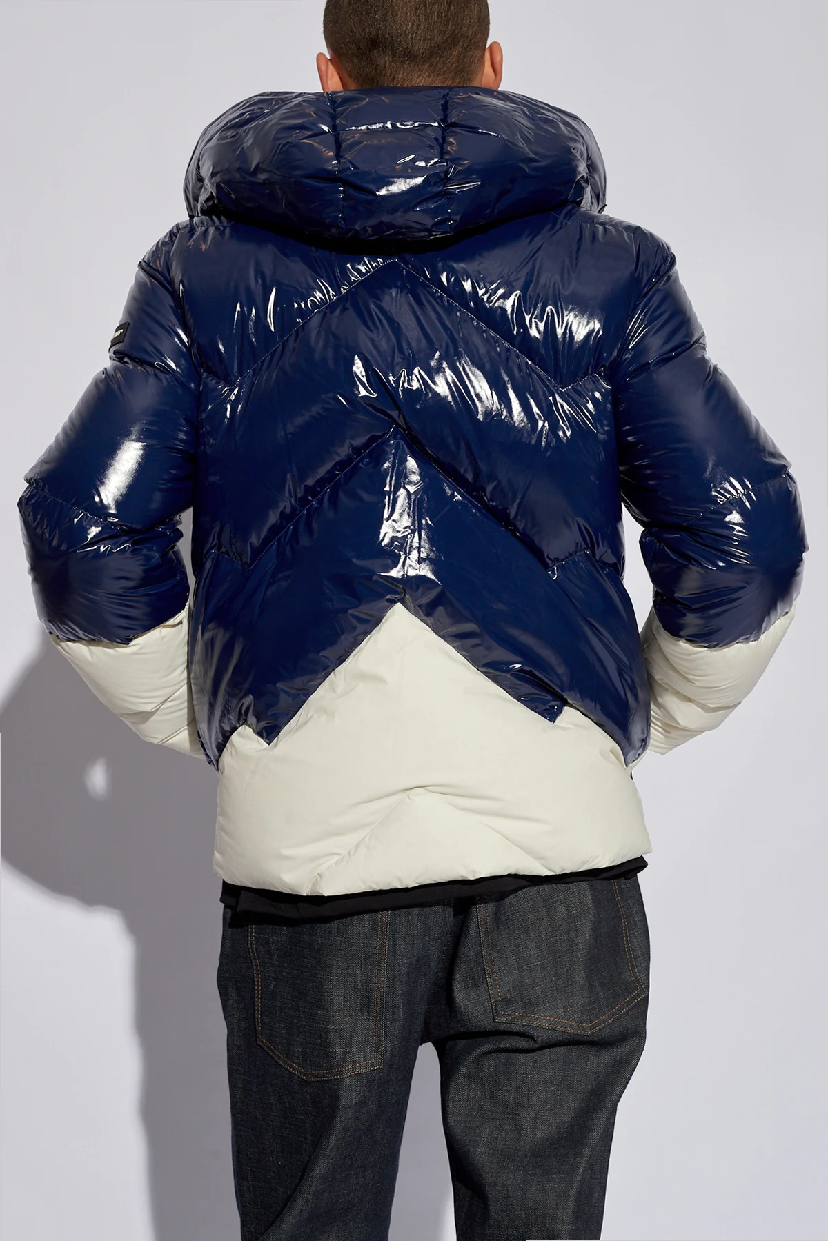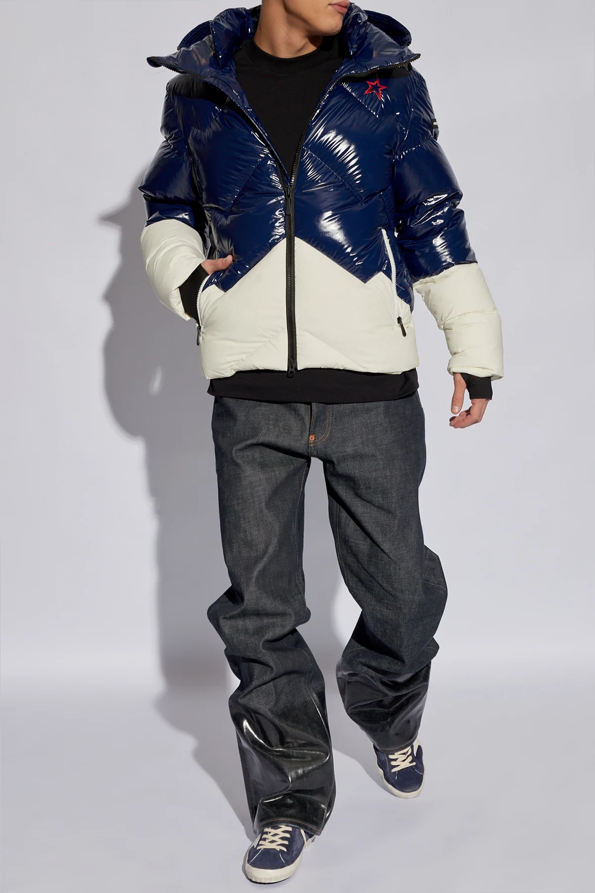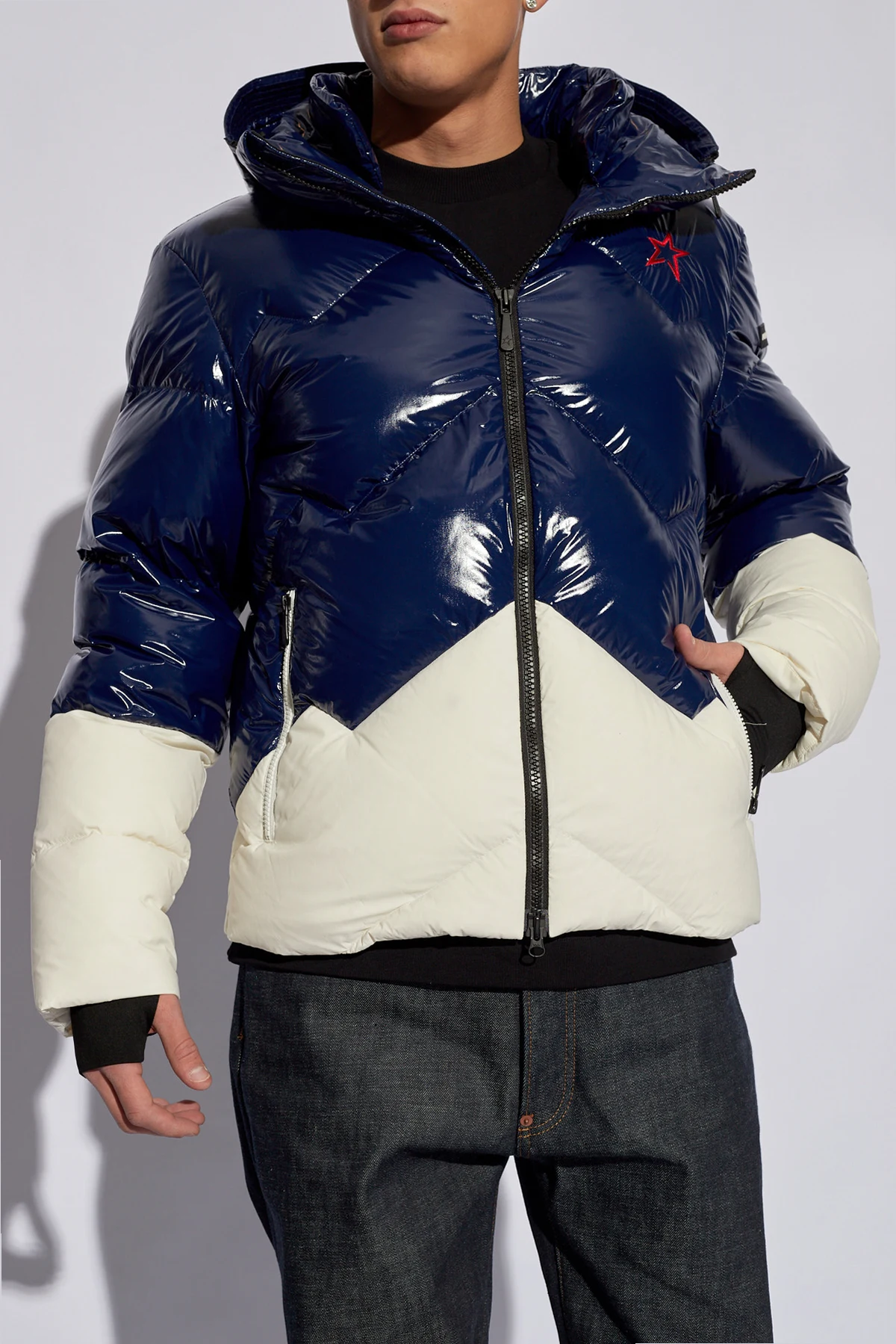 Granatowo-biała kurtka narciarska, model ‘Airview’ Perfect Moment. Luźny krój. Zapinana na dwubiegunowy zamek. Ozdobiona logo. Odpinany kaptur ściągany trokami. Z przodu dwie kieszenie zapinane na zamek. Długie rękawy zakończone ściągaczem z wycięciem na kciuk. Wewnątrz na kieszeń na gogle narciarskie i ściereczka do czyszczenia. Puchowe wypełnienie.