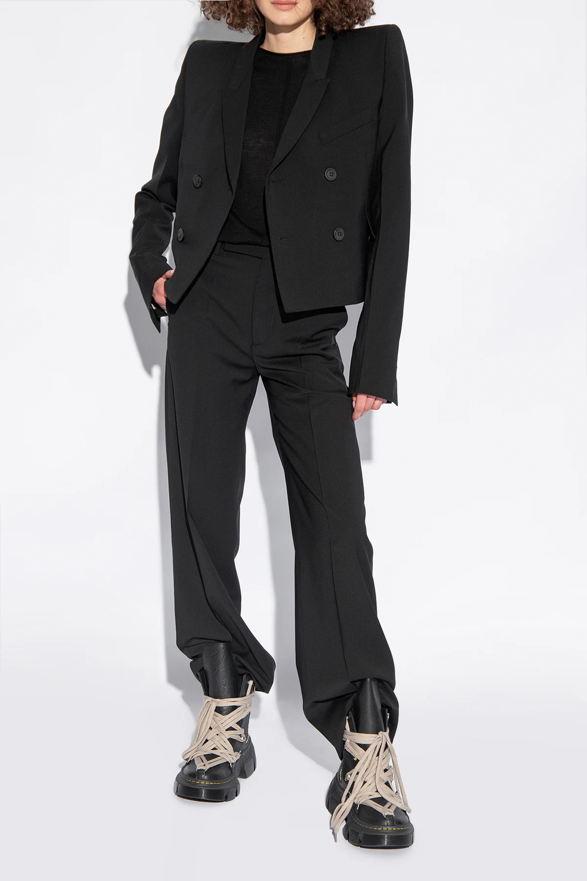 Czarno-beżowe, sznurowane buty za kostkę DRKSHDW Rick Owens x Dr. Martens. Wykonane ze skóry. Z boku zapięcie na zamek. Posiada okrągły nosek. Z tyłu markowy zapiętek i czarna, gruba, gumowa podeszwa.