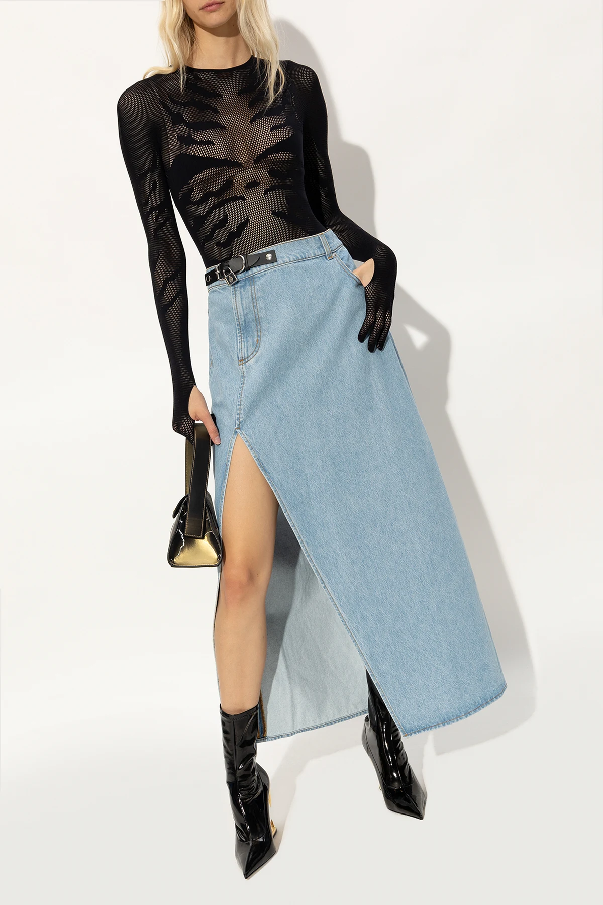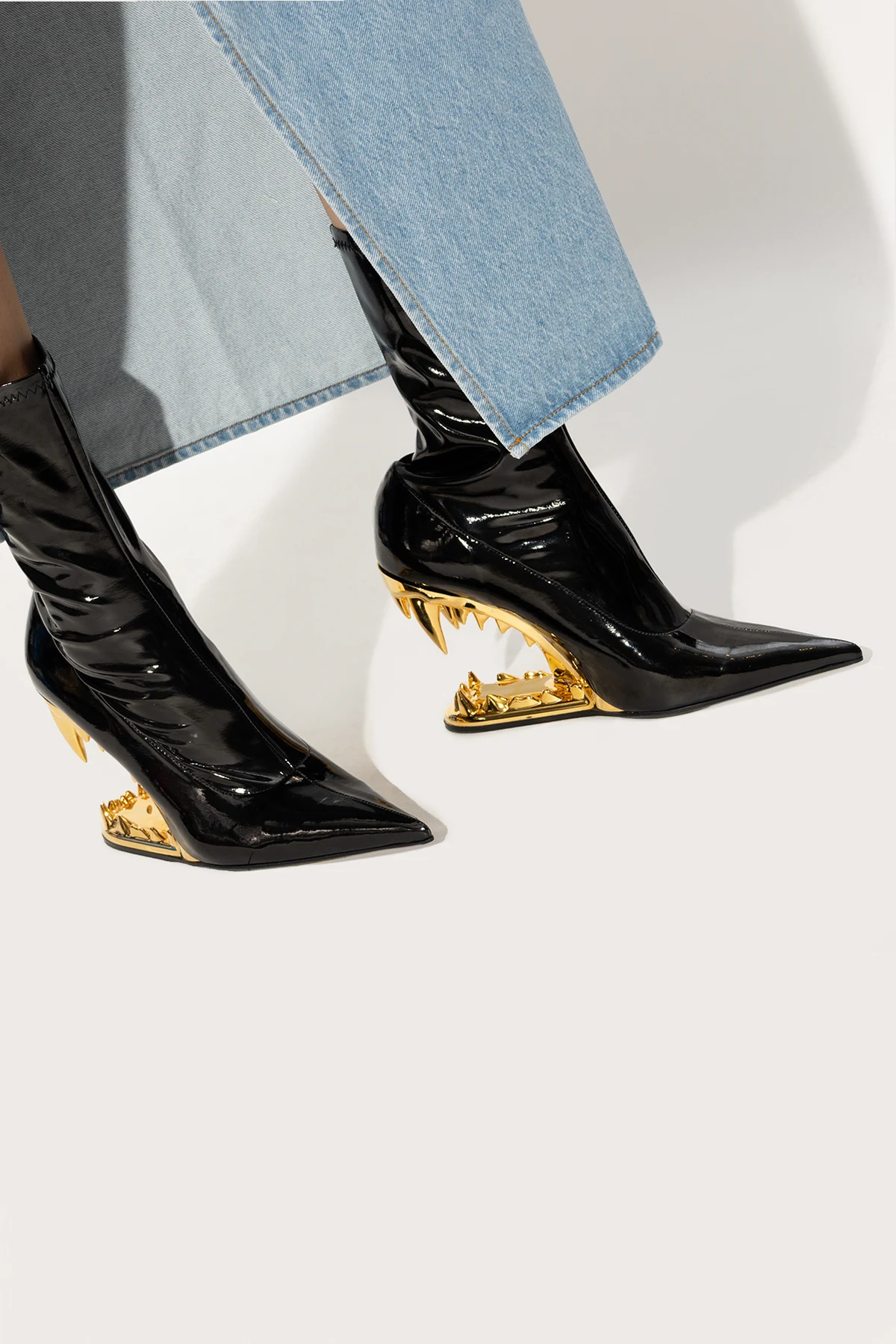 Czarne, wsuwane botki na koturnie, model ‘Morso’ GCDS. Wykonane z winylu. Nosek w szpic. Dekoracyjny koturn z motywem zębów w kolorze złotym. Czarna, skórzana podeszwa.