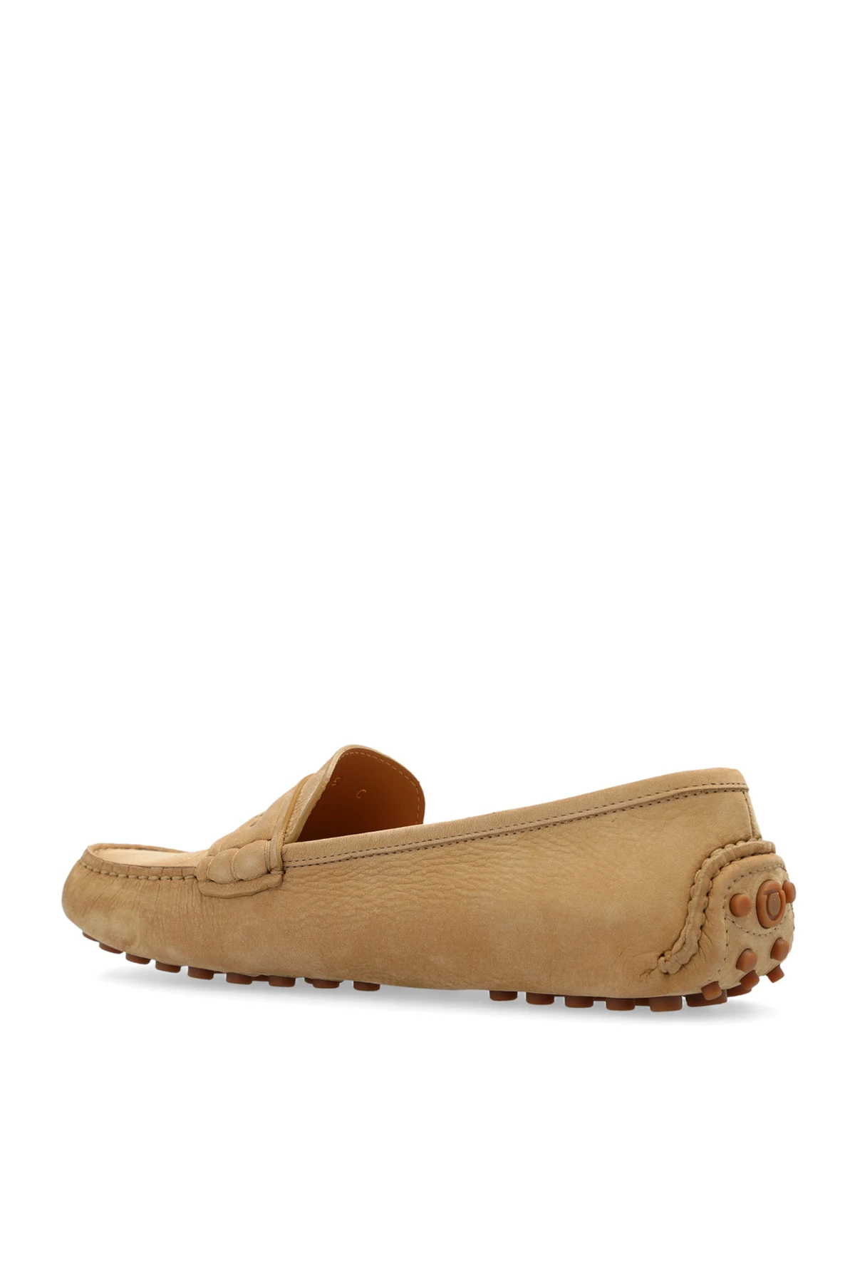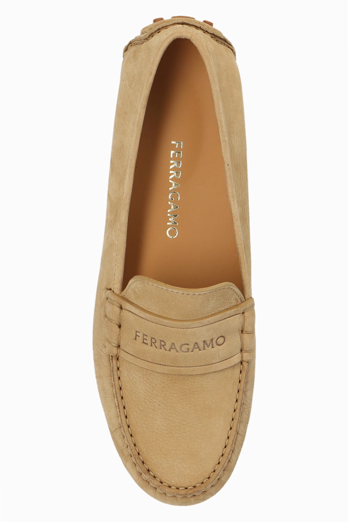 Beżowe mokasyny, model ‘Iside’ FERRAGAMO. Wykonane z zamszu cielęcego. Z przodu ozdobione logo. Brązowa gumowa podeszwa. Wkładka typu ‘standard’.