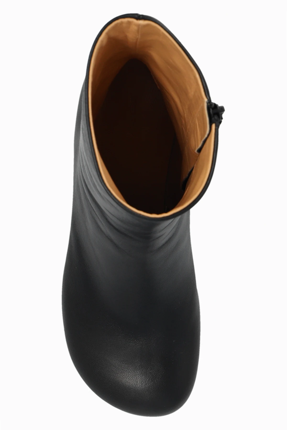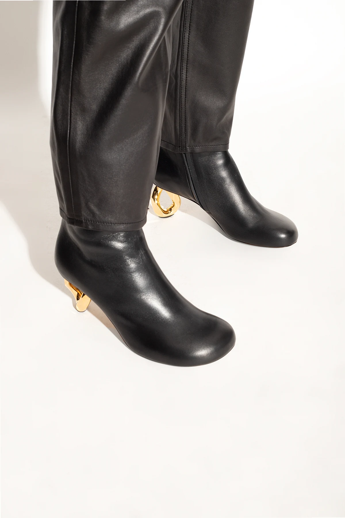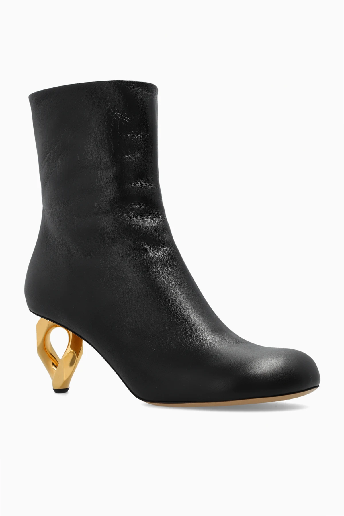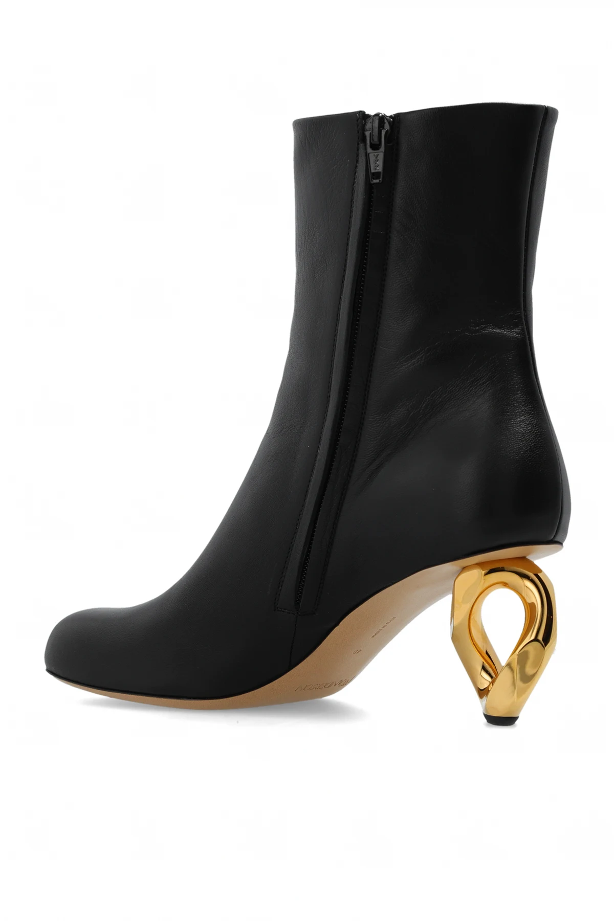 Czarne botki na obcasie JW Anderson. Wykonane ze skóry. Z boku zapinane na zamek. Zaokrąglony, ścięty nosek. Dekoracyjny obcas w kształcie ogniwa łańcucha w kolorze złotym. Beżowa, skórzana podeszwa.