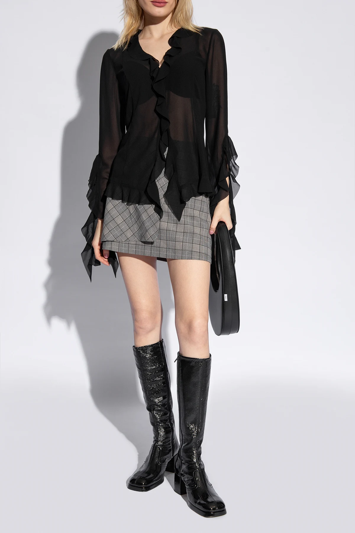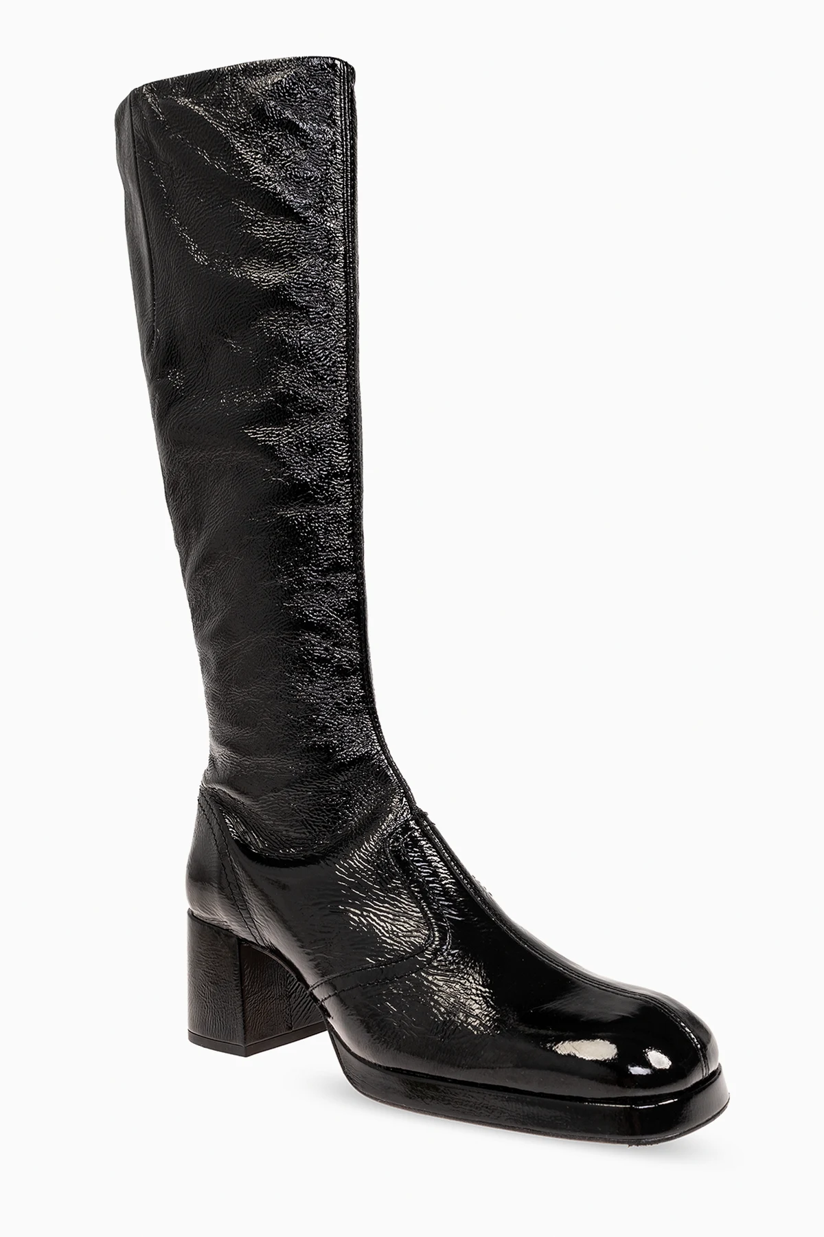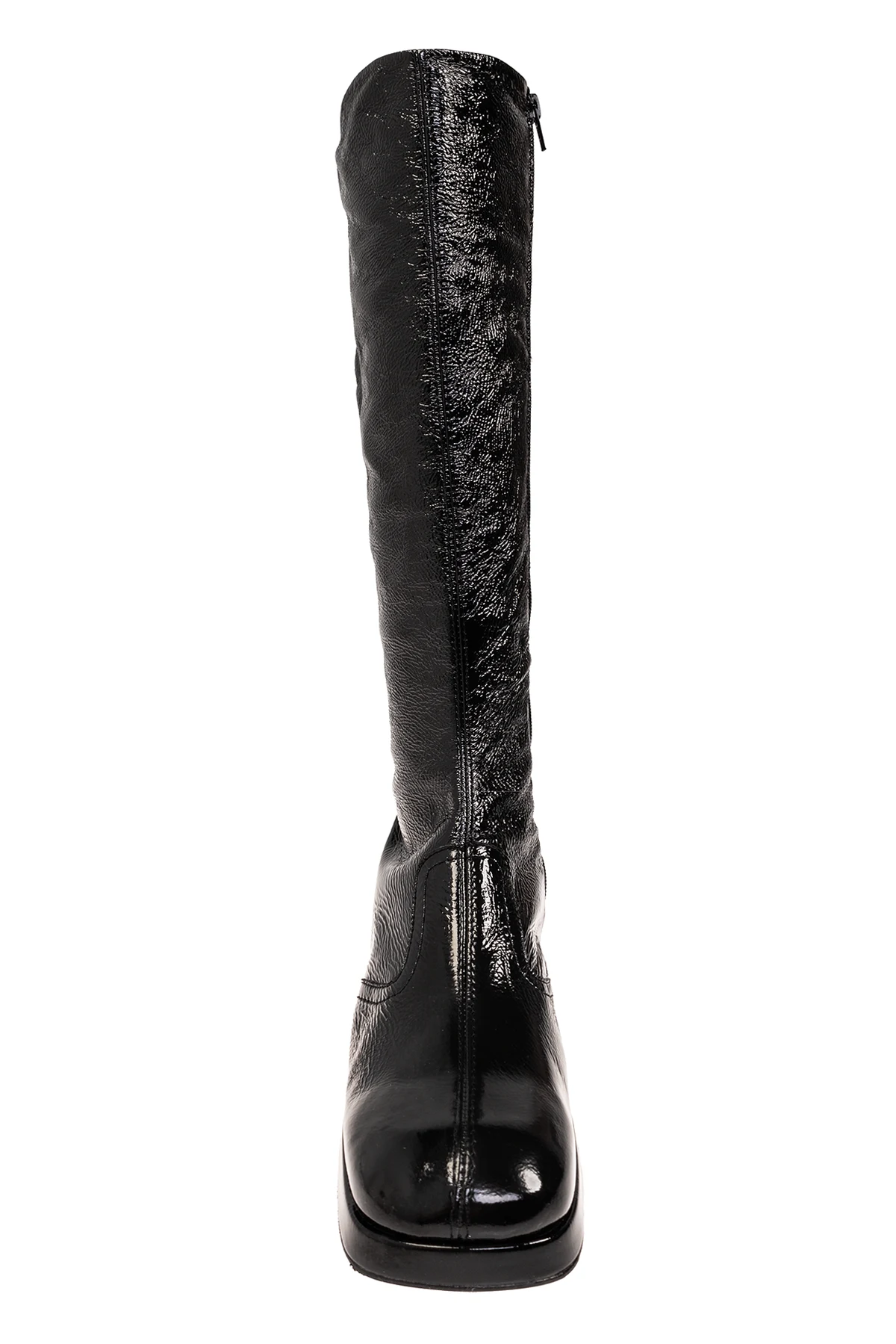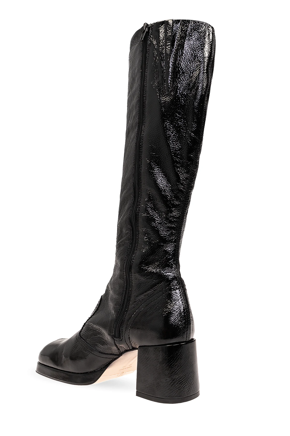 Czarne kozaki, model ‘Donna’ Miista. Wykonane z czarnej, lakierowanej skóry z marszczonym wykończeniem. Z boku zapinane na zamek. Kwadratowy nosek z zaokrąglonym wykończeniem. Kremowa, skórzana podeszwa.