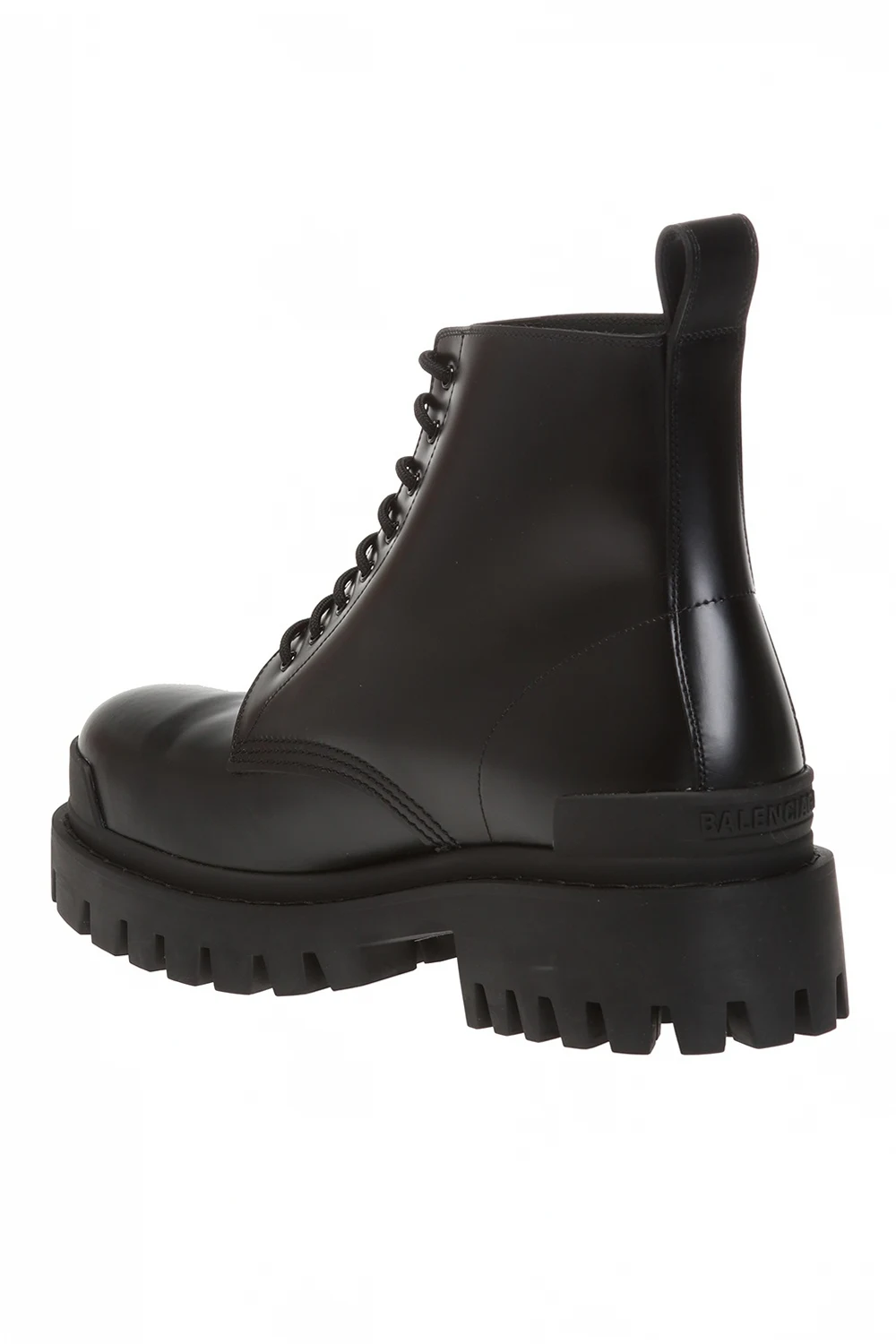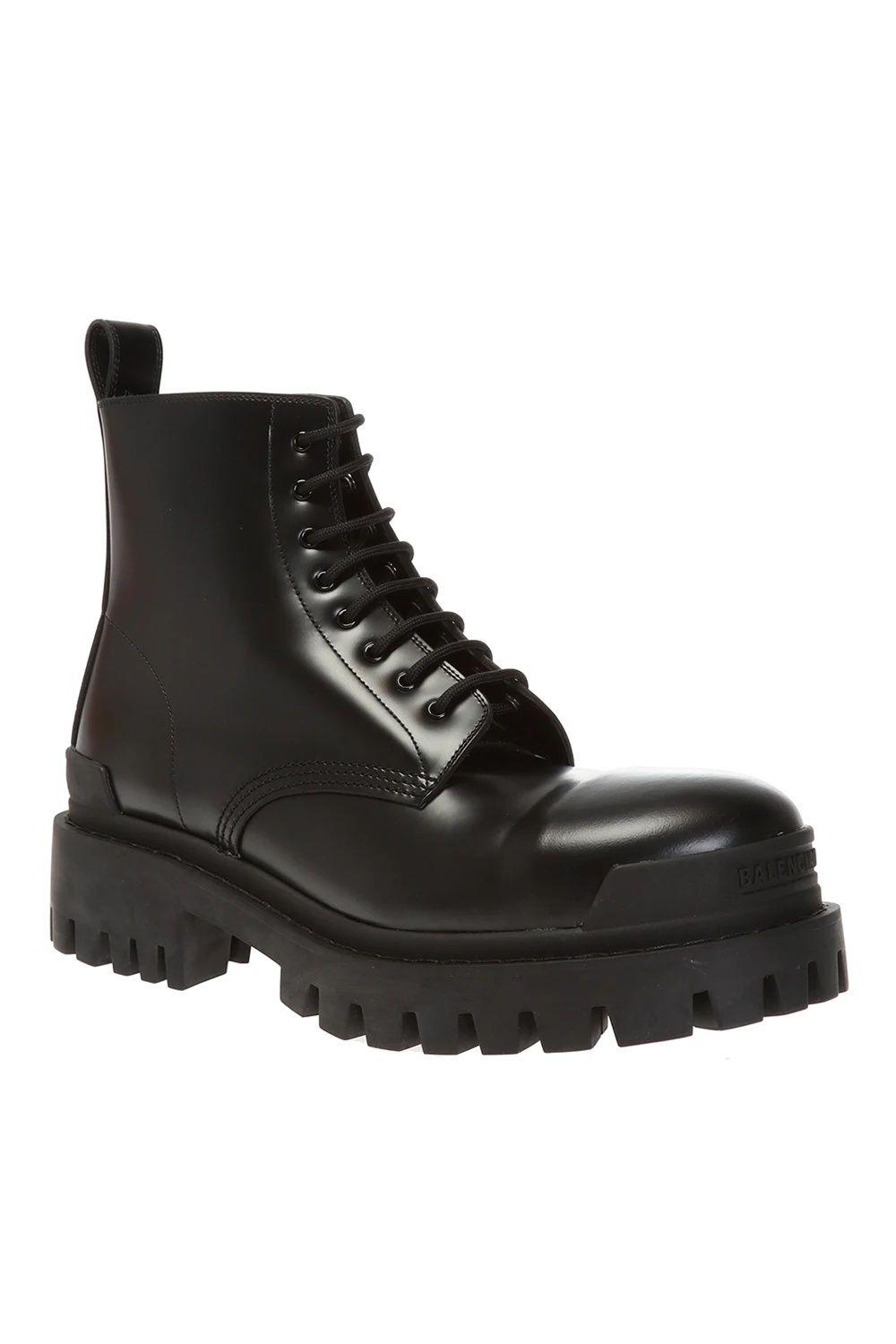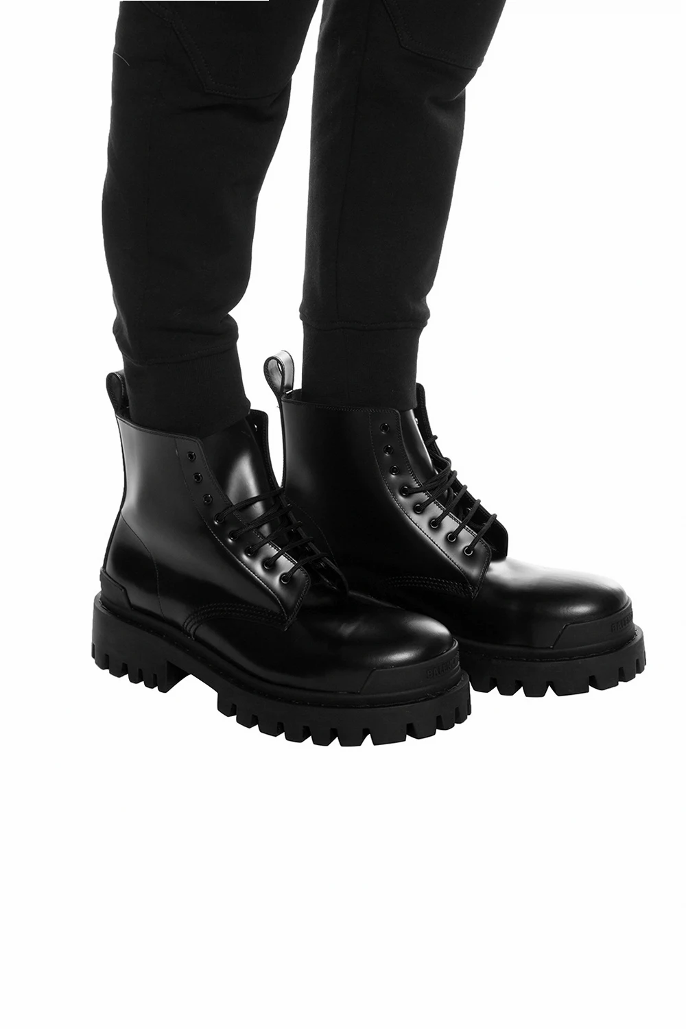 Czarne, skórzane, sznurowane trapery na platformie, model 'Strike' Balenciaga. Czarna, gumowa podeszwa.
