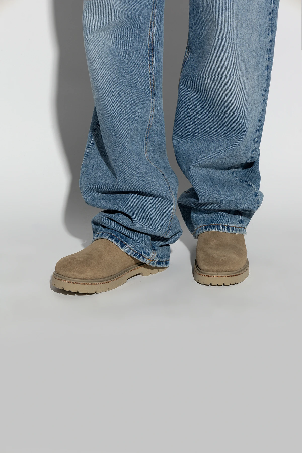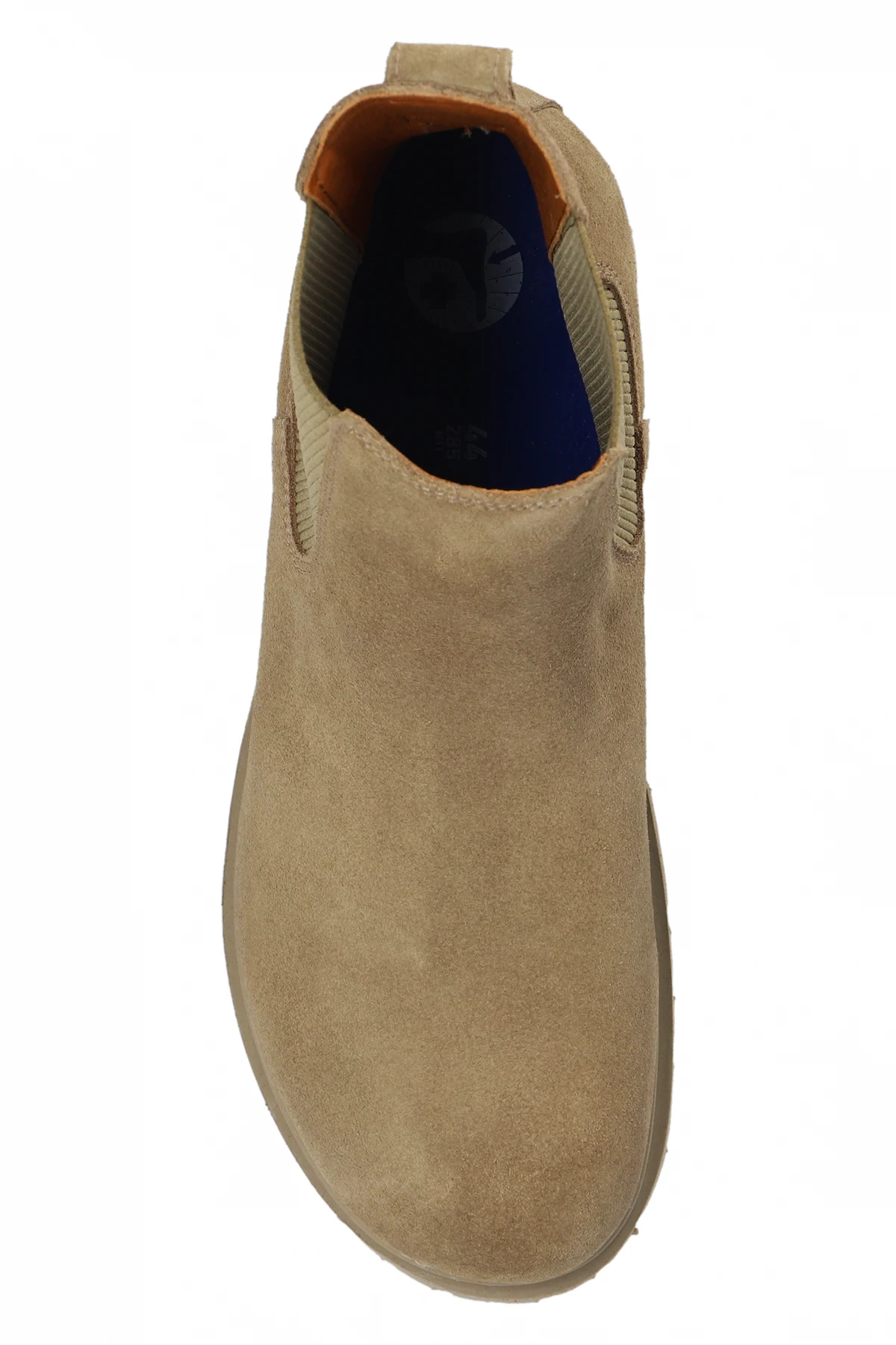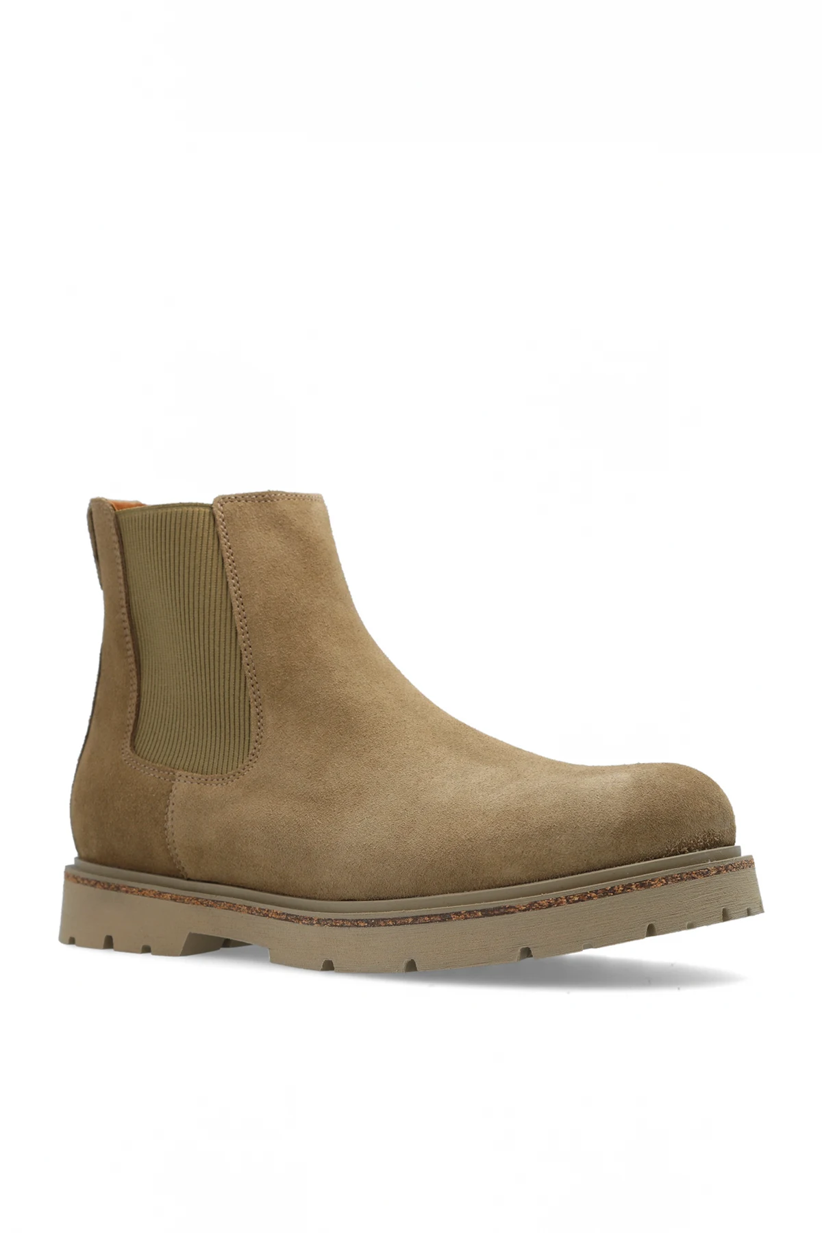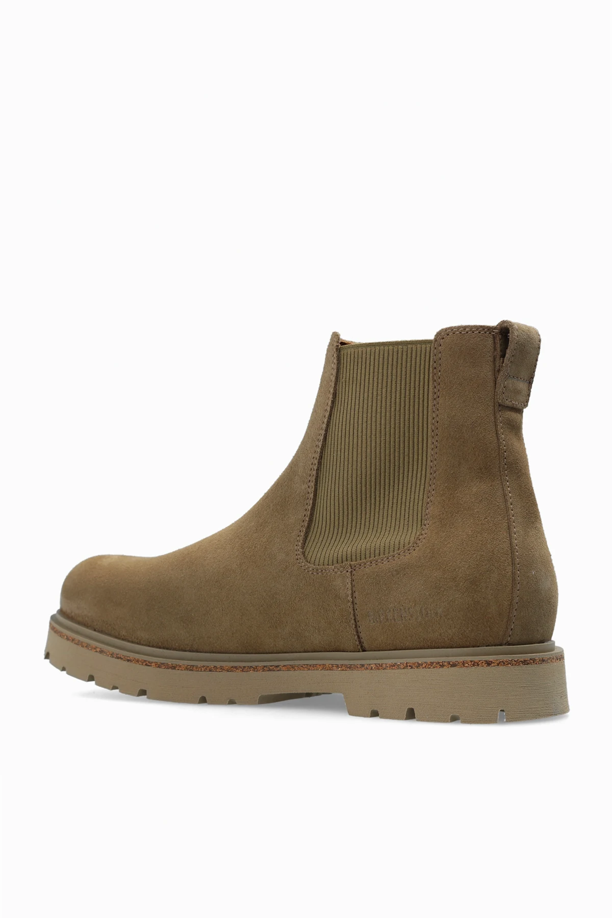 Beżowe sztyblety, model 'Highwood' Birkenstock. Cholewka o regularnej szerokości. Wykonane z zamszu. Po bokach wszyta prążkowana guma. Wytłoczone logo. Wyjmowana, anatomicznie ukształtowana wkładka korkowo-lateksowa. Beżowa, gumowa podeszwa.