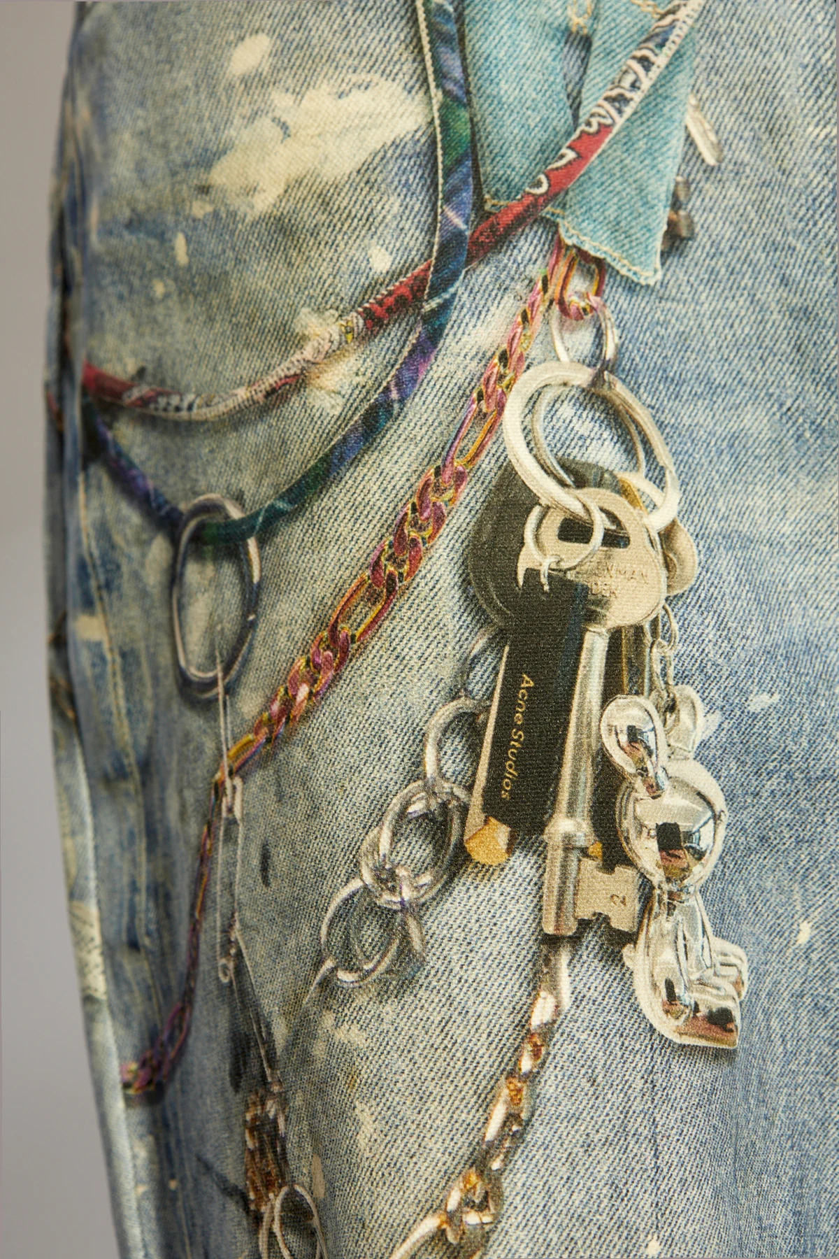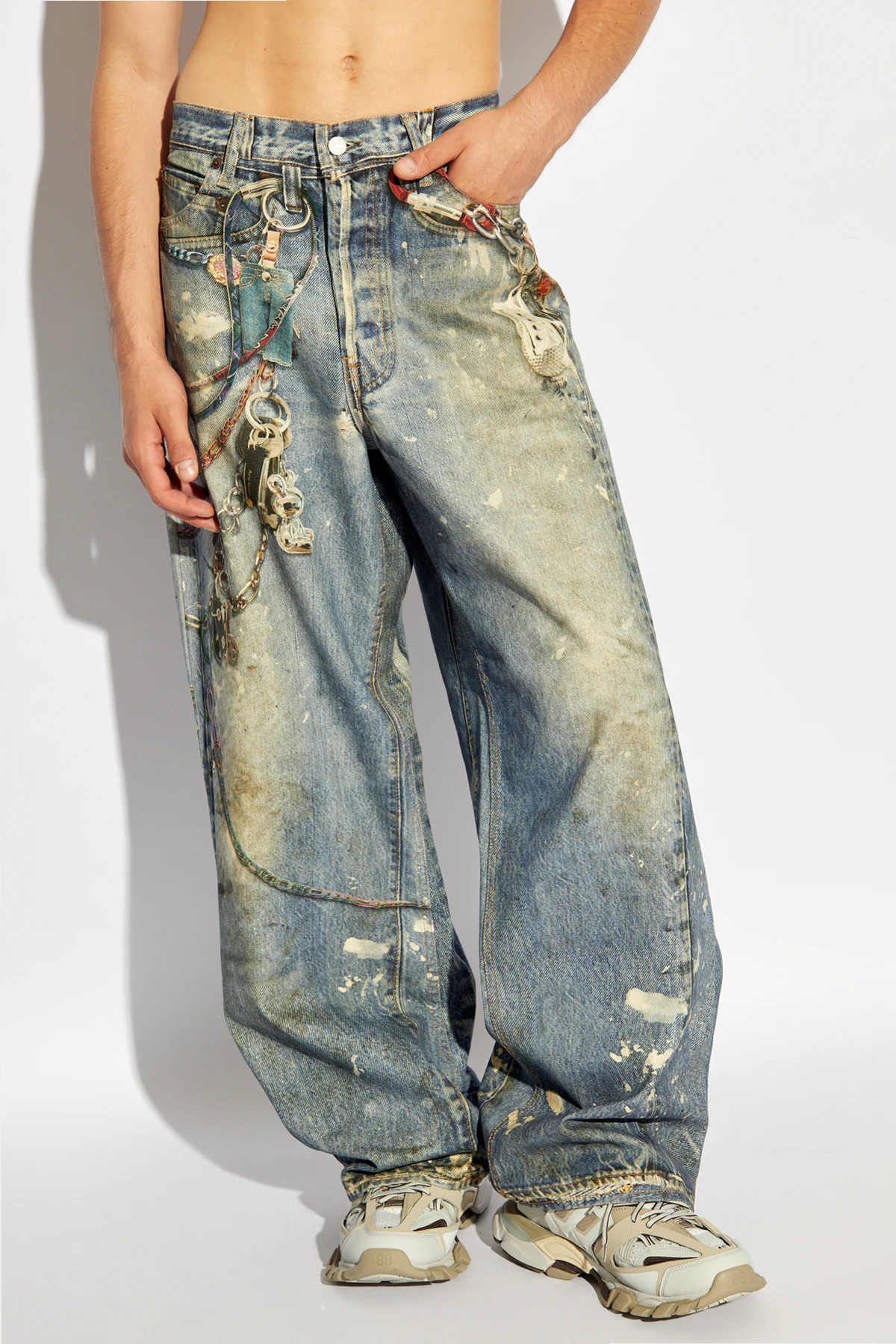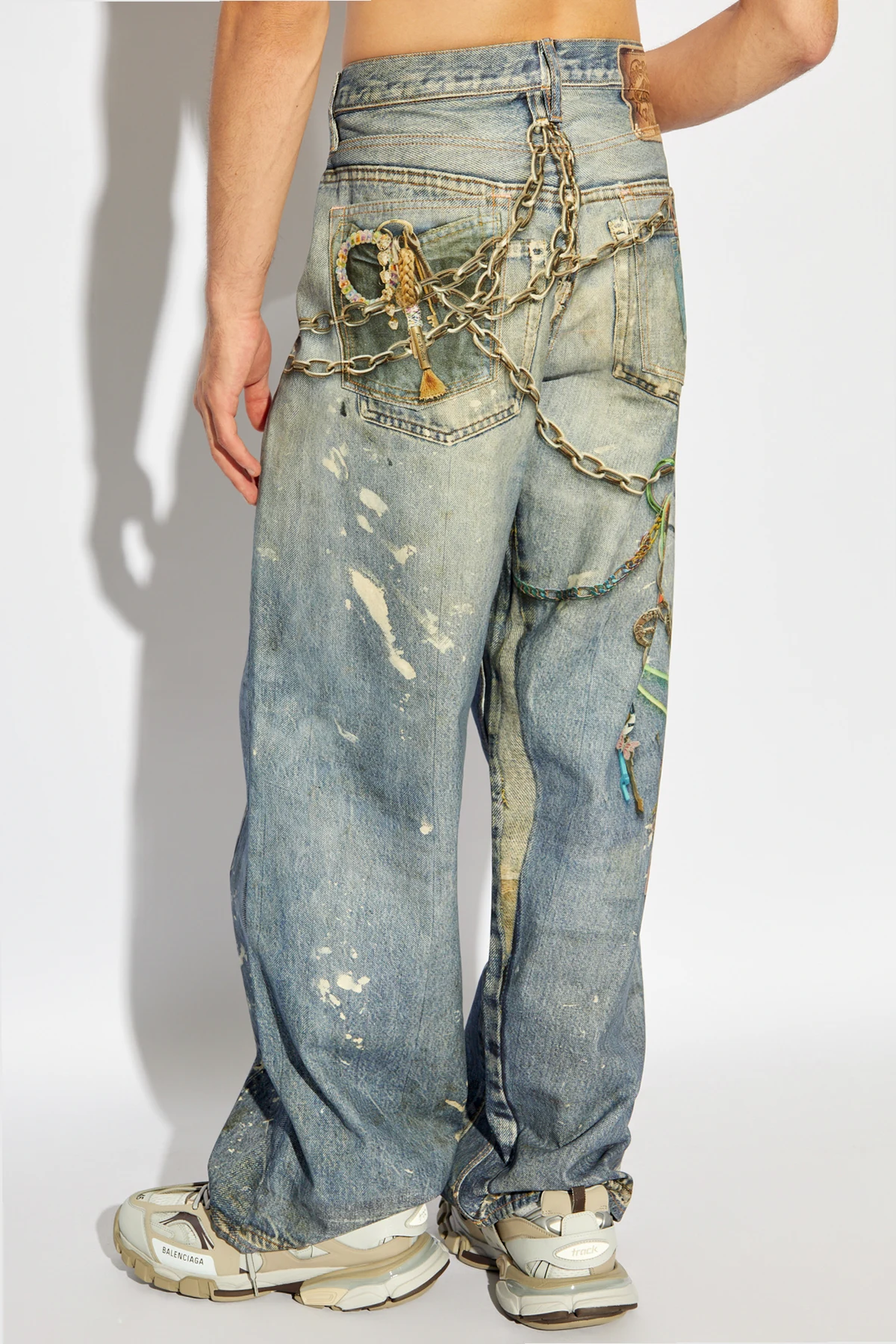Nietuzinkowość tego projektu podkreślają dekadentyzm i detal . Łańcuszki oraz klucze, delikatnie przymocowane przy pasie oraz wzdłuż nogawek, nadają produktowi unikalnego charakteru, łącząc w sobie elementy eklektyzmu. Luźny krój spodni gwarantuje wygodę i swobodę ruchów, a jednocześnie idealnie wpisuje się w aktualne tendencje modowe, które celebrują wolność i nieograniczoną ekspresję osobistą.