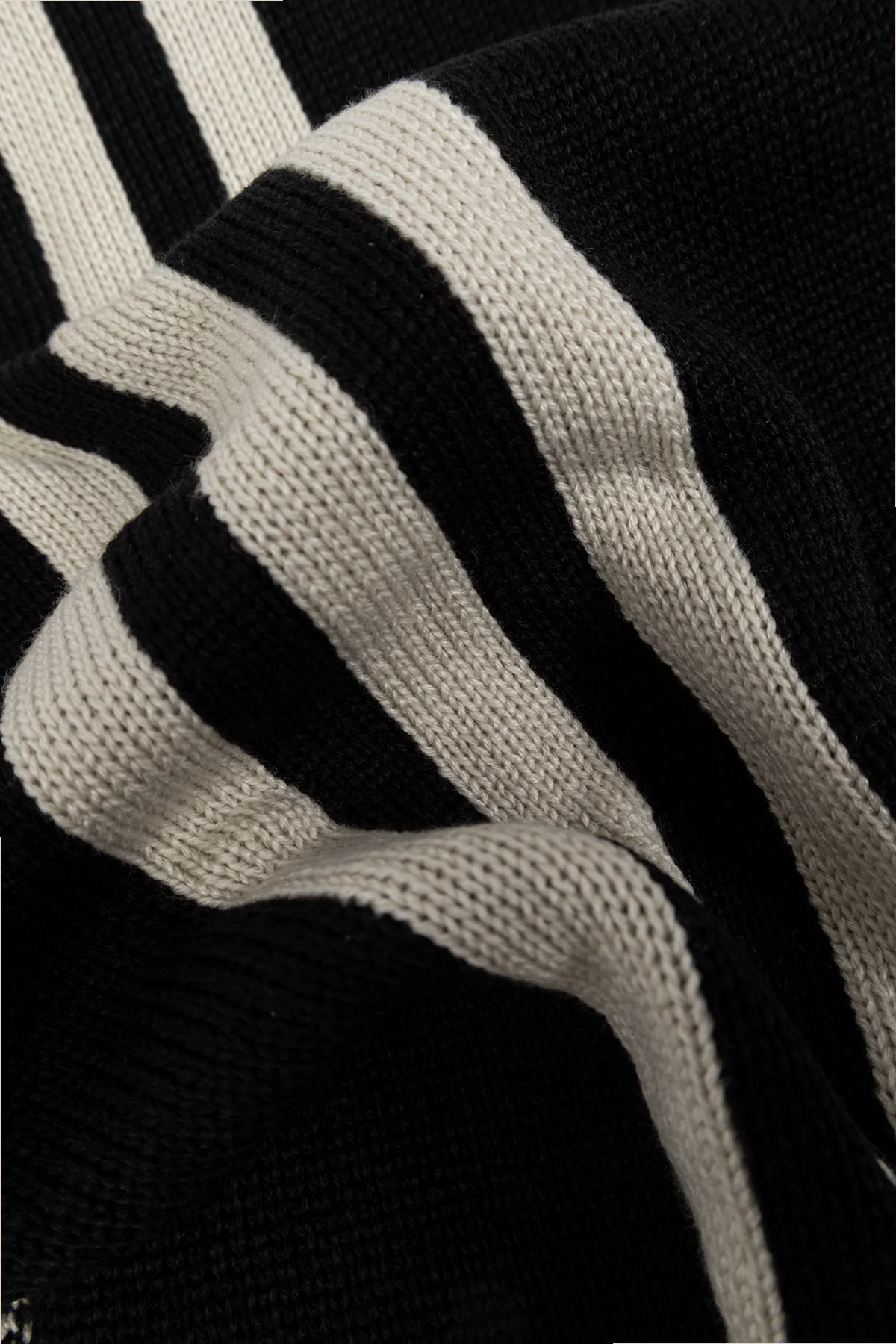 Szal wyróżnia się klasycznym, prostokątnym kształtem oraz dominującym wzorem trzech pionowych pasków w kontrastującym kolorze białym na czarnym tle. Wykonany z wysokiej jakości dzianiny, jest miękki, ciepły i idealny na chłodniejsze dni. Detal w postaci małej naszywki z logo projektanta dodaje mu dodatkowego smaku ekskluzywności.
