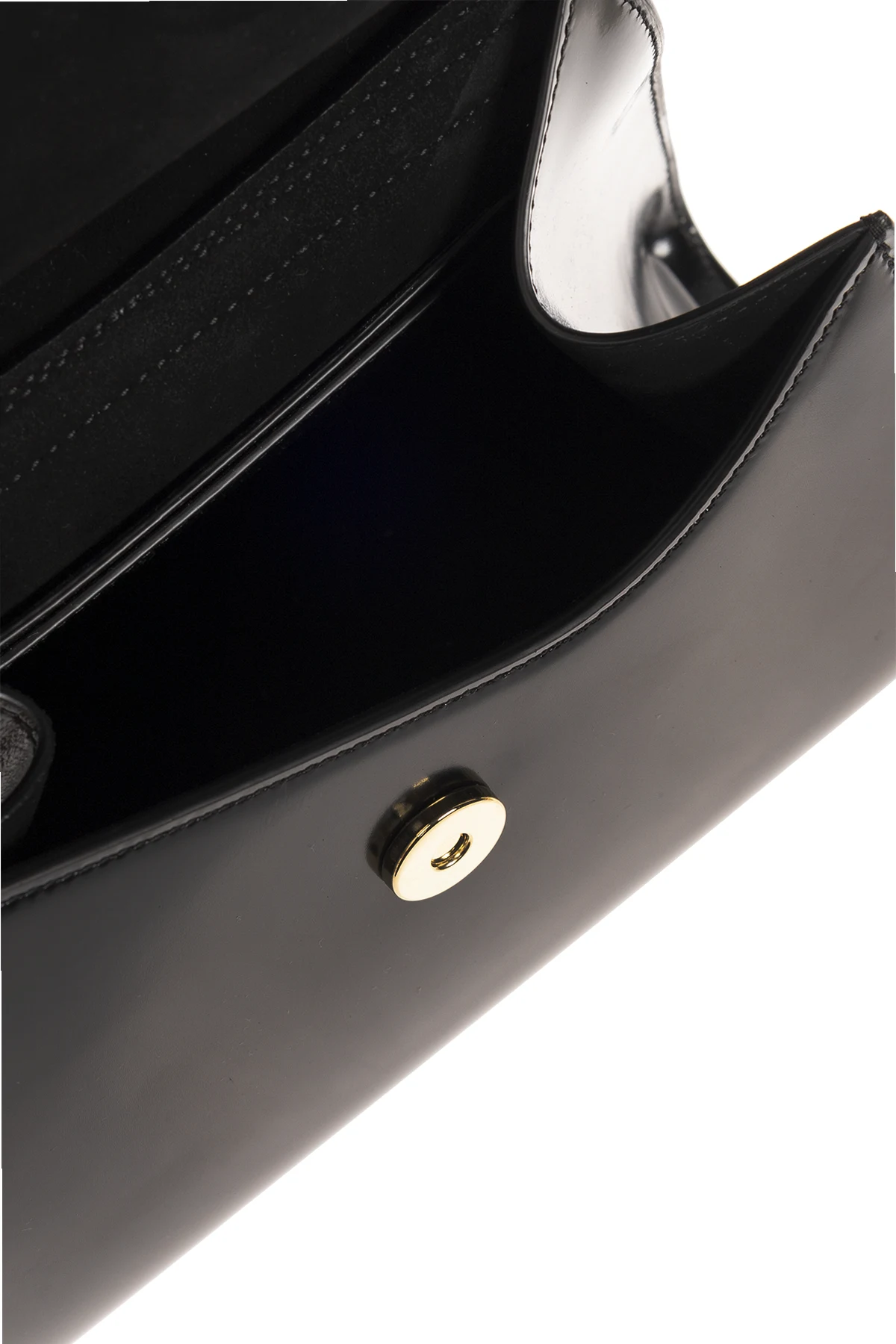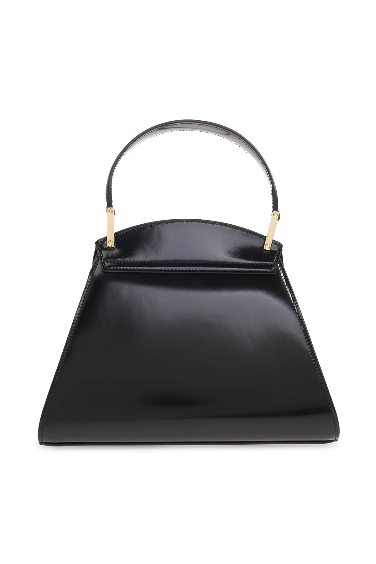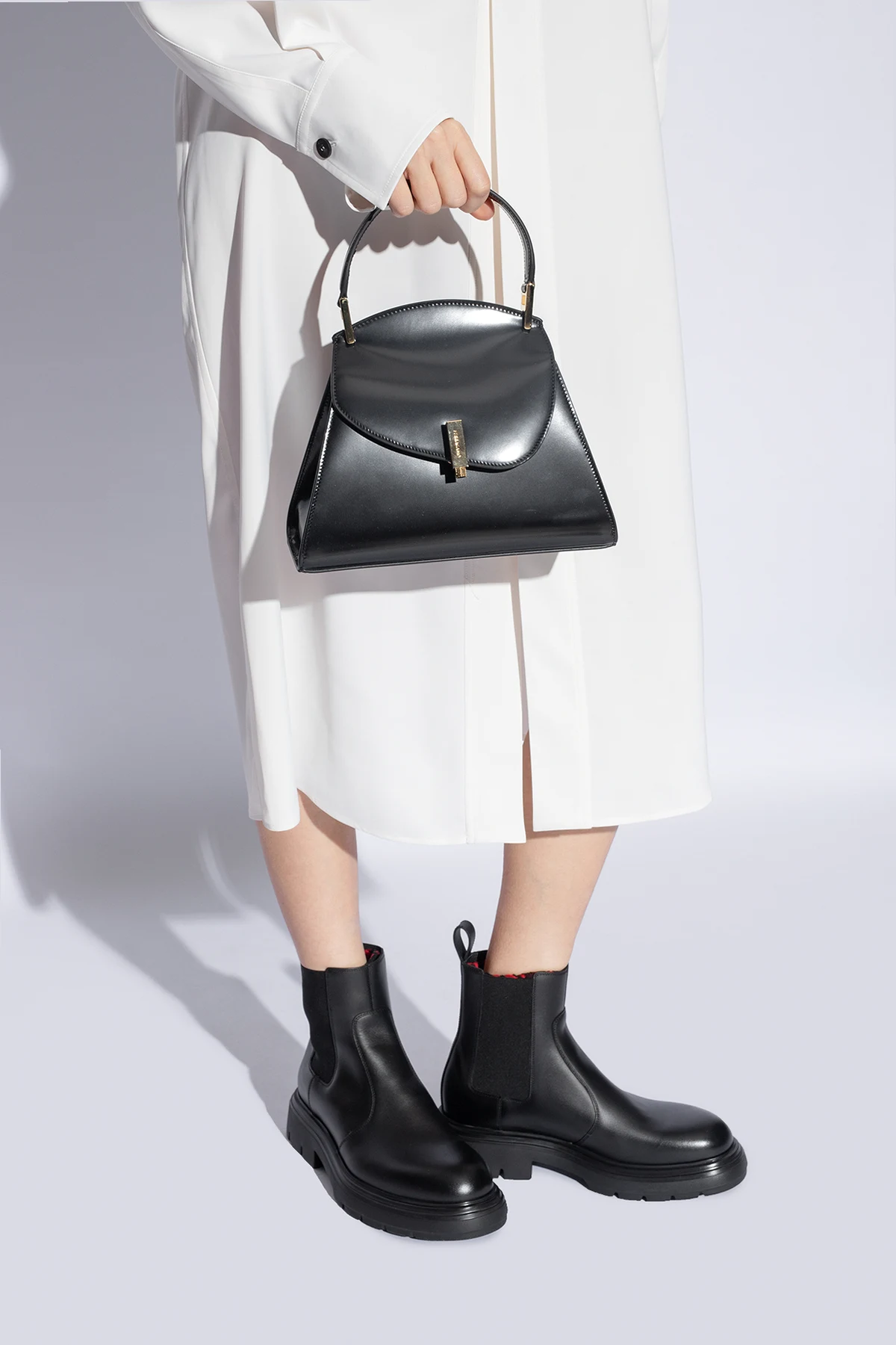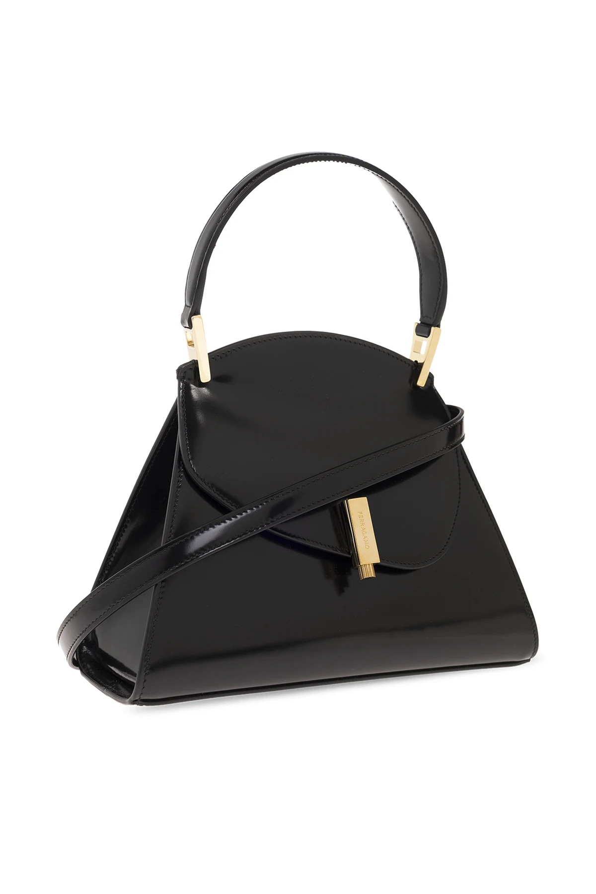 Czarna torba do ręki, model 'Prisma Small' FERRAGAMO. Wykonana ze skóry cielęcej. Magnetyczne zamknięcie z wygrawerowanym logo. Półokrągła rączka. Pas na ramię z możliwością regulacji długości. Wewnątrz komora oraz dwa miejsca aa karty. Metalowe wykończenie w kolorze złotym.