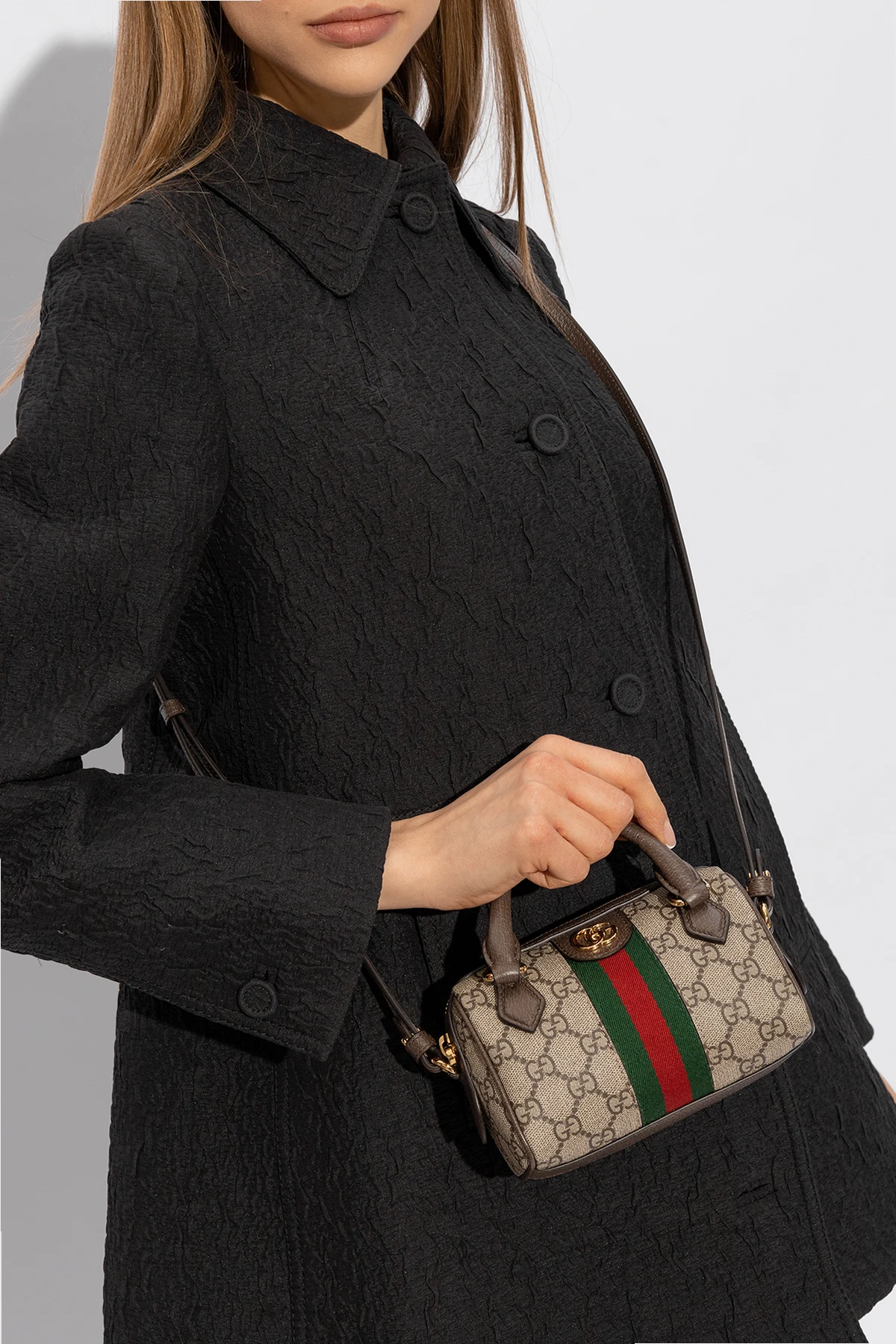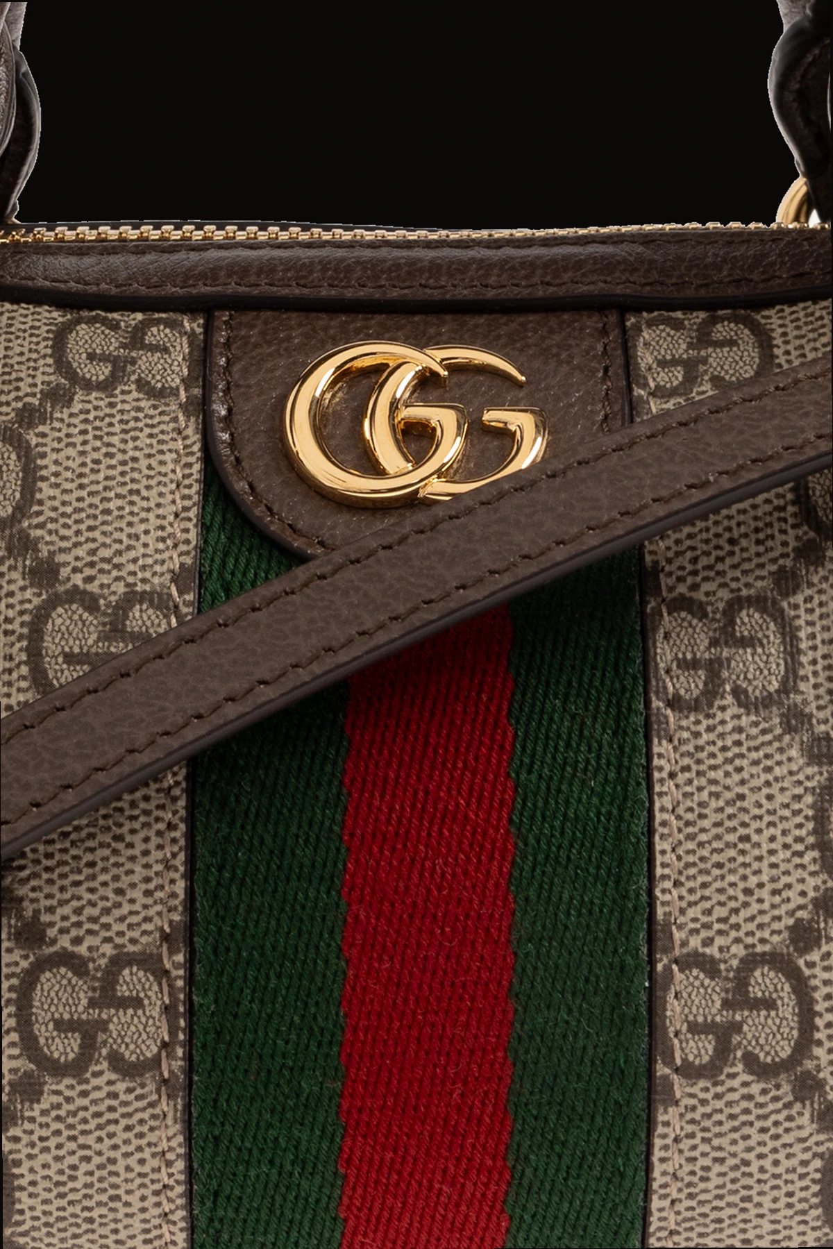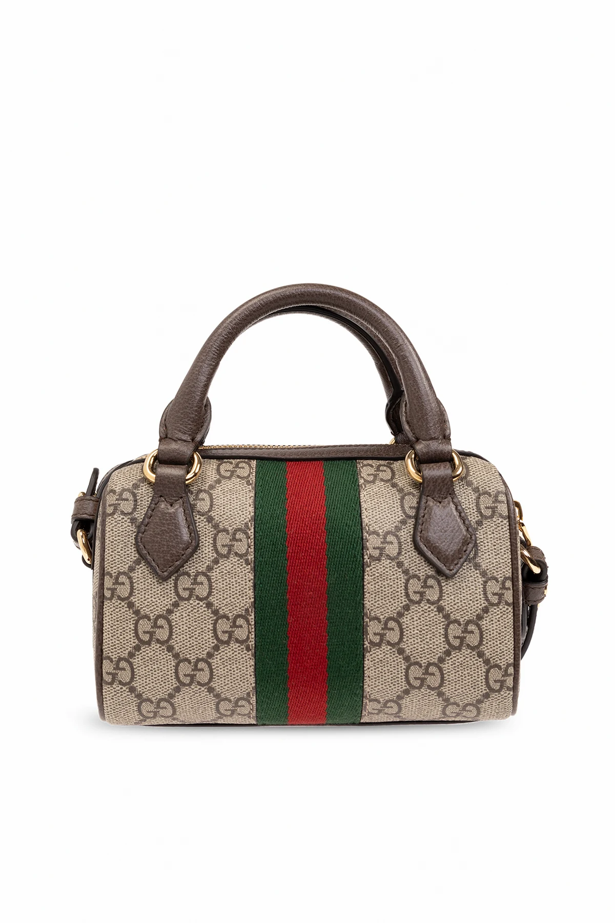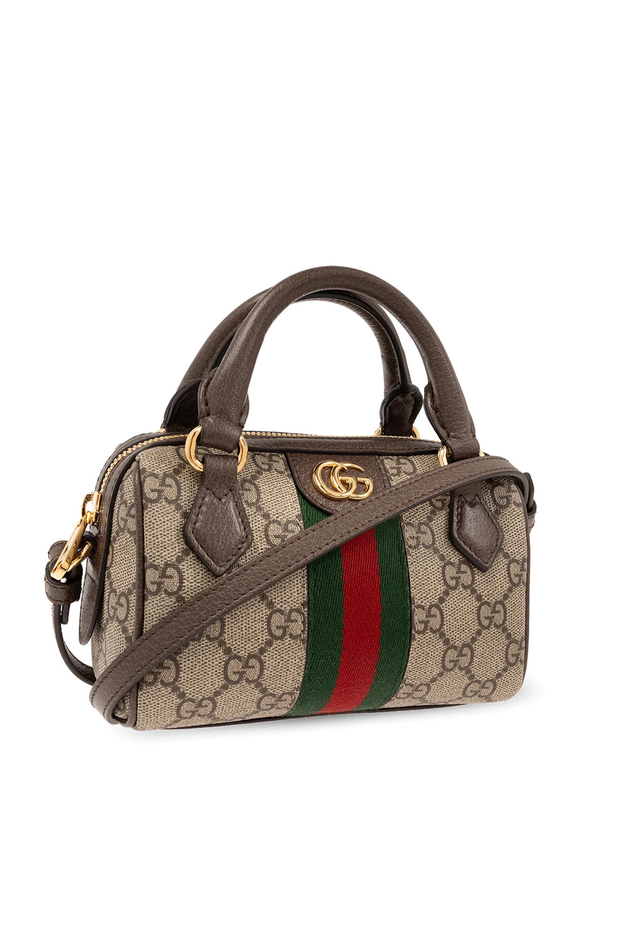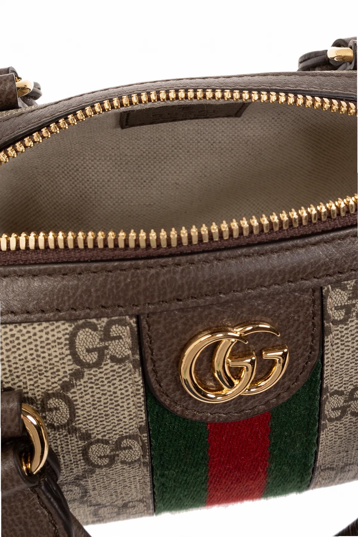 Beżowo-brązowa torba na ramię, model ‘Ophidia Super Mini’ Gucci. Wykonana z charakterystycznego dla marki płótna ‘GG Supreme’ i wykończona skórą cielęcą. Zamykana na zamek. Ozdobiona pasem z motywem ‘Web’ w kolorze zielono-czerwono-zielonym i metalową aplikacją w kształcie logo ‘Double G’. Dwie półokrągłe rączki i odpinany pas na ramię z możliwością regulacji długości. Wewnątrz komora z karabińczykiem na łańcuchu. Metalowe wykończenie w kolorze złotym.