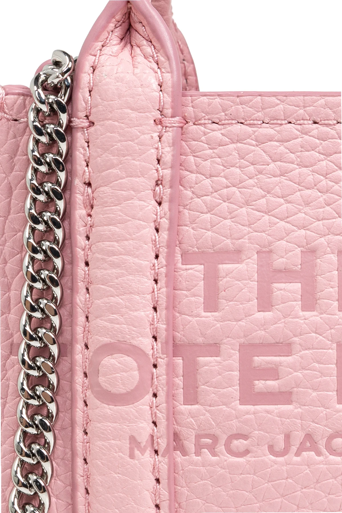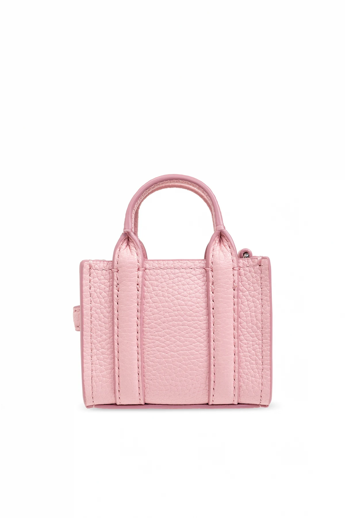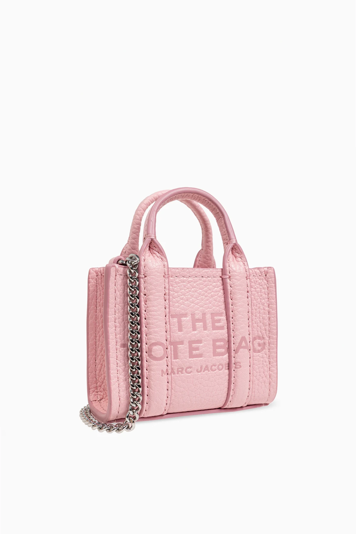 Na przedniej stronie breloka widnieją tłoczone napisy "THE TOTE BAG" oraz "MARC JACOBS", które jednoznacznie wskazują na prestiżową markę. Dwa małe uchwyty, charakterystyczne dla klasycznej mini torebki, oraz pionowe przeszycia po bokach dodają mu struktury i stylu. Produkt wyposażony jest w srebrny łańcuszek, który pełni funkcję zaczepu do kluczy lub innych akcesoriów.