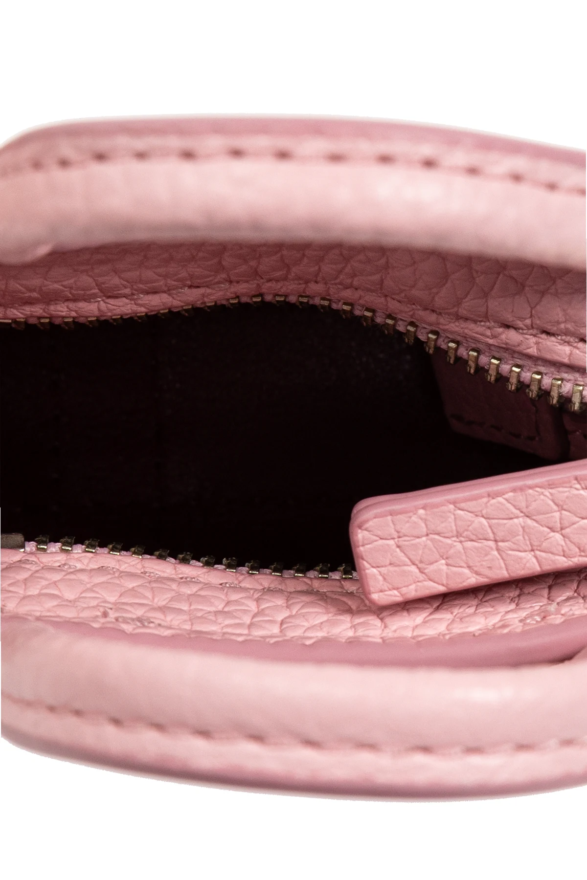 Wnętrze breloka, wykończone ciemnym materiałem, skrywa zamek błyskawiczny, co świadczy o jego funkcjonalności jako małego schowka na drobiazgi. Logo marki Marc Jacobs, wyraźnie widoczne na produkcie, potwierdza jego autentyczność i prestiż.