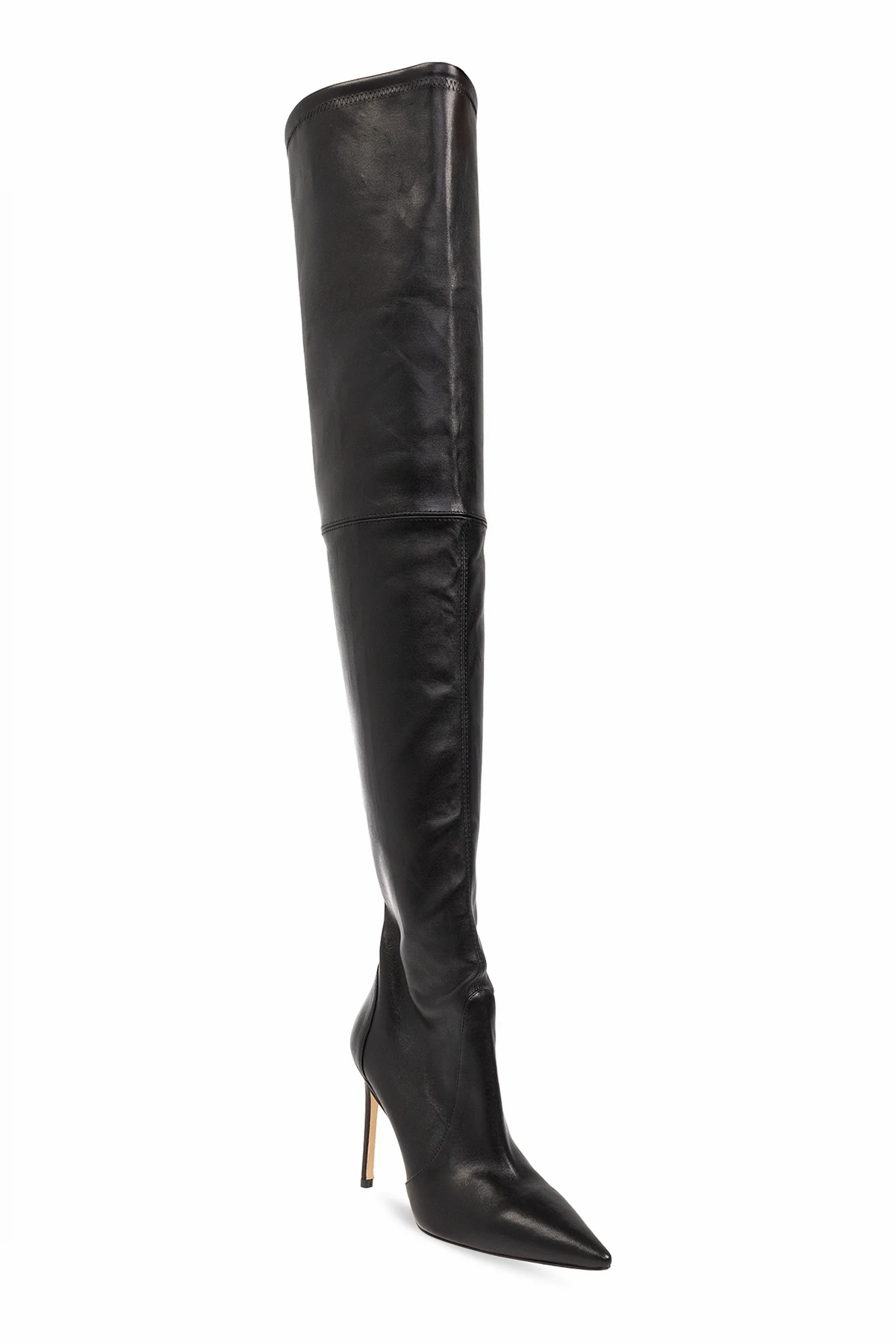 Długie, czarne kozaki na obcasie, model ‘Ultrastuart’ Stuart Weitzman. Wykonane ze skóry. Ozdobione przeszyciami. Nosek w szpic. Podeszwa wykonana ze skóry w kolorze beżowym.