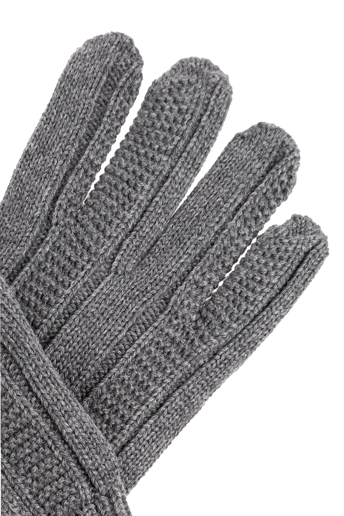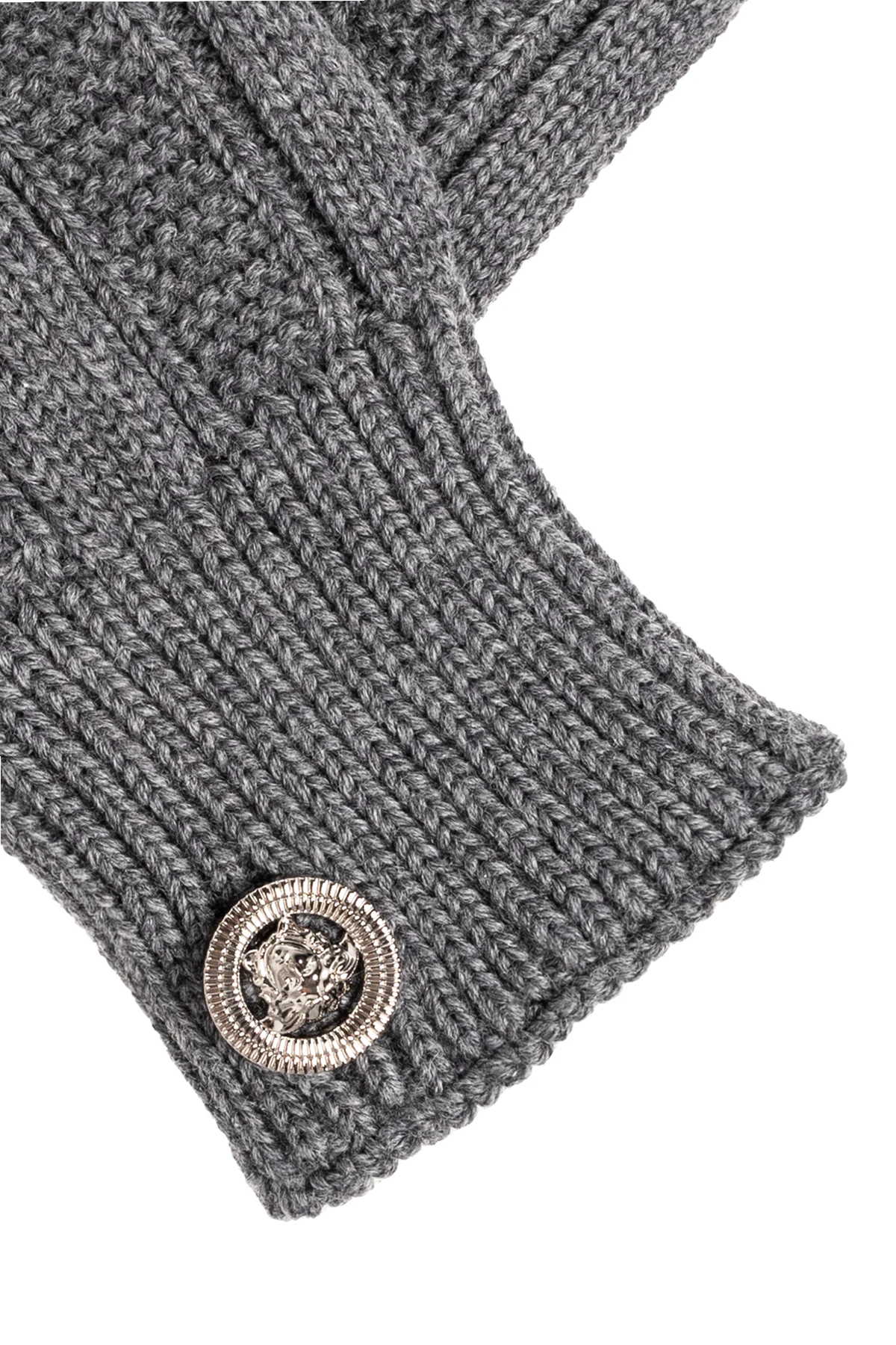 Szare, wełniane rękawiczki o dekoracyjnym splocie Versace. Ozdobione aplikacją w kolorze srebrnym z charakterystyczną głową Meduzy.