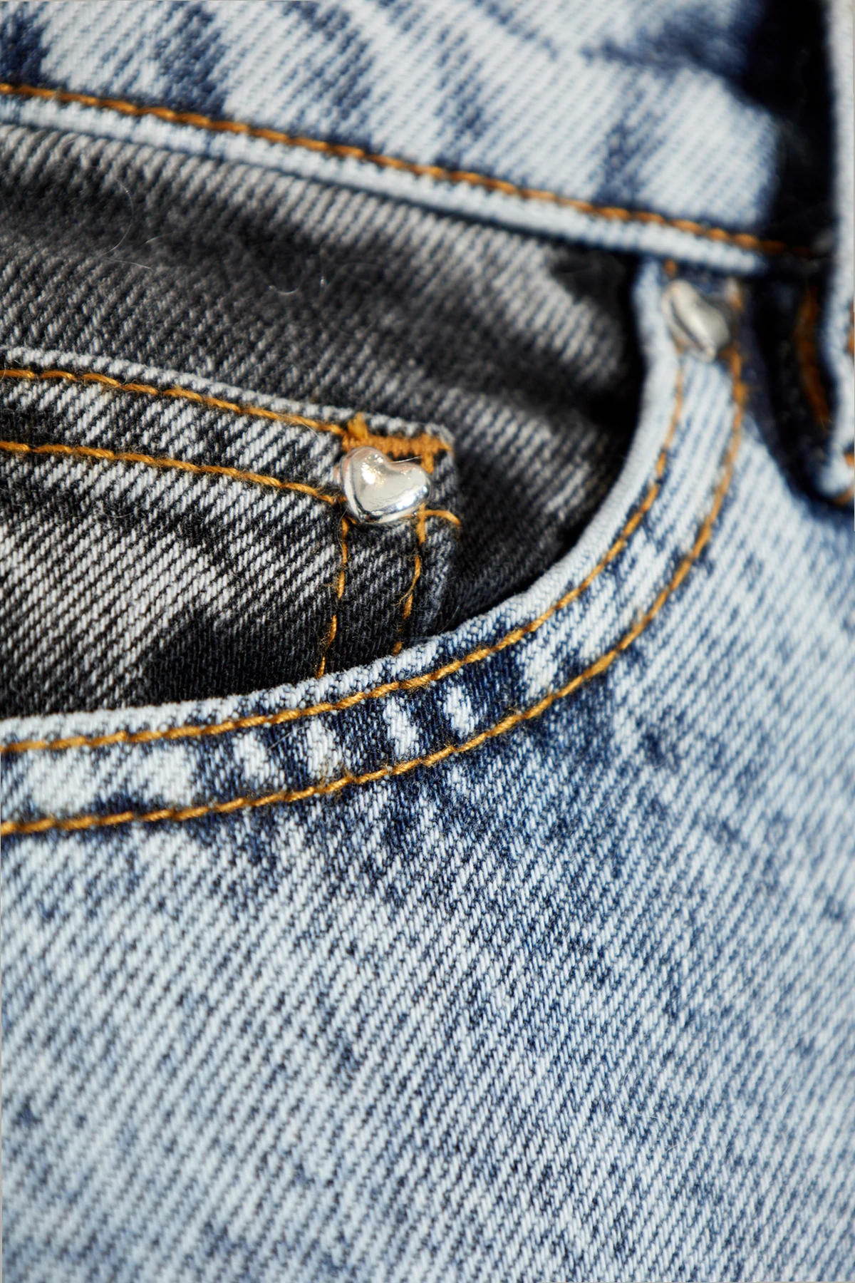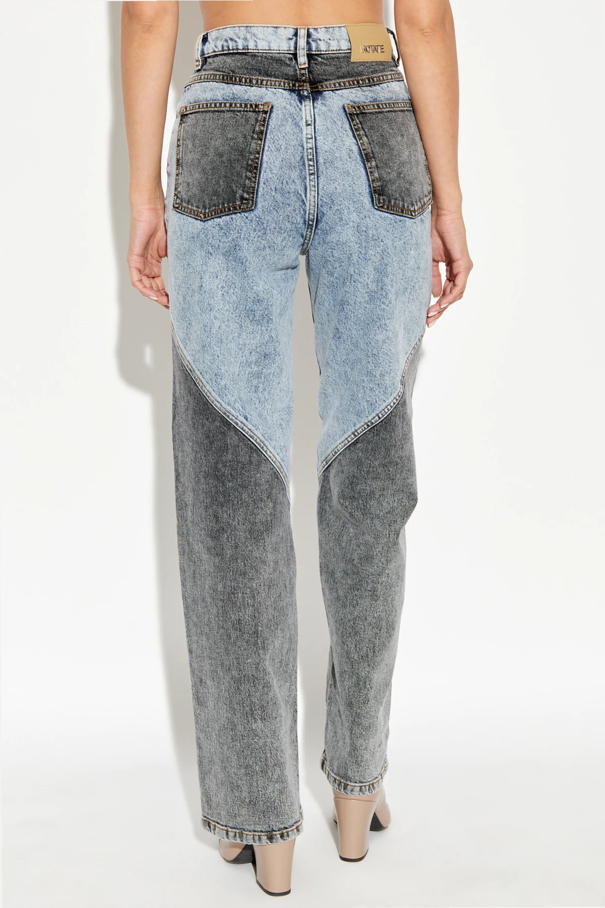 Najbardziej charakterystycznym elementem jest unikalny wzór kolorystyczny. Jeansy składają się z dwóch odcieni dżinsu – jasnoniebieskiego i ciemnoszarego – tworzących kontrastowe panele. Jasnoniebieski dżins dominuje w górnej części spodni oraz na tylnych kieszeniach, podczas gdy ciemnoszary dżins znajduje się na bocznych panelach nogawek. Na tylnych kieszeniach oraz wewnątrz wykończeń szwów znajdują się nitki w kontrastowym, żółtym kolorze, a na tylnej części pasa – mała naszywka z logo projektanta.