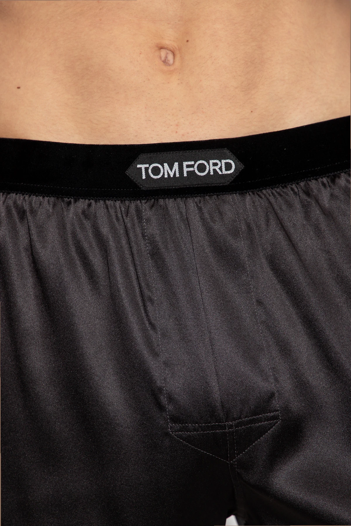 Czarne bokserki Tom Ford. Wykonane z jedwabiu. W pasie wszyta czarna guma z aksamitnym wykończeniem. Z przodu naszywka z logo.