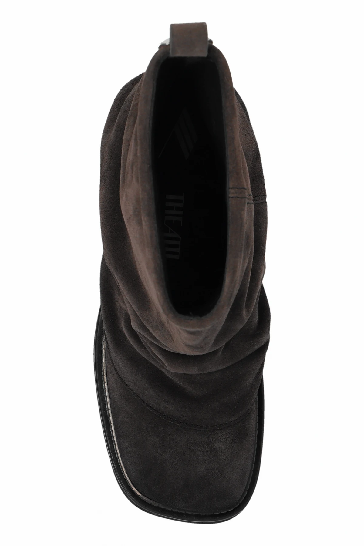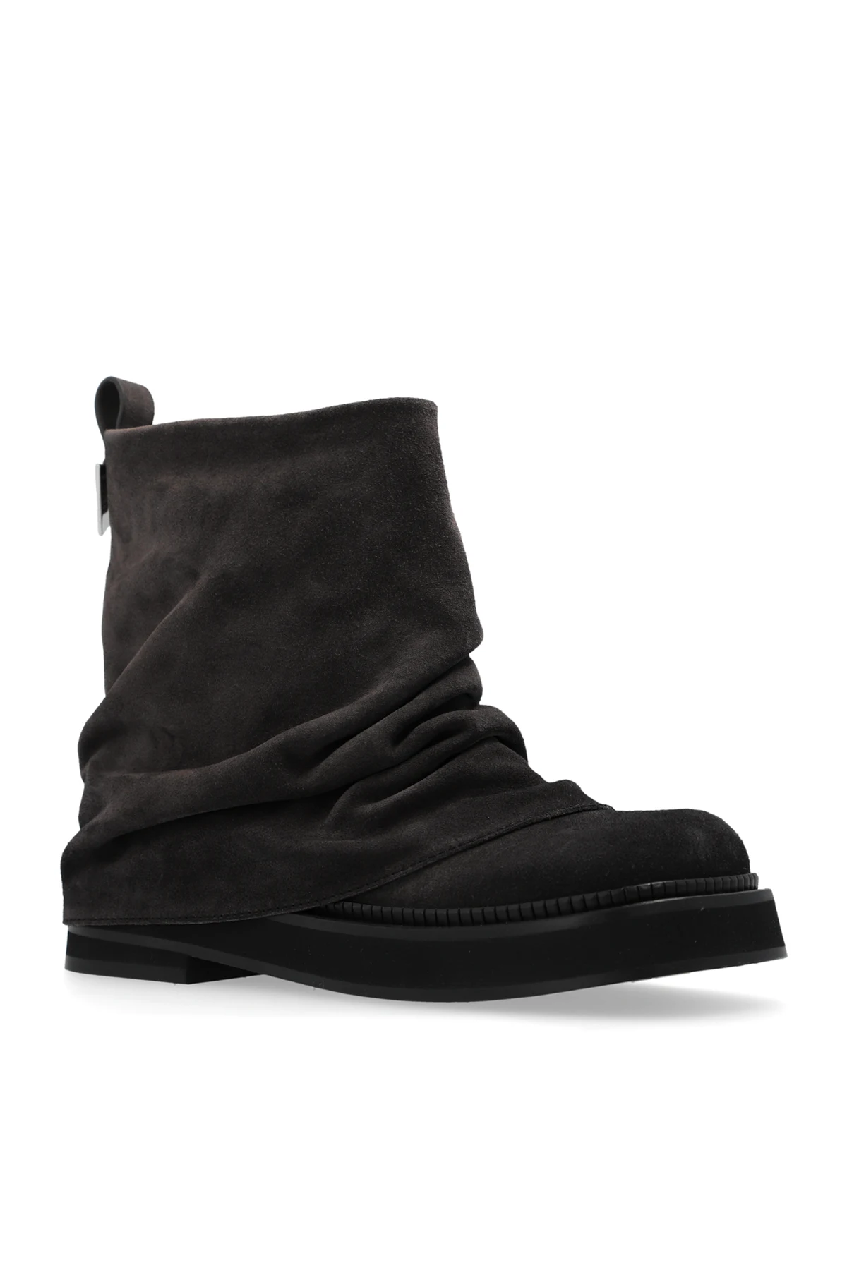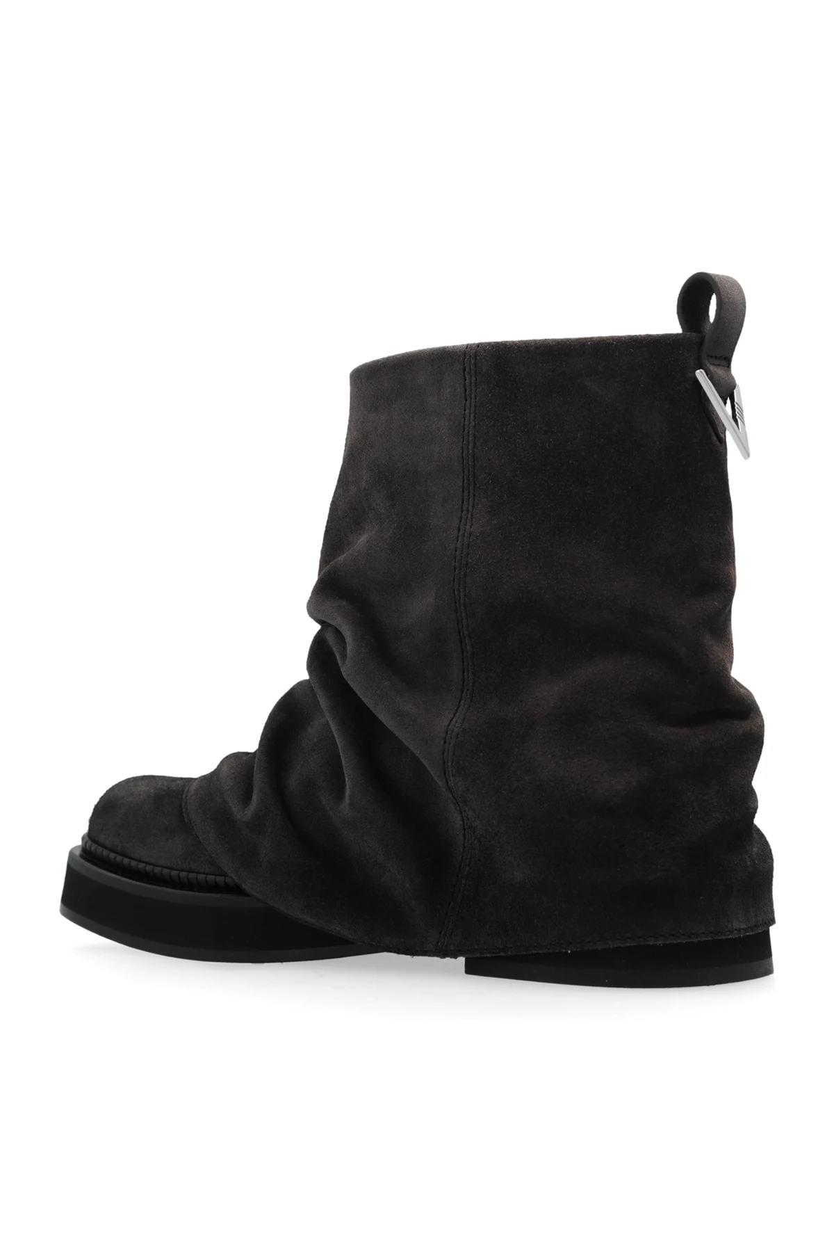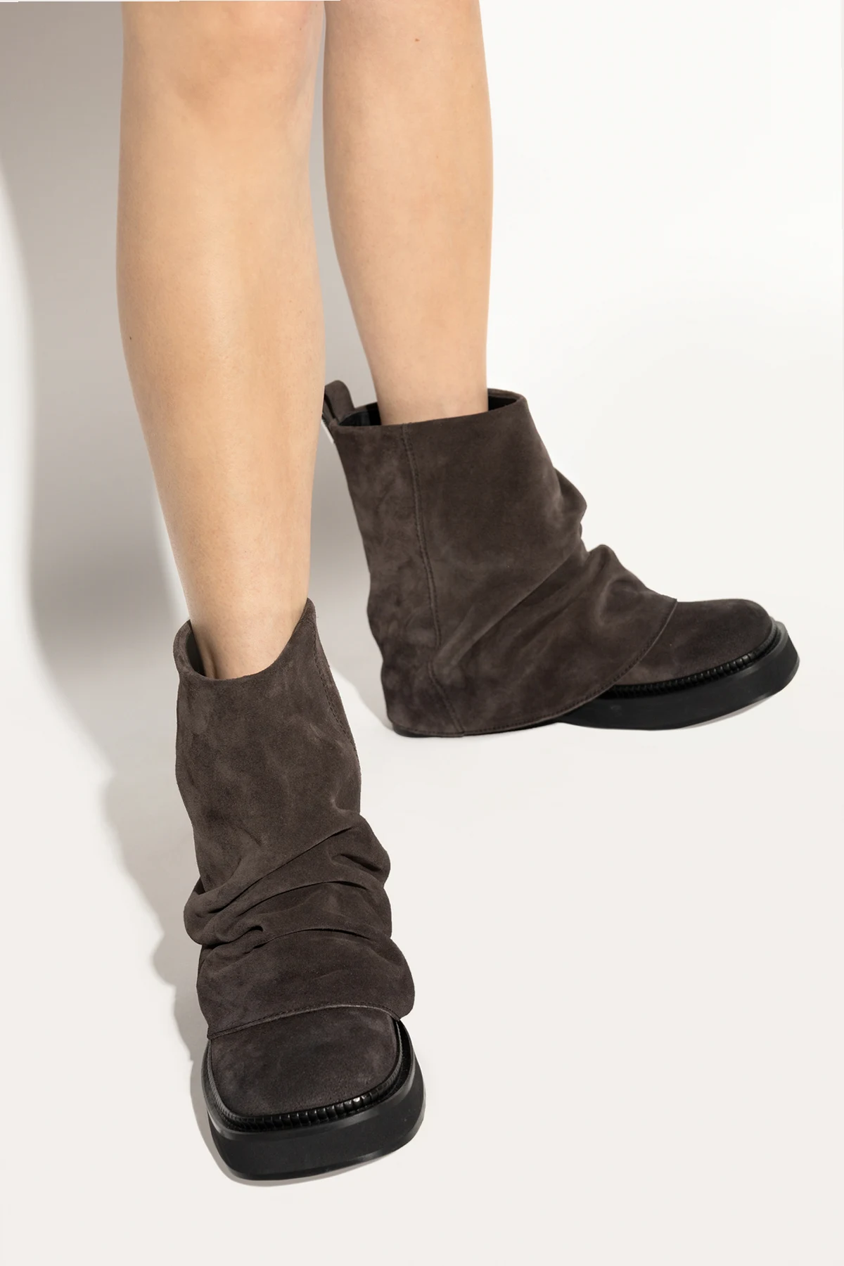 Botki posiadają niski profil, sięgający nieco powyżej kostki, co nadaje im subtelny i swobodny wygląd. Lekko marszczona skóra stanowi główny element dekoracyjny, podkreślając ich unikalny charakter. Jednolite, ciemnobrązowe wykończenie, bez dodatkowych wzorów, sprawia, że są one uniwersalnym dodatkiem do wielu stylizacji.