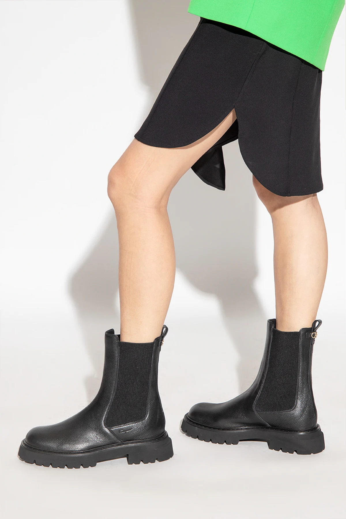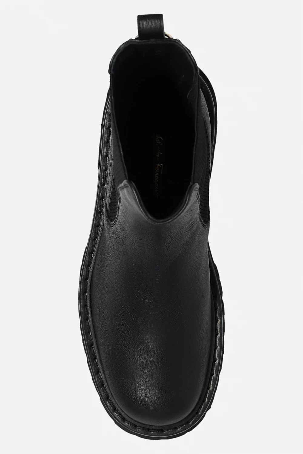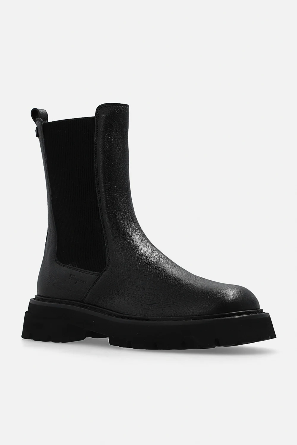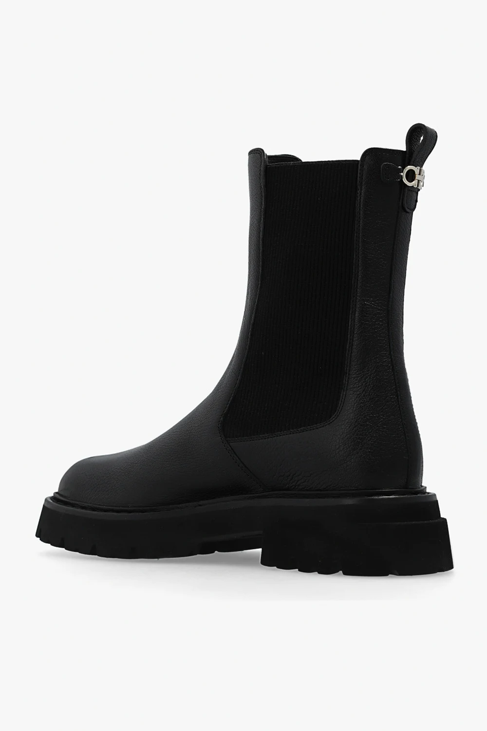 Czarne sztyblety, model ‘Oderico’ FERRAGAMO. Wykonane ze skóry. Po bokach pas elastyczny. Z tyłu aplikacja z logo. Czarna, gumowa podeszwa.