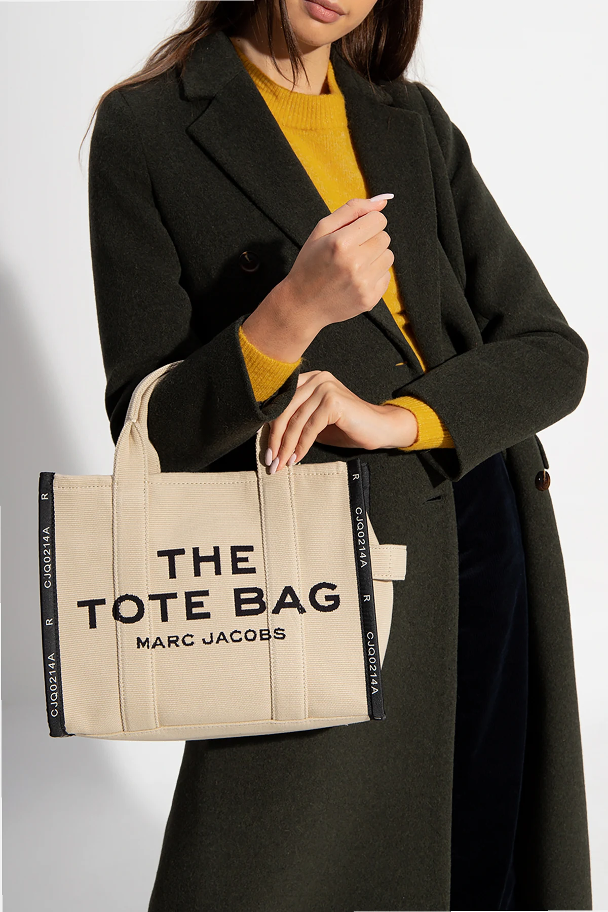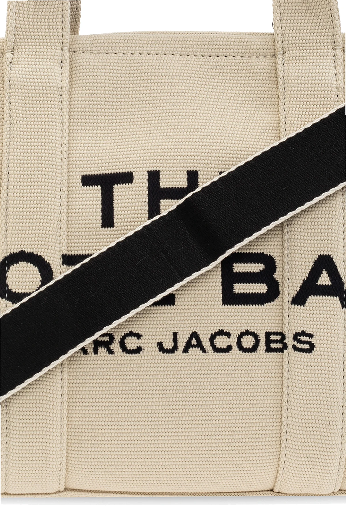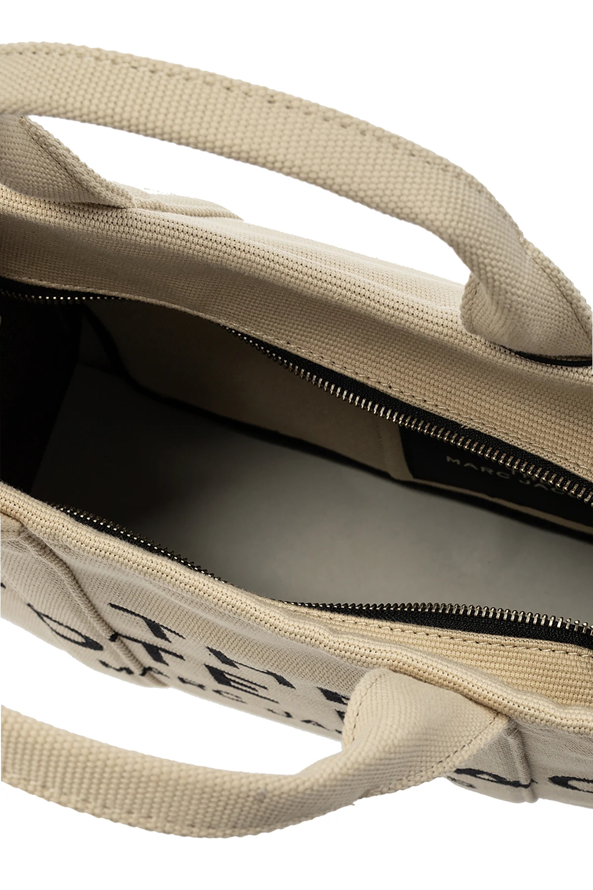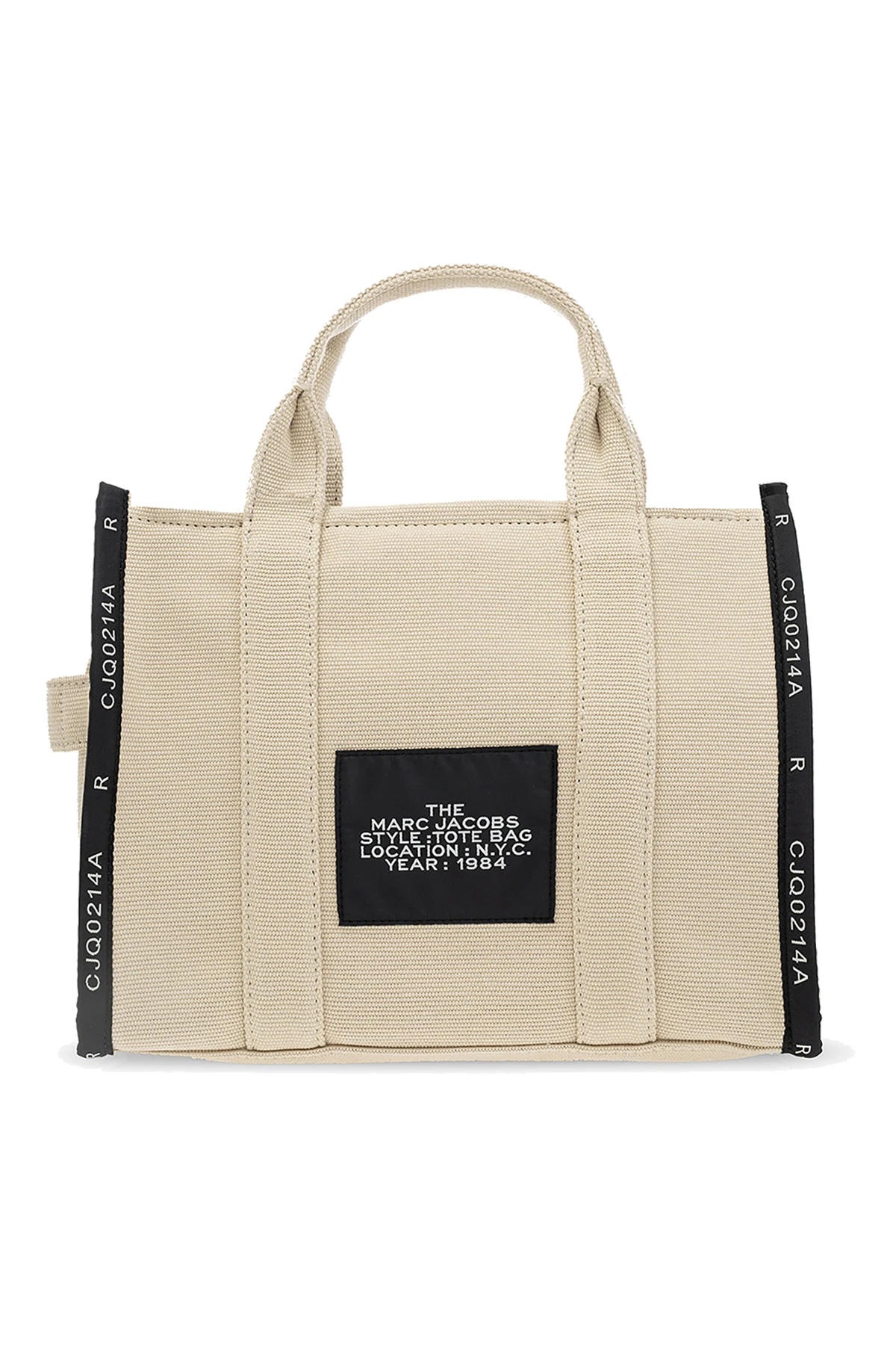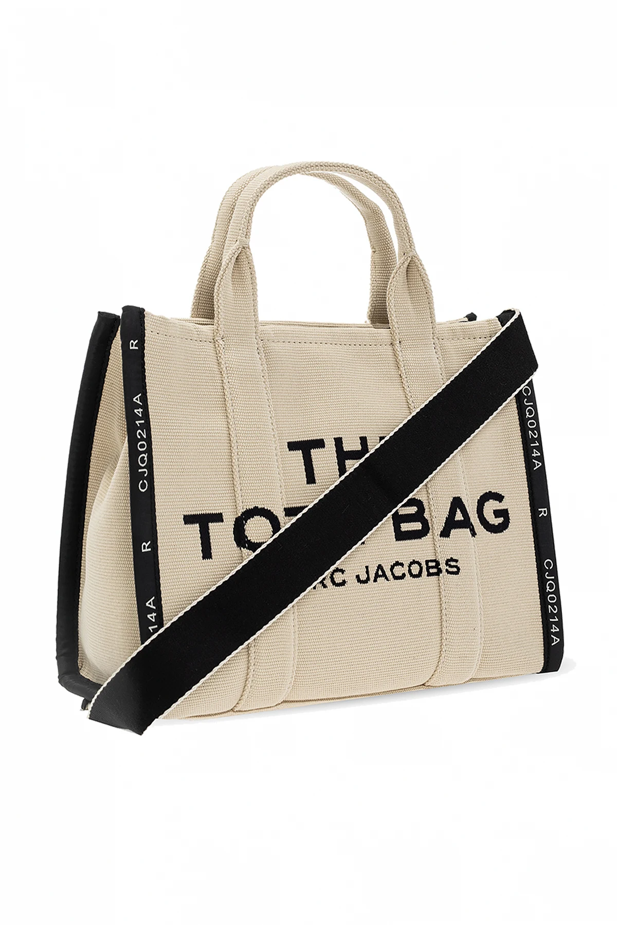Beżowo-czarna, bawełniana torba na ramię, model 'The Medium Tote' Marc Jacobs. Zamykana na zamek. Z przodu wyszyte logo. Z tyłu naszywka z logo. Dwie półokrągłe rączki. Odpinany pas na ramię z możliwością regulacji długości w kolorze czarno-bezowym. Wewnątrz komora, dwie wsuwane kieszenie oraz jedna zamykana na zamek. Metalowe elementy w kolorze srebrnym.