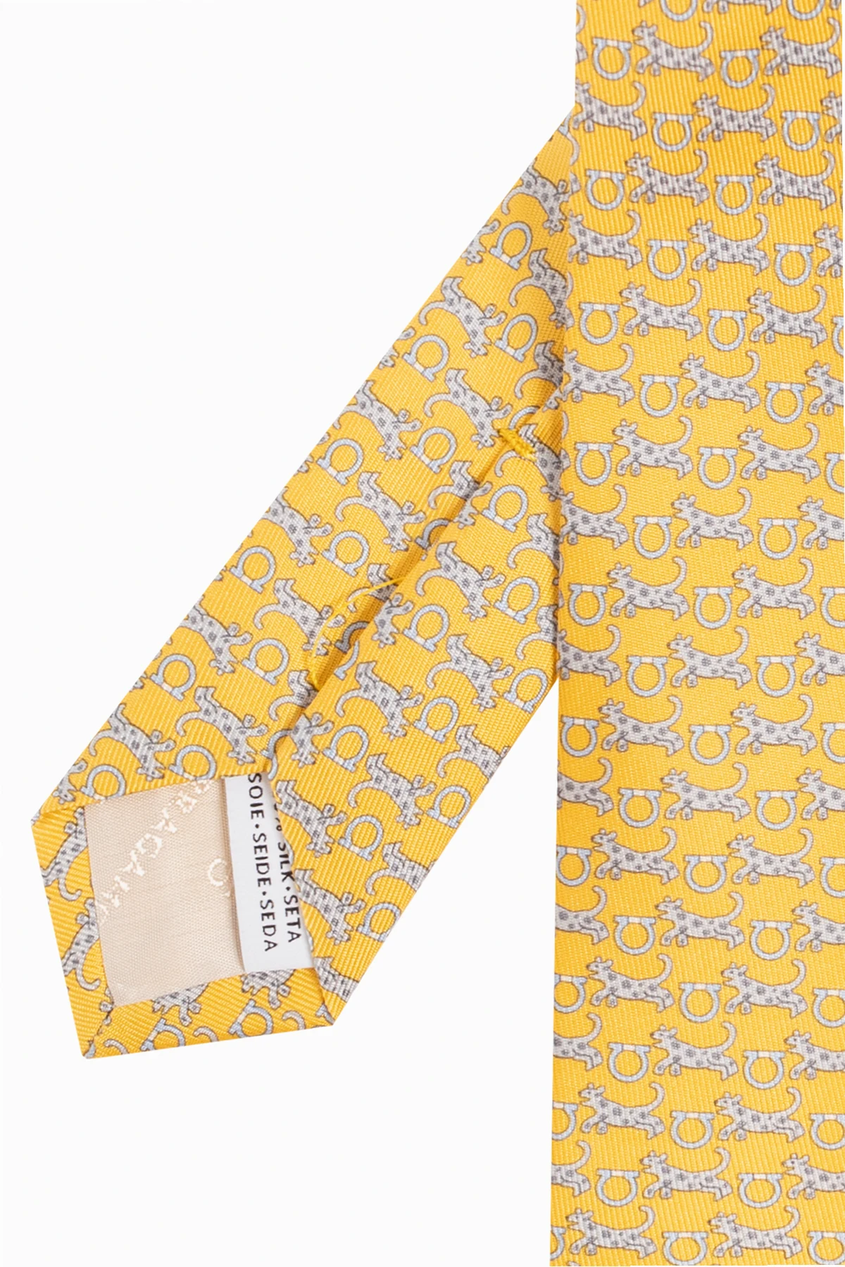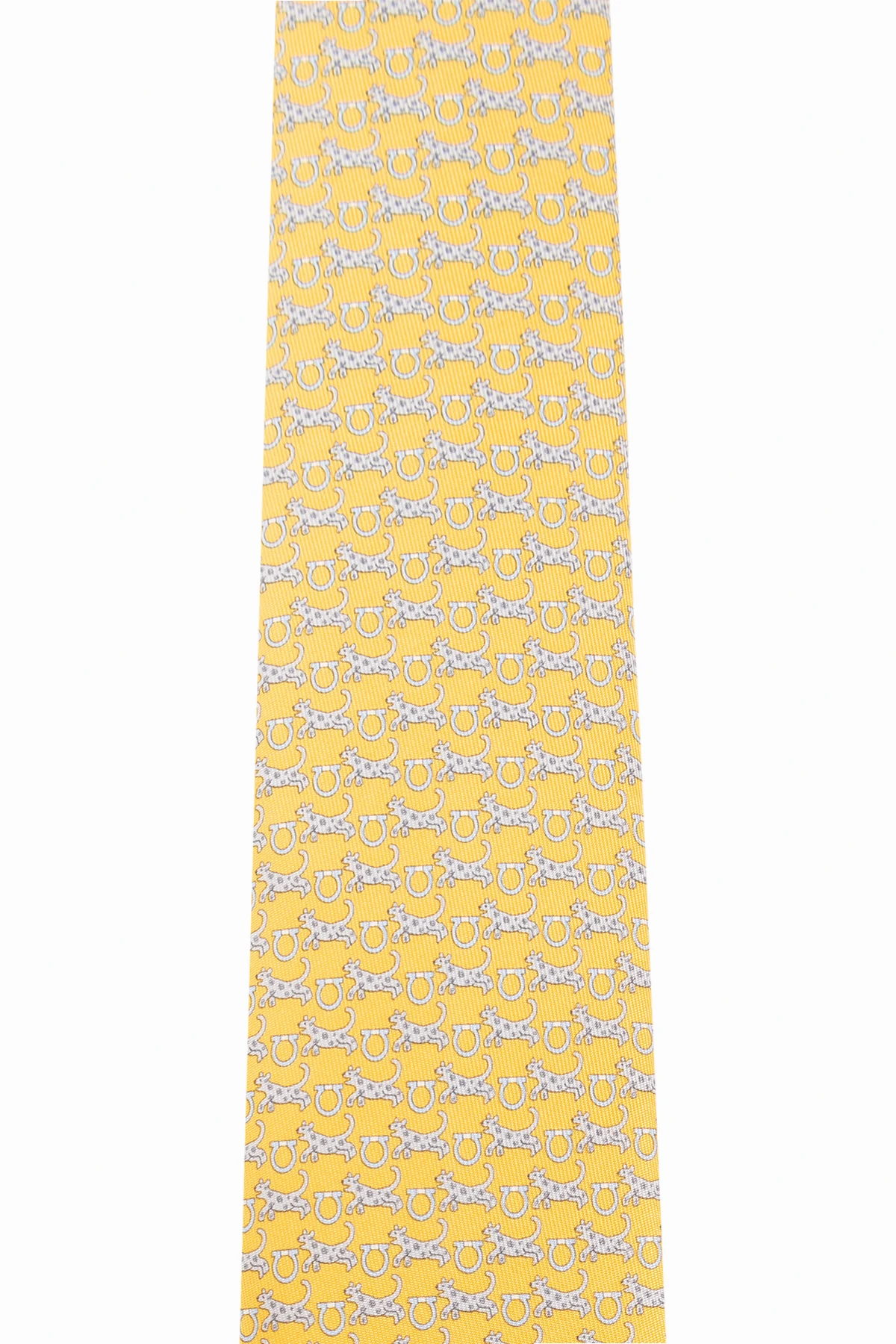 Żółto-niebieski krawat FERRAGAMO. Wykonany z jedwabiu. Ozdobiony wzorem z motywem zwierzęcym.