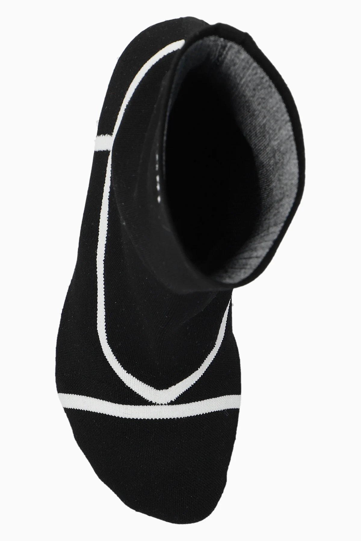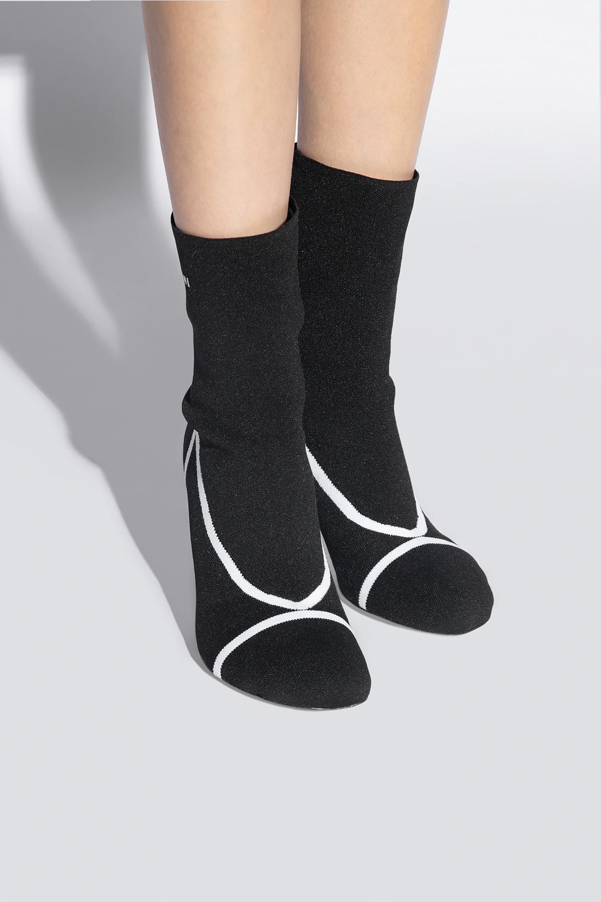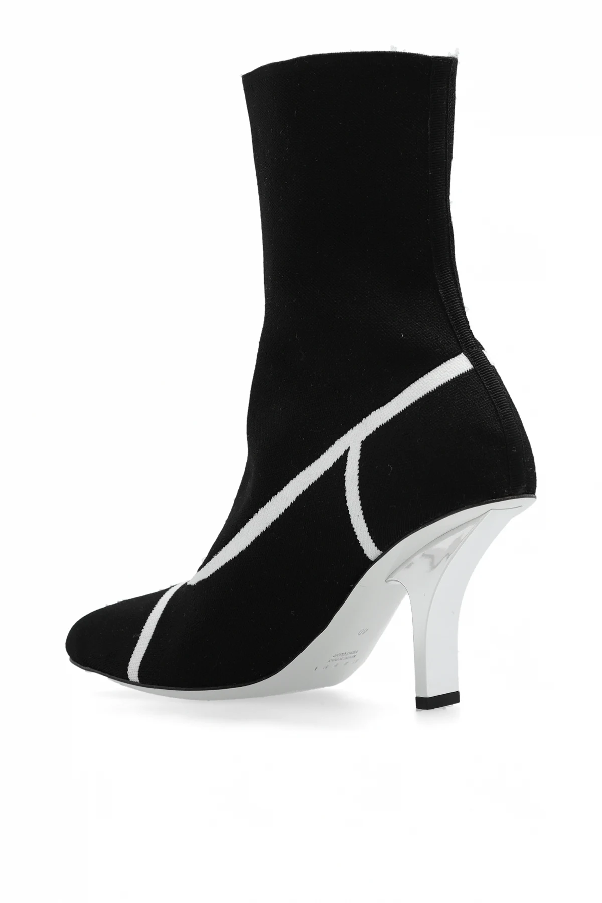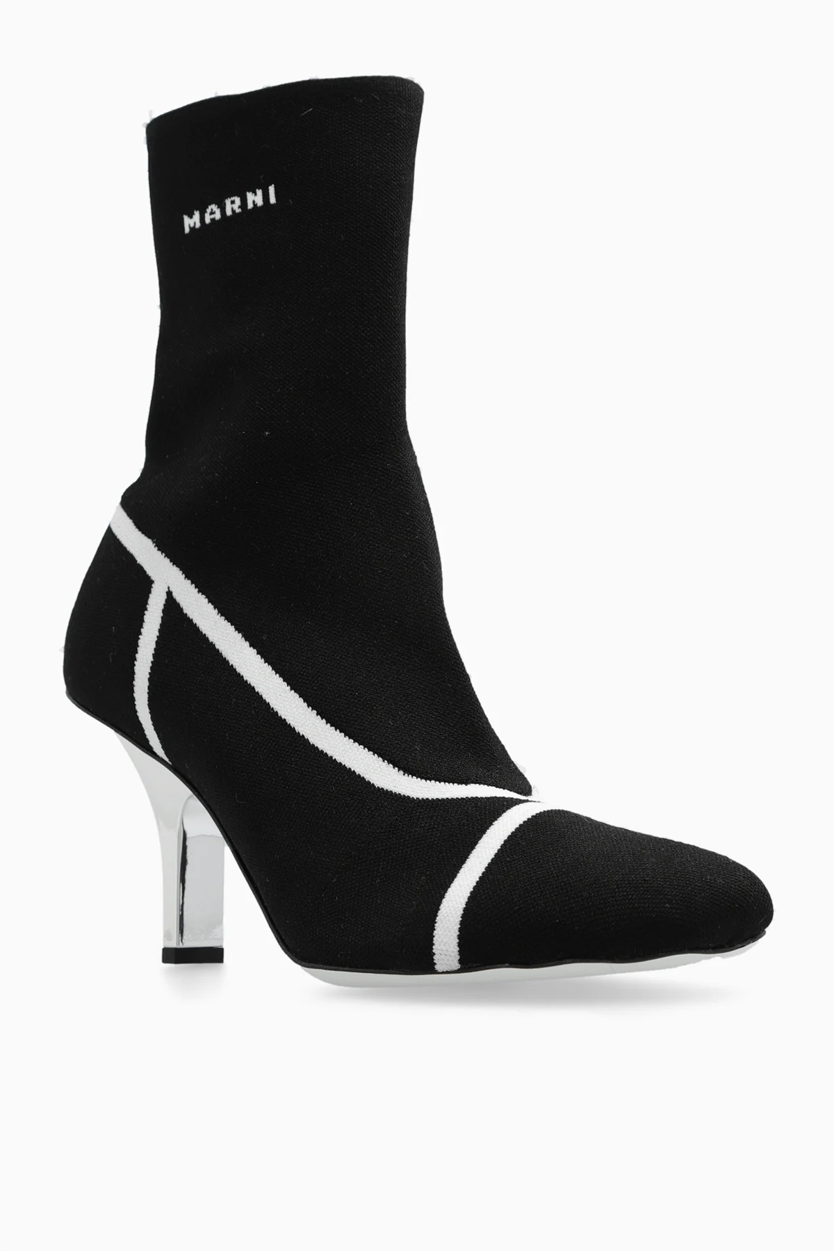 Czarne botki na obcasie Marni. Wykonane z elastycznego materiału. Ozdobione białymi paskami i logo. Nieregularnie wykończony nosek. Dekoracyjnie zakrzywiony obcas w kolorze srebrnym. Biała, skórzana podeszwa.