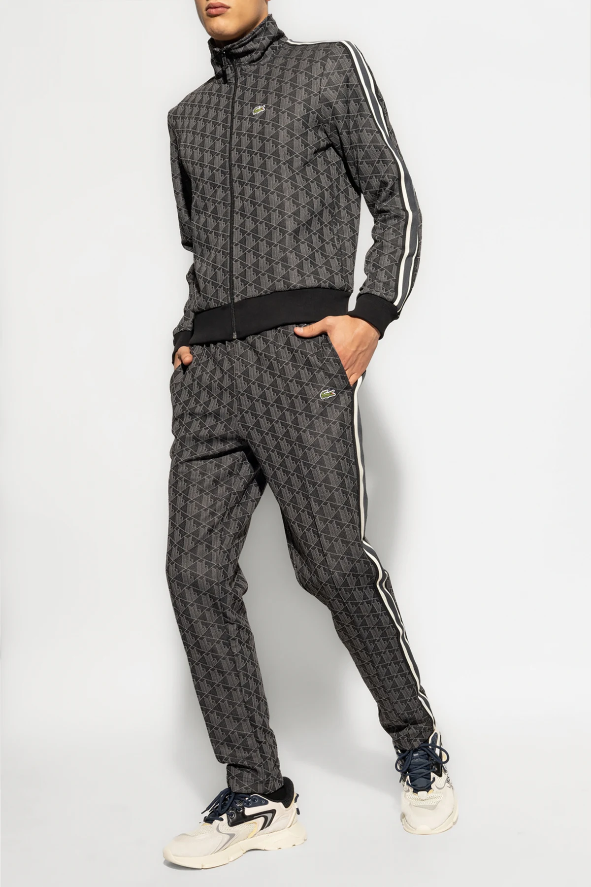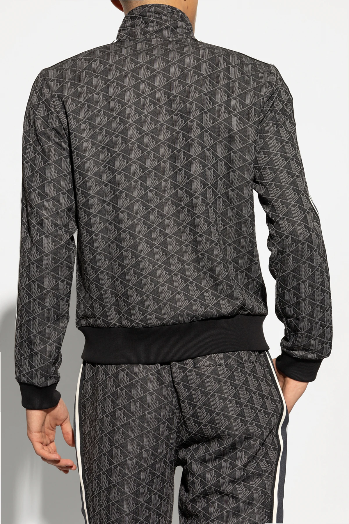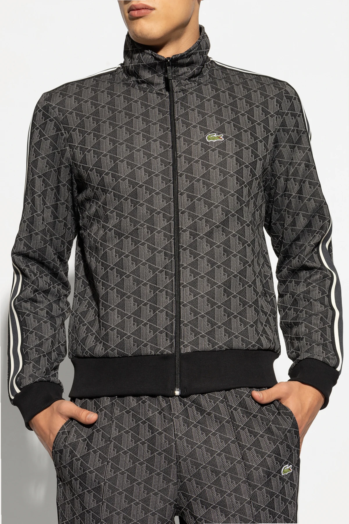 Bluza posiada klasyczny krój sportowy z zamkiem błyskawicznym na całej długości z przodu, wysokim kołnierzem oraz ściągaczami przy mankietach i u dołu. Jednolity, geometryczny wzór w formie monogramu w czarno-szarej kolorystyce nadaje jej niepowtarzalnego charakteru, a kontrastowe paski biegnące wzdłuż rękawów podkreślają dynamiczny wygląd. Dwie wsuwane kieszenie boczne zapewniają praktyczność i funkcjonalność.