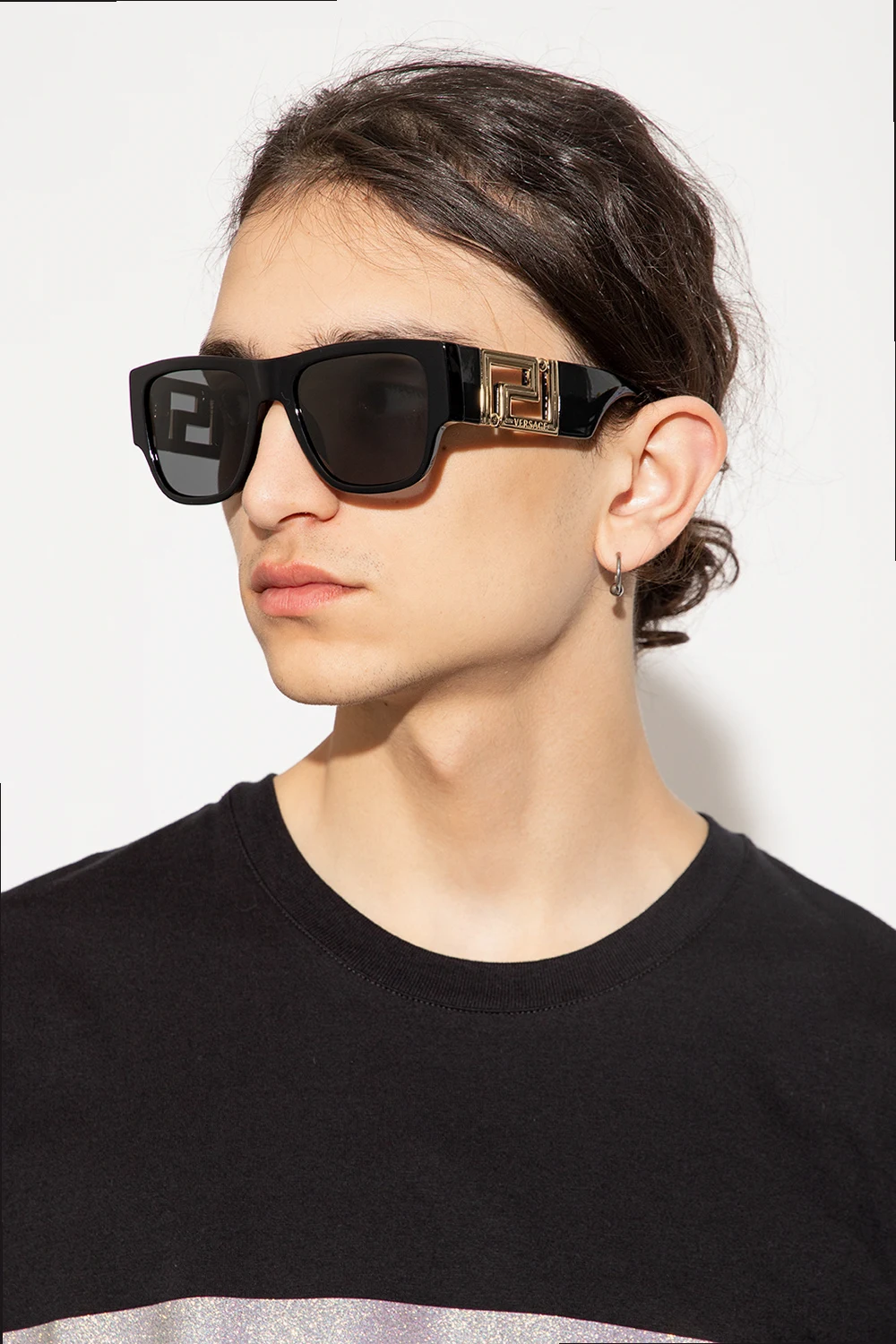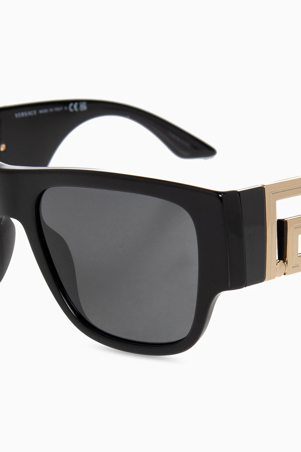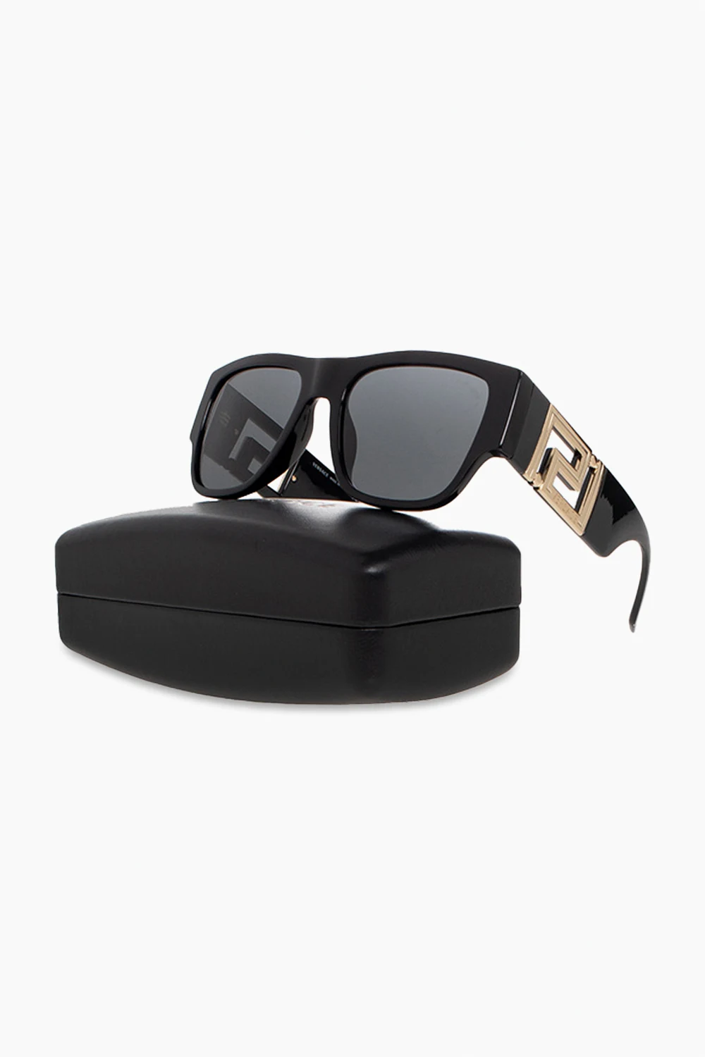 Czarne okulary przeciwsłoneczne Versace. Prostokątne oprawki. Zauszniki ozdobione geometrycznymi okuciami ‘Greca’ z wygrawerowanym logo w kolorze złotym. Szare szkła ze 100% ochroną UV.