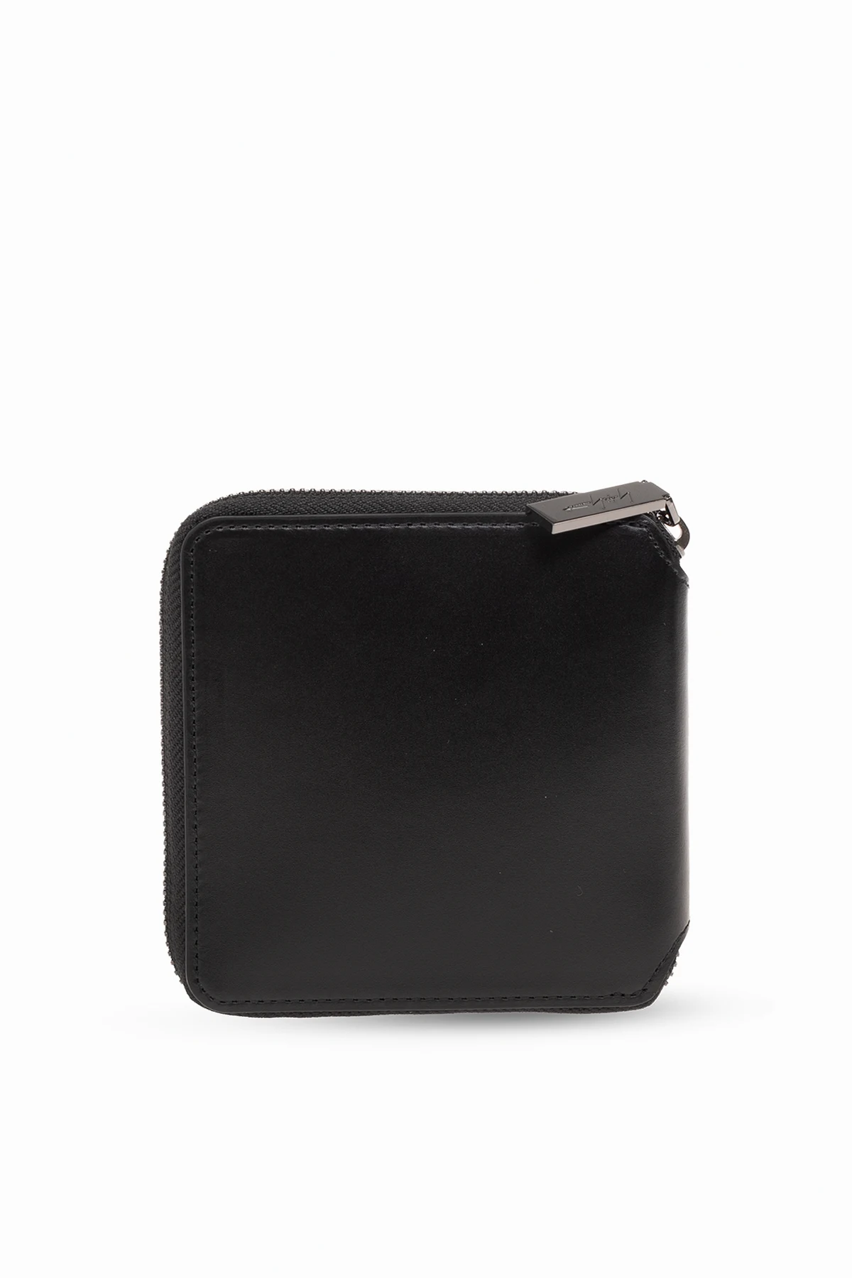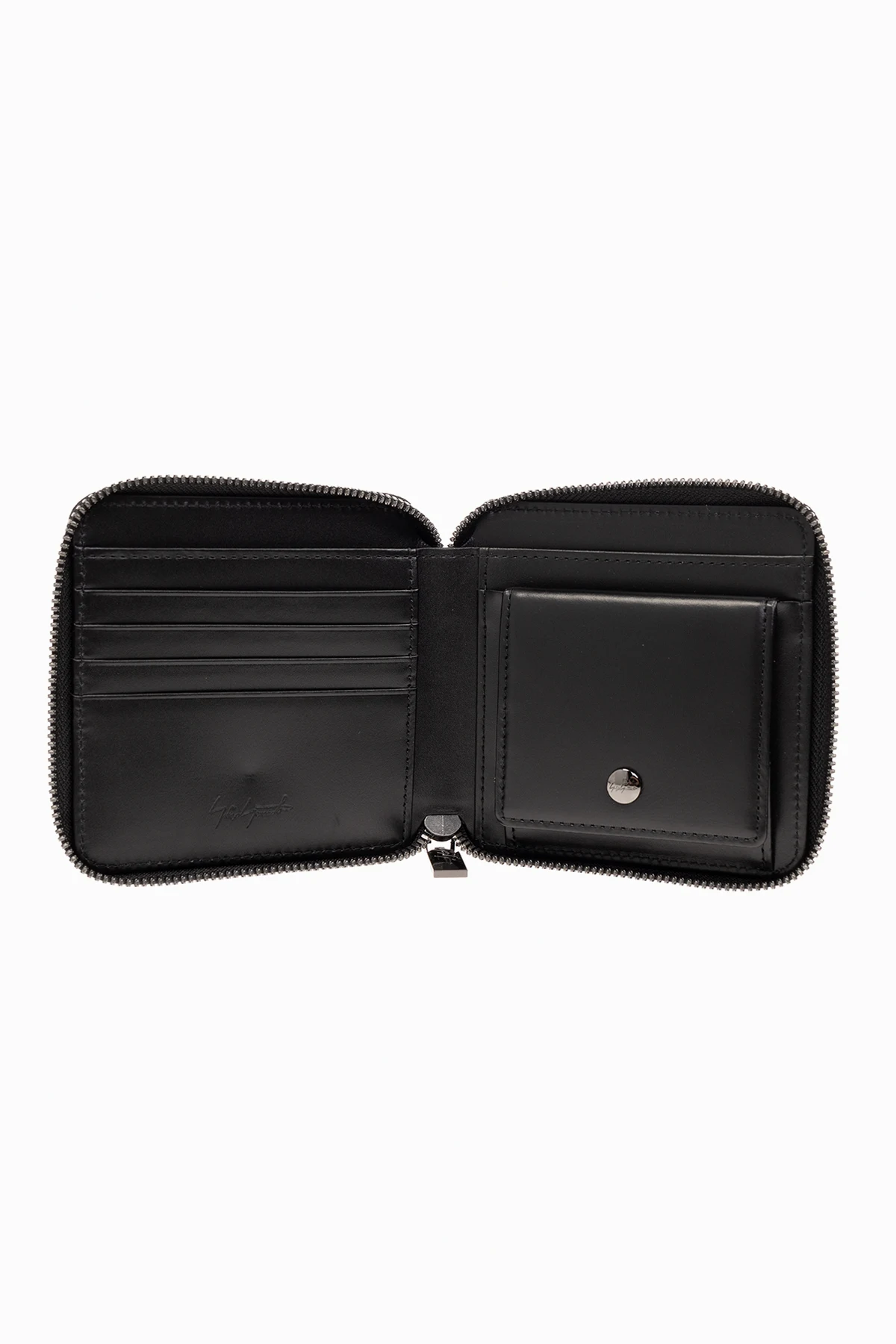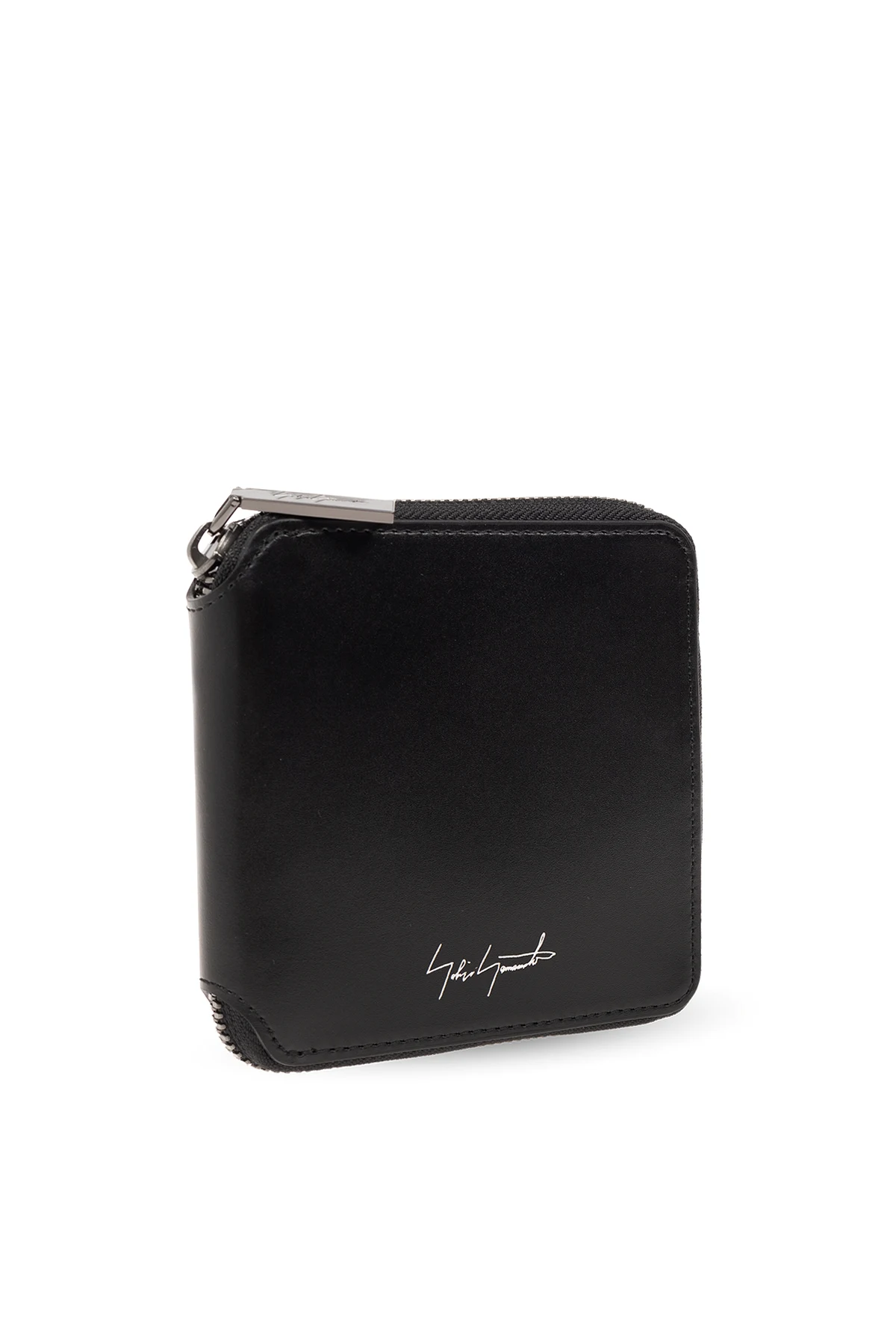 Czarny portfel Discord Yohji Yamamoto. Wykonany ze skóry. Zamykany na zamek. Z przodu ozdobiony logo w kolorze srebrnym. Wewnątrz przegroda na banknoty, kieszeń na monety zamykana na zatrzask, dwie wsuwane i cztery miejsca na karty.