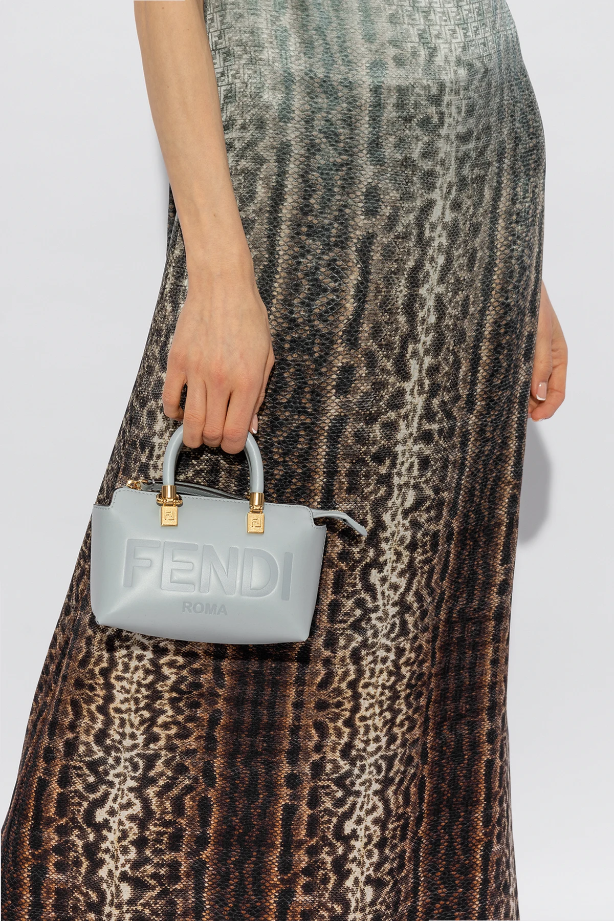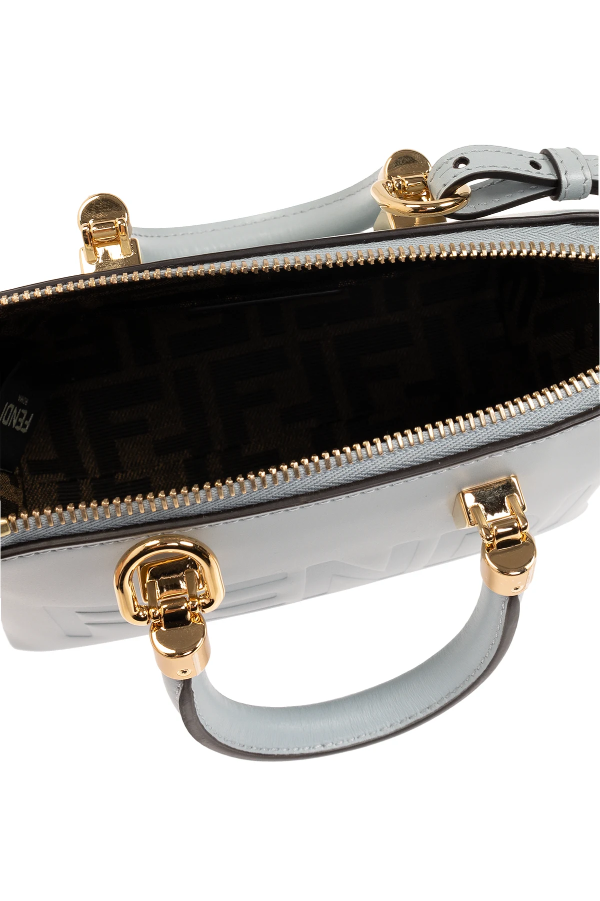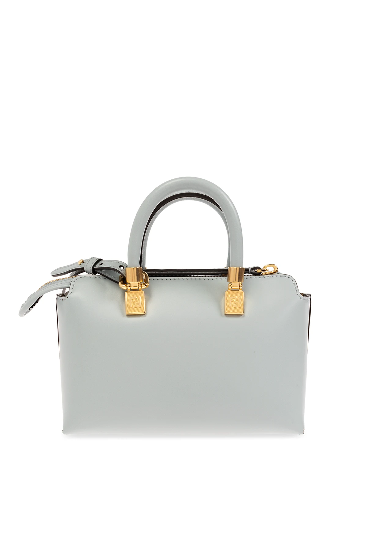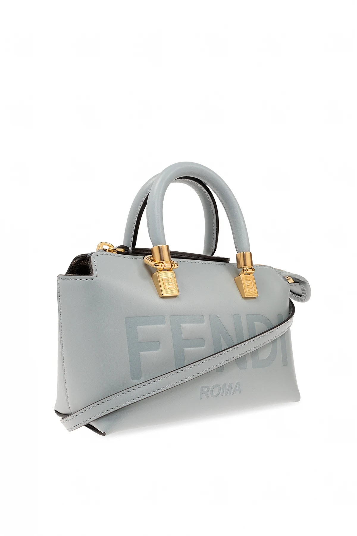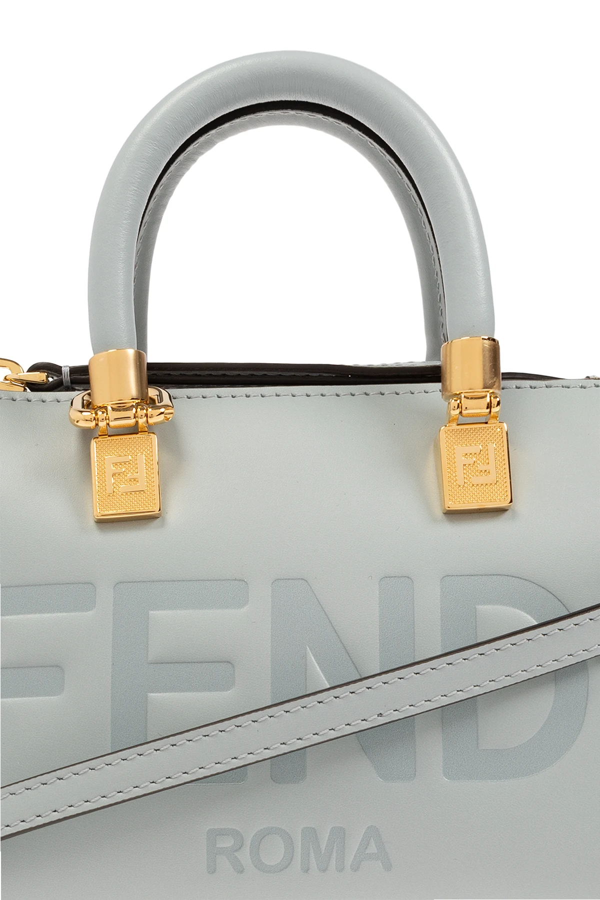 Jasnoniebieska torba na ramię, model ‘By The Way Mini’ Fendi. Wykonana z gładkiej skóry. Zamykana na zamek. Z przodu ozdobiona logo. Dwie półokrągłe rączki. Odpinany, regulowany pasek. Wewnątrz komora i miejsce na kartę. Metalowe elementy w kolorze złotym.