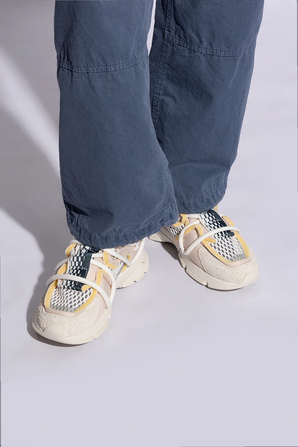Wyróżniającym elementem są szerokie, elastyczne paski krzyżujące się na przodzie buta, zastępujące tradycyjne sznurowanie, co zapewnia wyjątkową łatwość zakładania. Nowoczesny wygląd podkreśla wielowarstwowa, dynamiczna podeszwa, a komfort noszenia gwarantuje starannie wyściełane wnętrze oraz język buta. Logo projektanta, widoczne na bocznym panelu oraz na pasku nad piętą, dodaje prestiżu i podkreśla ekskluzywny charakter obuwia.