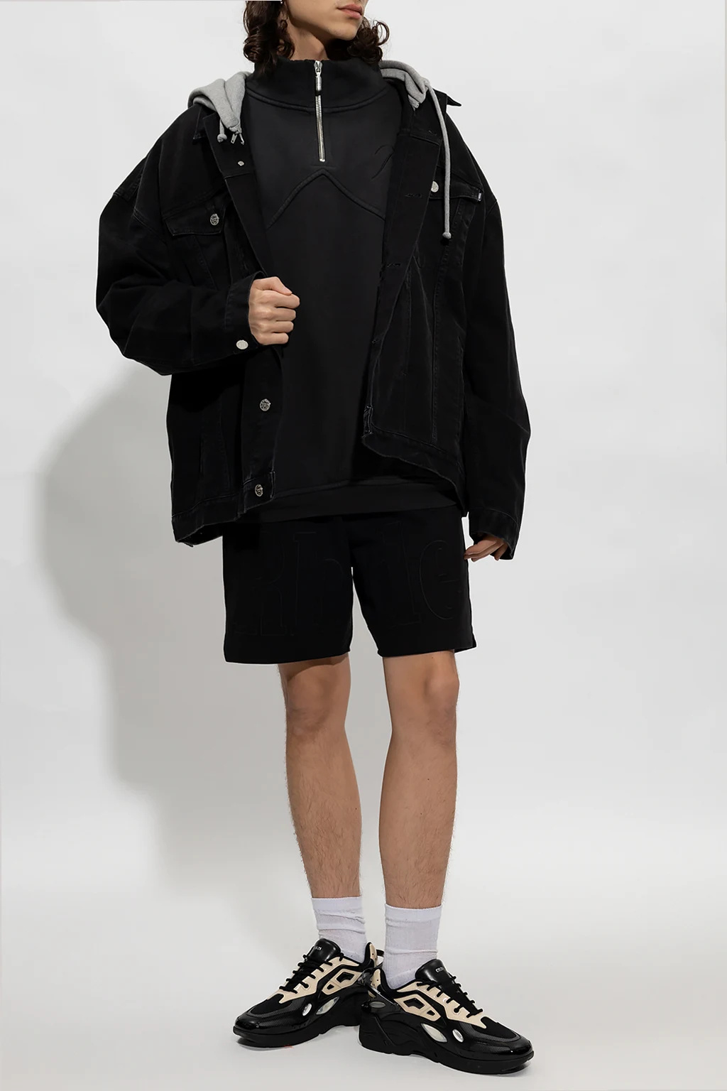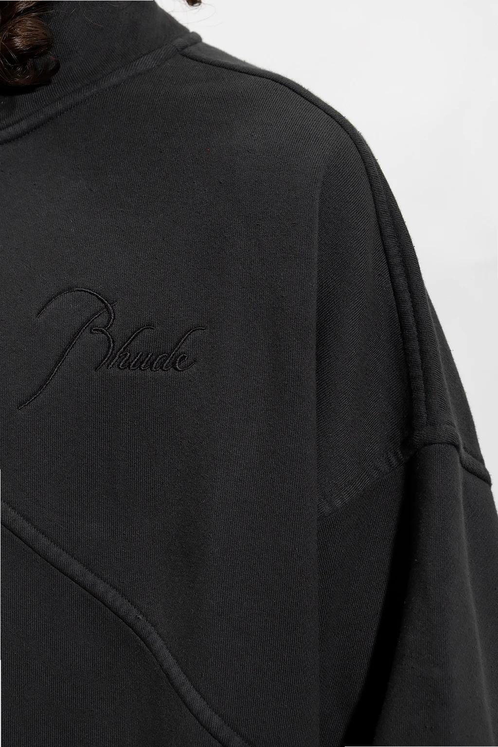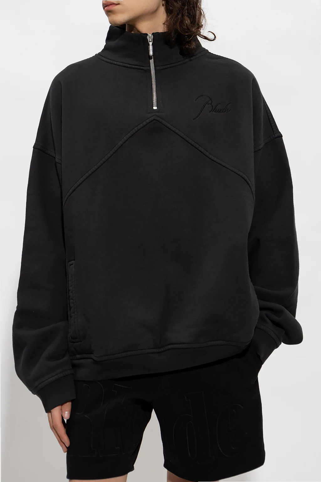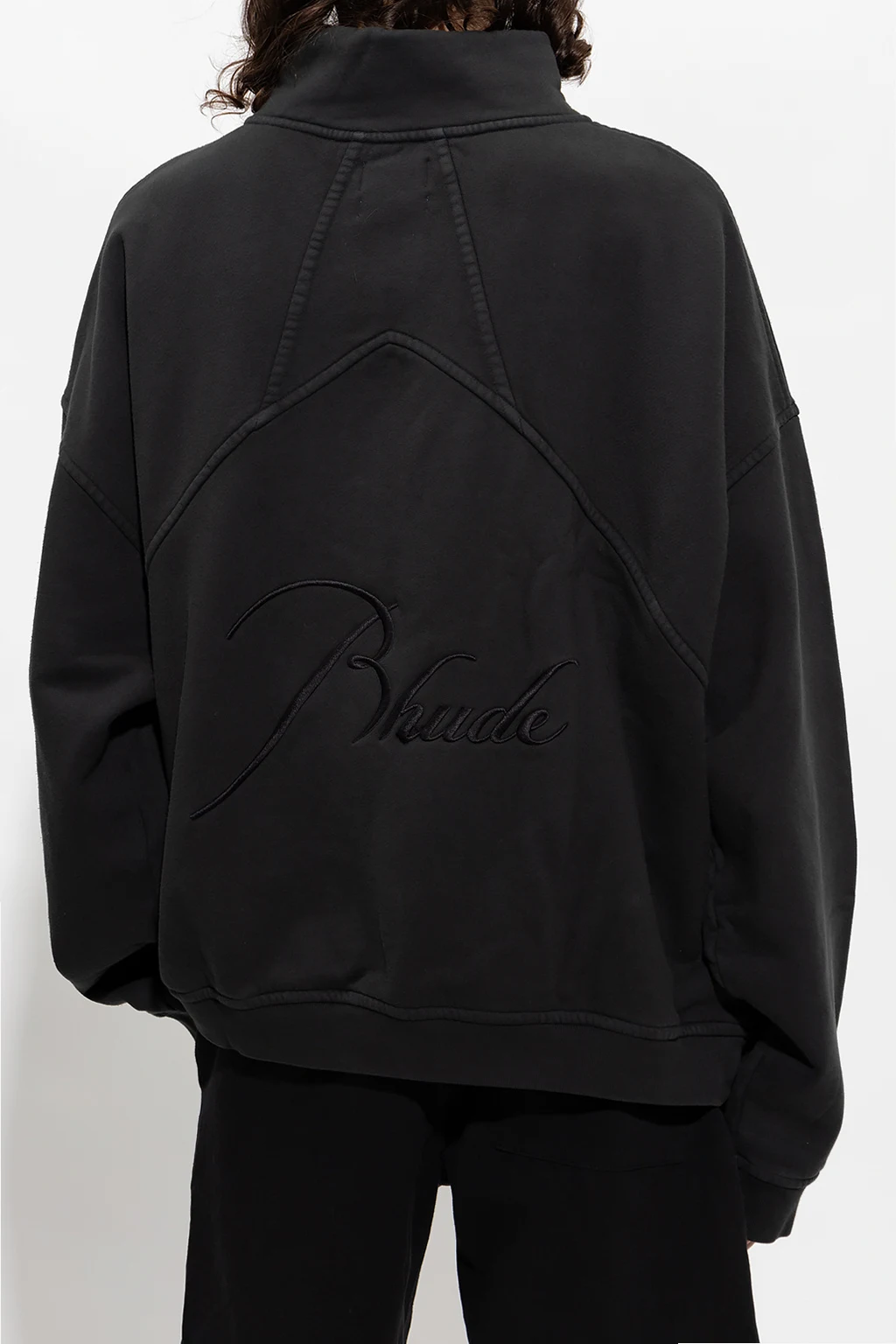 Czarna, bawełniana bluza o luźnym kroju Rhude. Dekolt z kołnierzem zapinany na zamek. Ozdobiona wyszytym logo. Z przodu dwie kieszenie. Długie rękawy i dół bluzy zakończone ściągaczem.