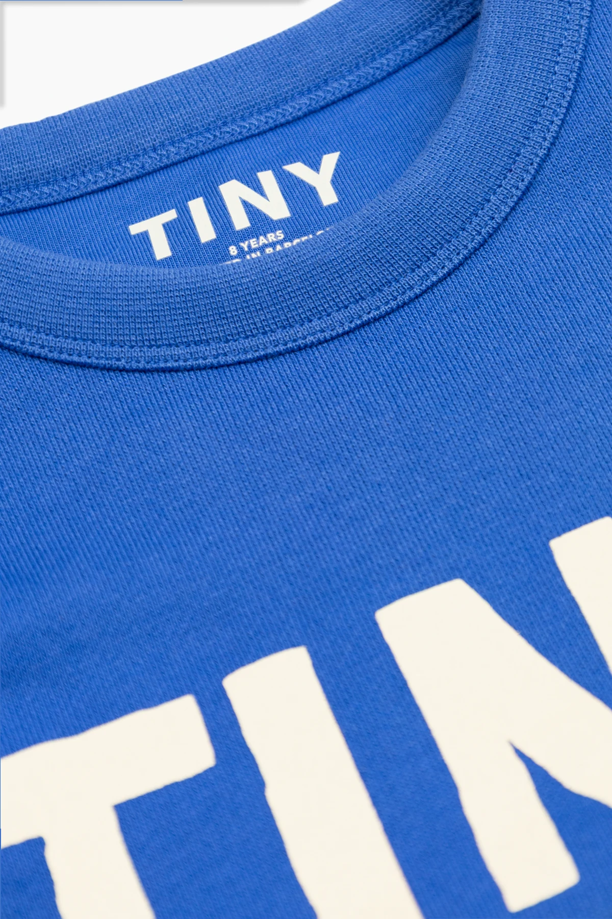 Bluza ma klasyczny, prosty krój z długimi rękawami, zakończonymi elastycznym ściągaczem, co poprawia dopasowanie i wygodę noszenia. Na przedniej części bluzy znajduje się biały nadruk z napisem "TINY GALLERY GRAND OPENING", dodający jej unikalnego charakteru. Wewnątrz, przy kołnierzu, widoczna jest metka z napisem "TINY" oraz informacją o rozmiarze 6 lat. Dodatkowo, na bocznej części bluzy, przyszyta jest mała metka z napisem "TINY" w kolorze pomarańczowym.