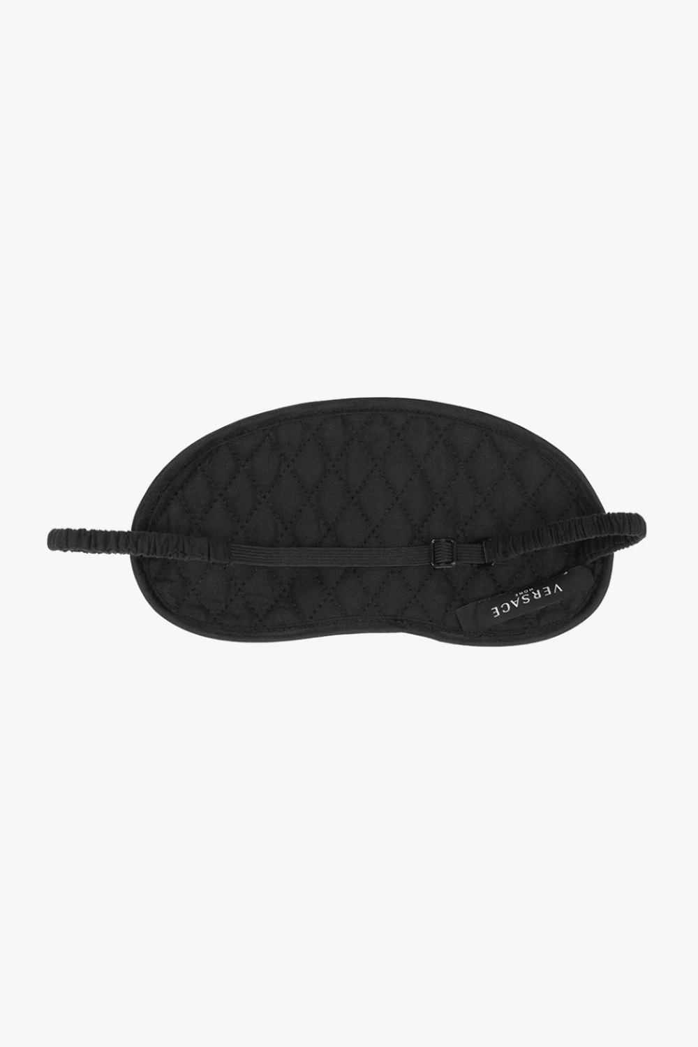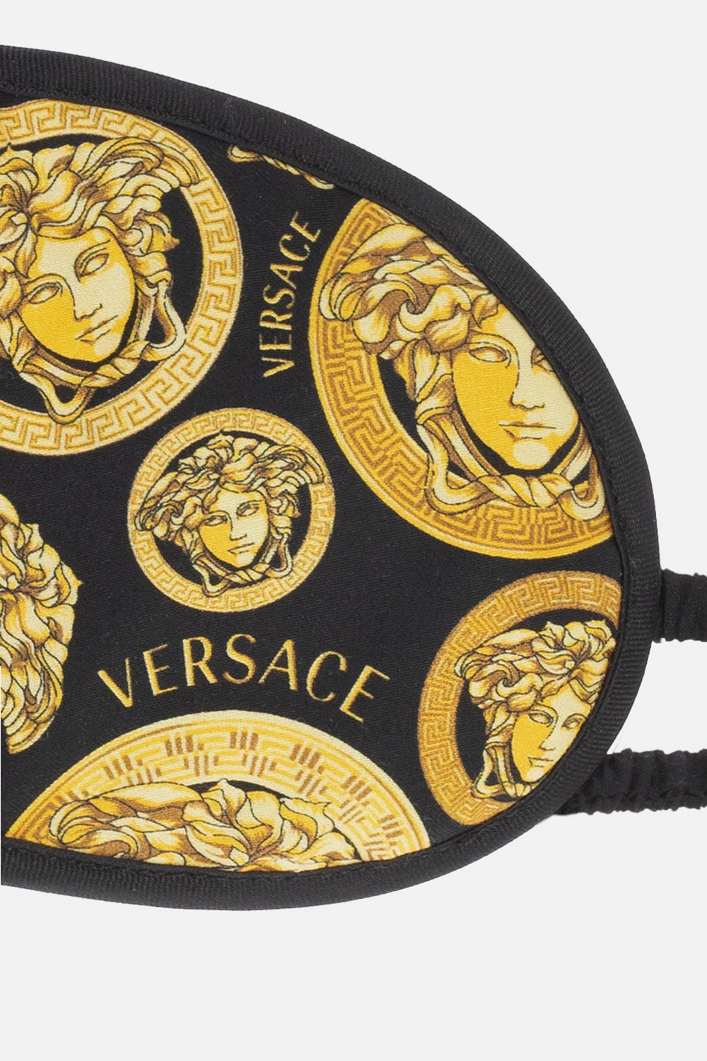 Czarno-żółta opaska na oczy do spania Versace Home. Wykonana z bawełny ozdobionej wzorem z logo oraz charakterystyczną dla marki głową Meduzy. Z tyłu guma z możliwością regulacji szerokości.