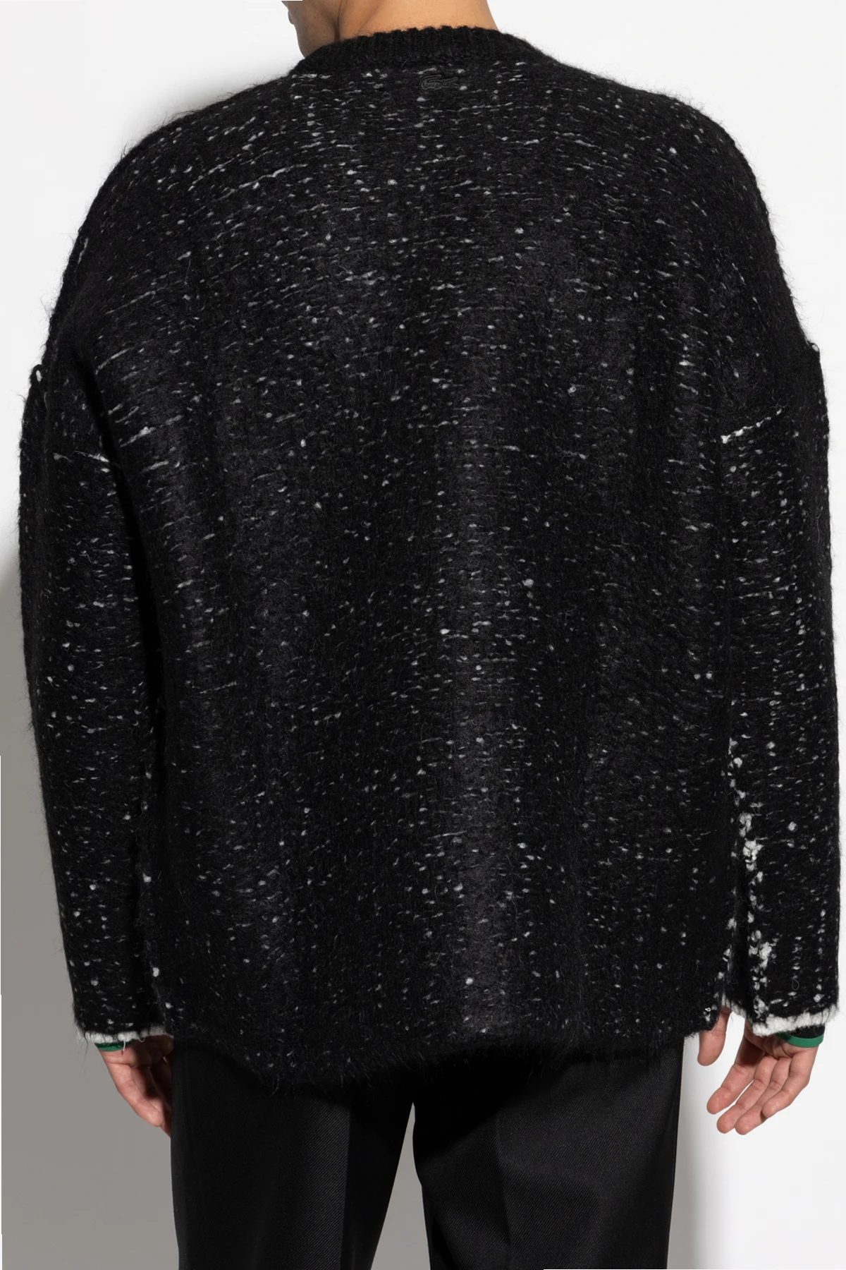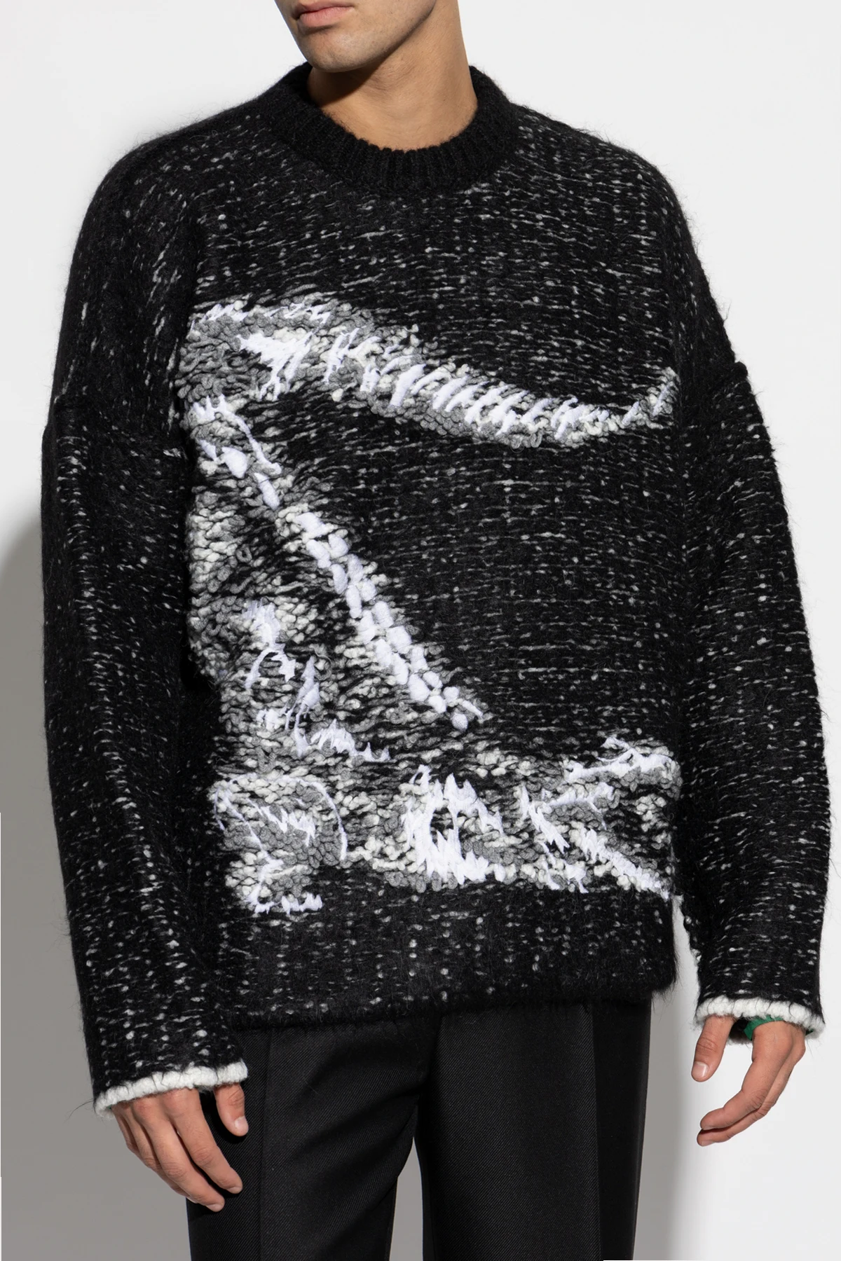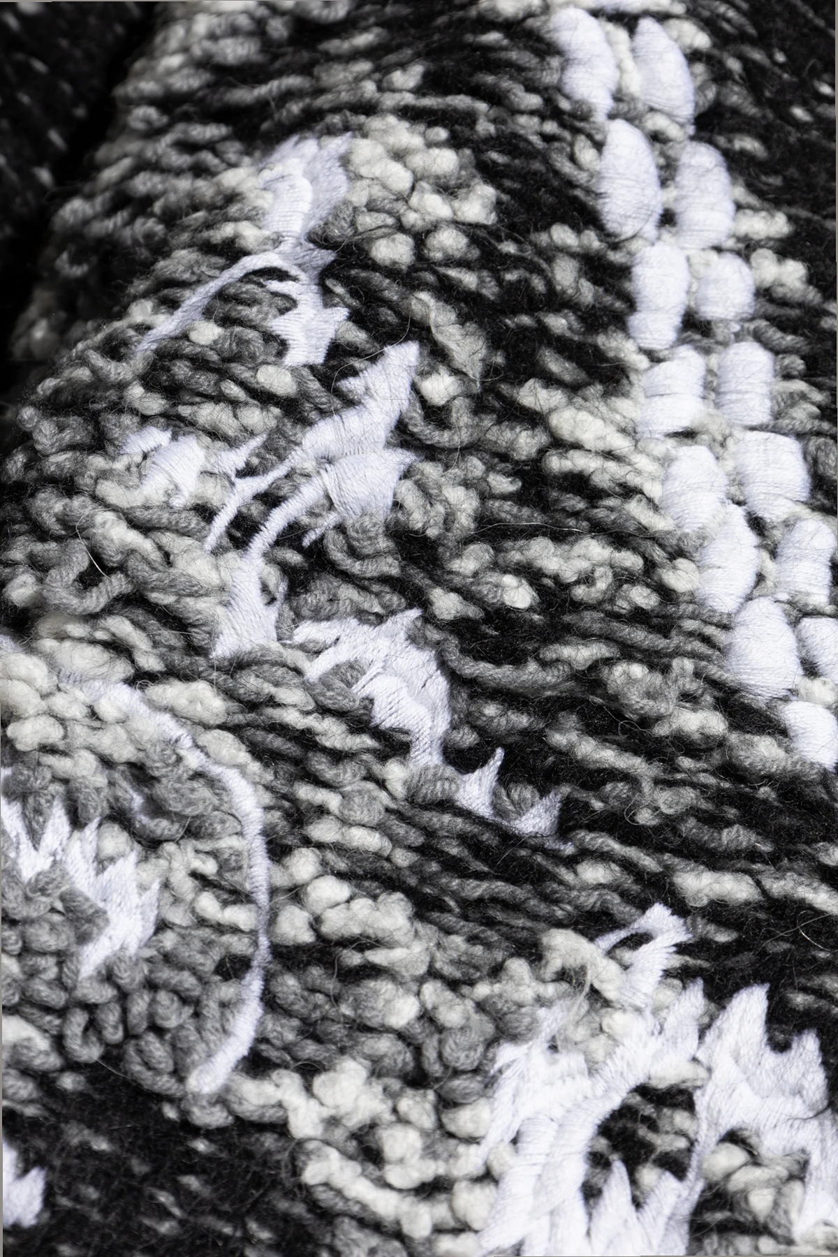 Sweter wyróżnia się klasycznym, luźnym krojem z długimi rękawami oraz okrągłym dekoltem. Dominujący czarny kolor został uzupełniony o kontrastujący, abstrakcyjny wzór w odcieniach bieli i szarości, przypominający malarskie pociągnięcia pędzlem.