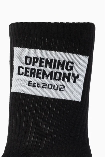 Czarne, bawełniane skarpety Opening Ceremony. Ozdobione wyszytym logo w kolorze biało-czarnym. Wykończone ściągaczem.