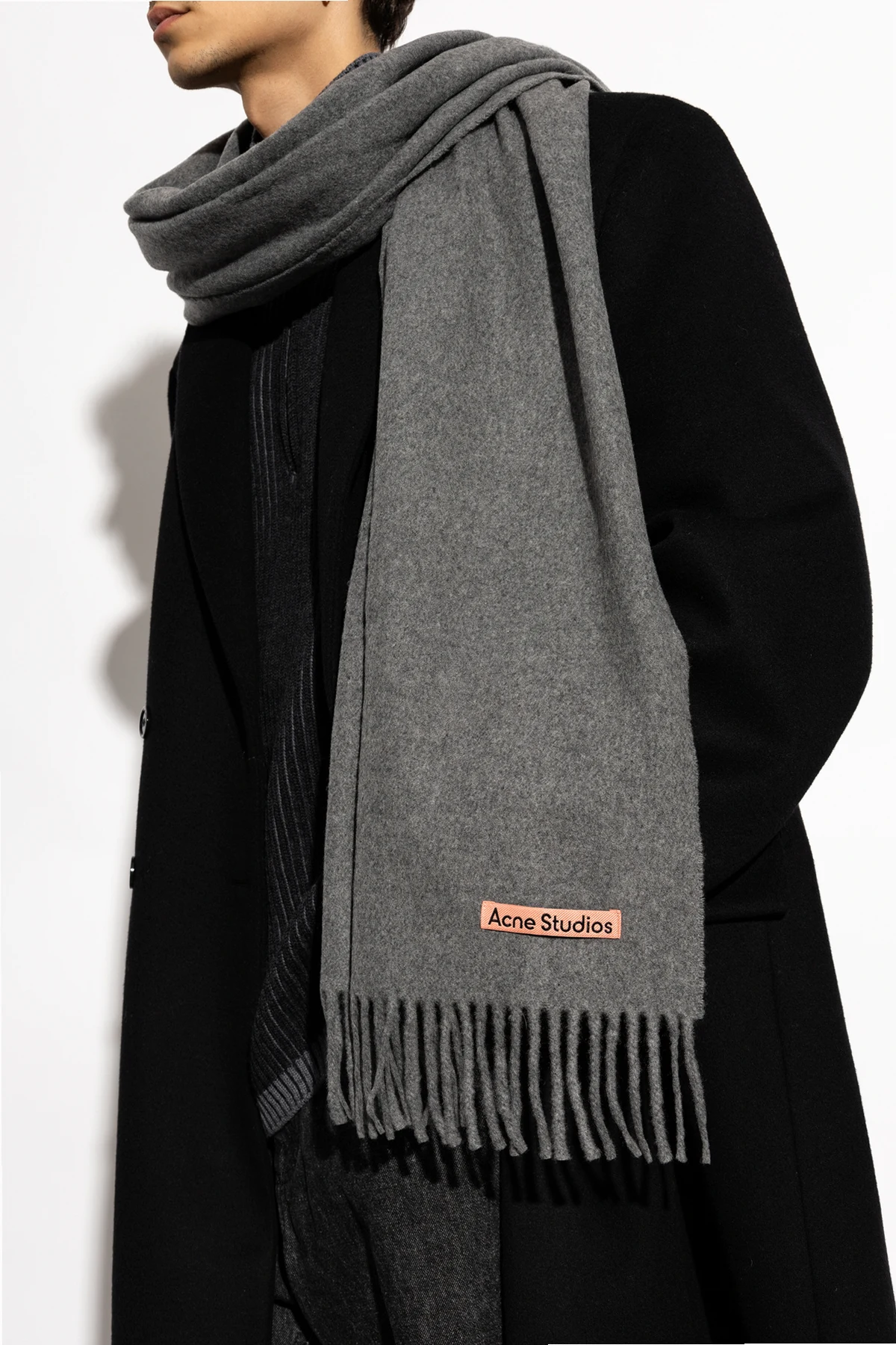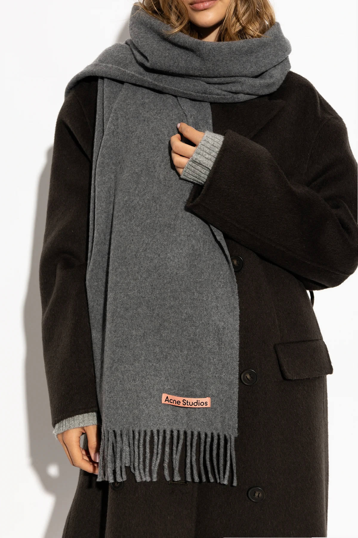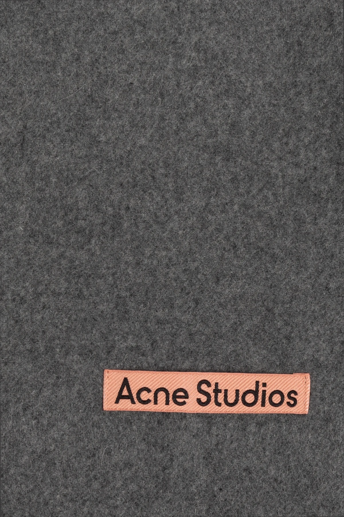 Szal posiada klasyczny, prostokątny kształt z frędzlami na końcach, które dodają mu stylowego wykończenia. Na szalu znajduje się charakterystyczne logo marki Acne Studios, umieszczone na różowej metce z czarnym napisem – subtelny, lecz rozpoznawalny akcent marki.