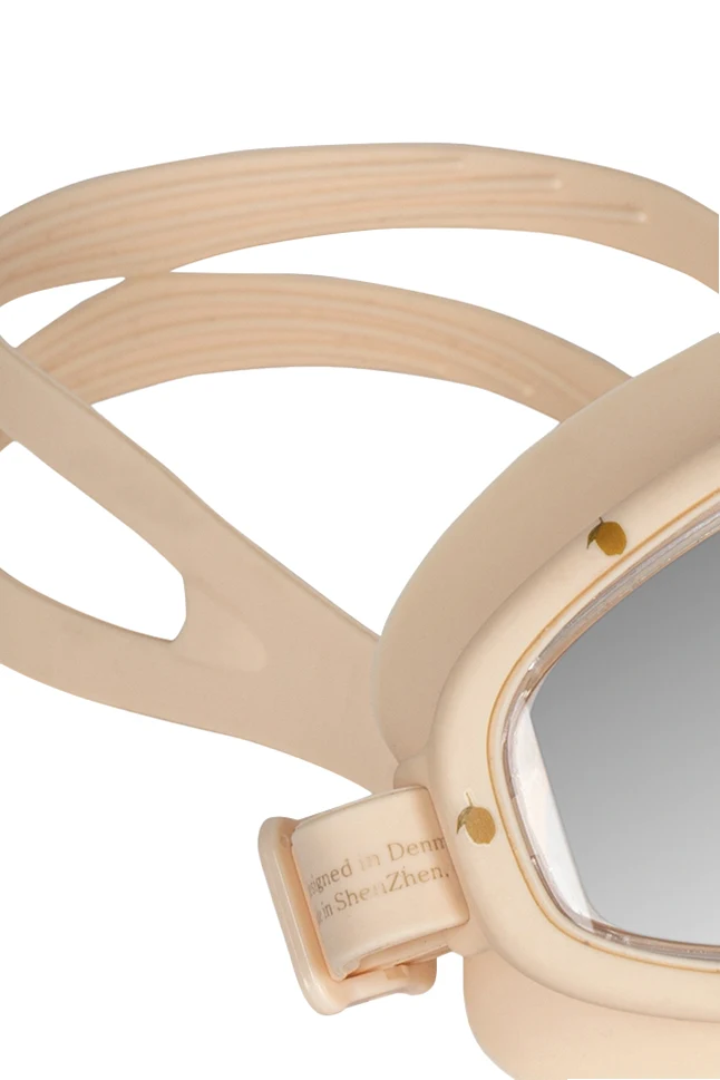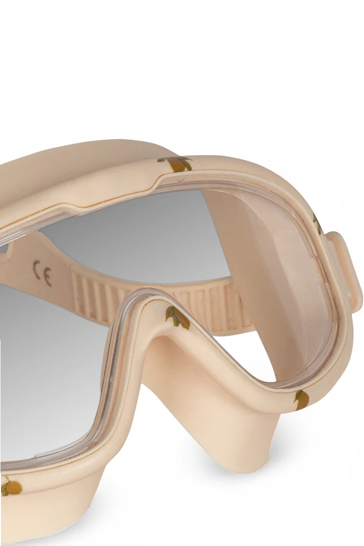 Maska charakteryzuje się ergonomicznym kształtem , doskonale dopasowującym się do twarzy dziecka. Szerokie okulary oferują rozległe pole widzenia, a zastosowanie miękkiego silikonu gwarantuje szczelność i wygodę noszenia. Kremowy kolor oraz brak dekoracyjnych wzorów podkreślają minimalistyczny charakter produktu, zaś metalowe elementy na paskach i obudowie dodają elegancji.