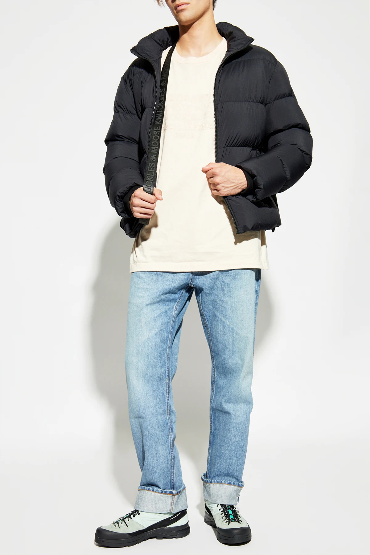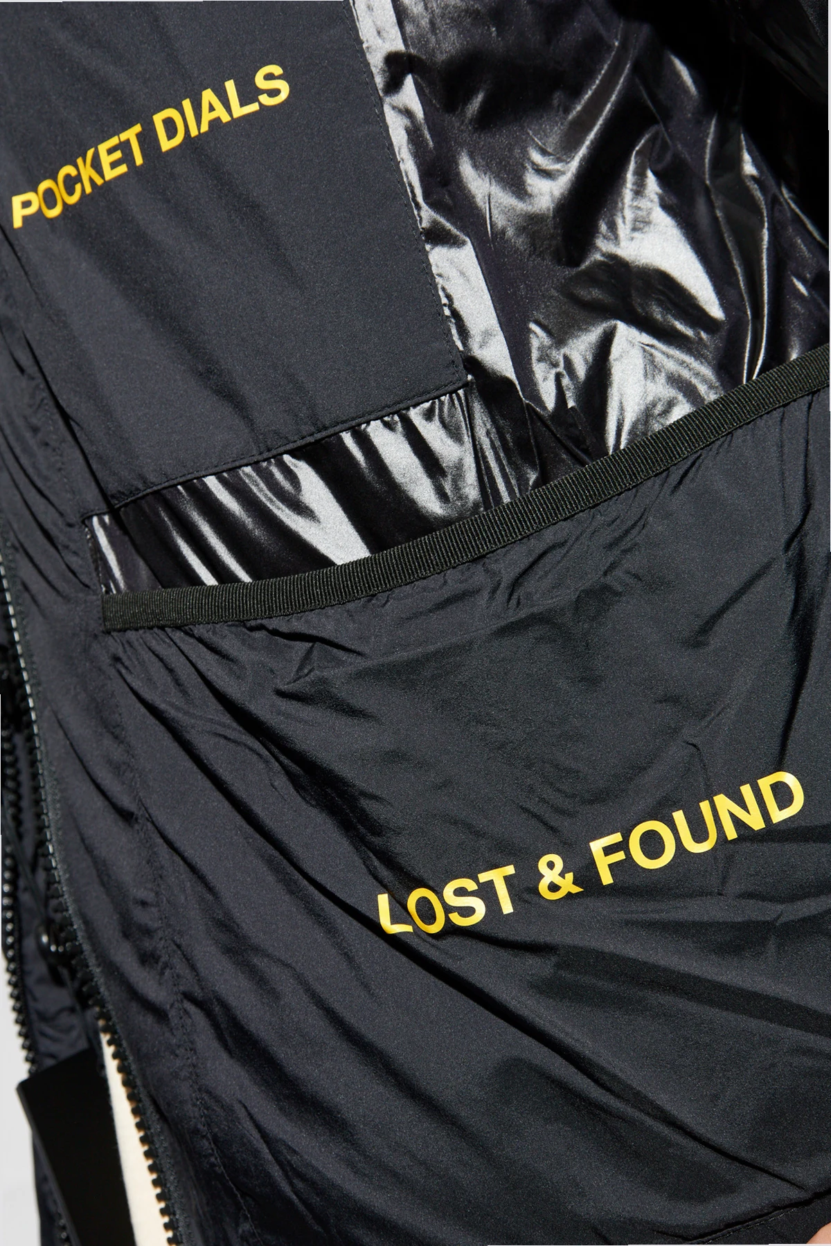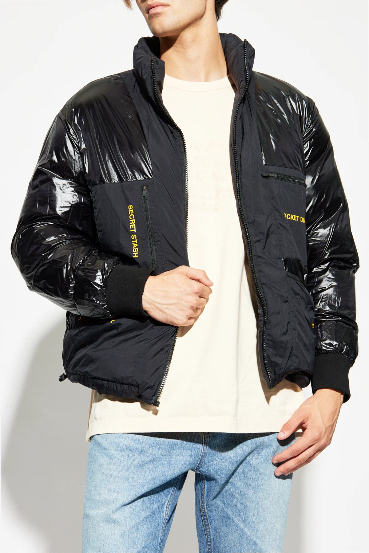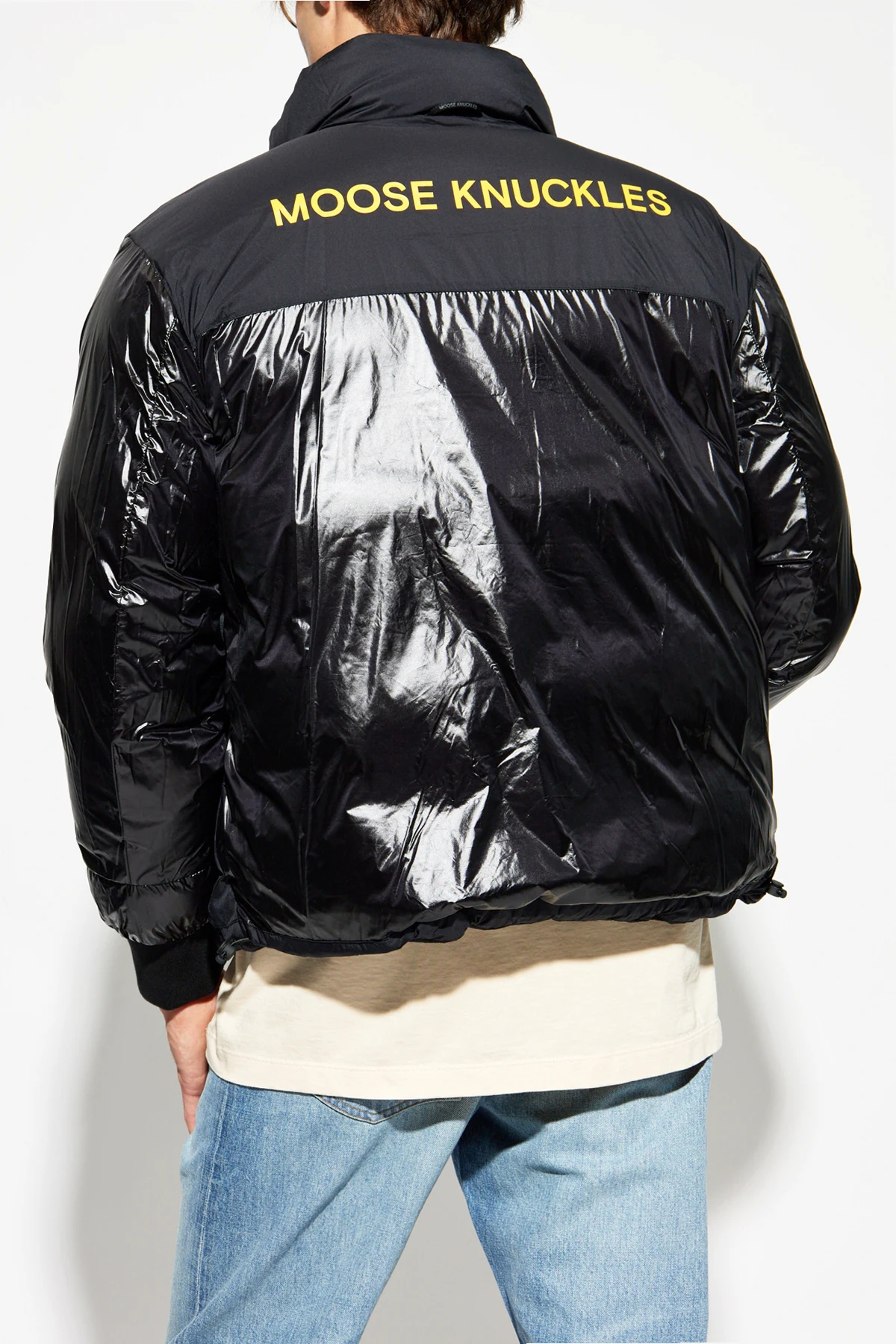 Matowa strona wykonana z gładkiego nylonu, ozdobiona jest subtelnym logo na lewym ramieniu, a dwie boczne kieszenie zapewniają praktyczność. Połyskująca strona, wykonana z błyszczącego materiału, przyciąga wzrok dużym napisem "MOOSE KNUCKLES" na plecach oraz żółtymi napisami wewnątrz kieszeni.