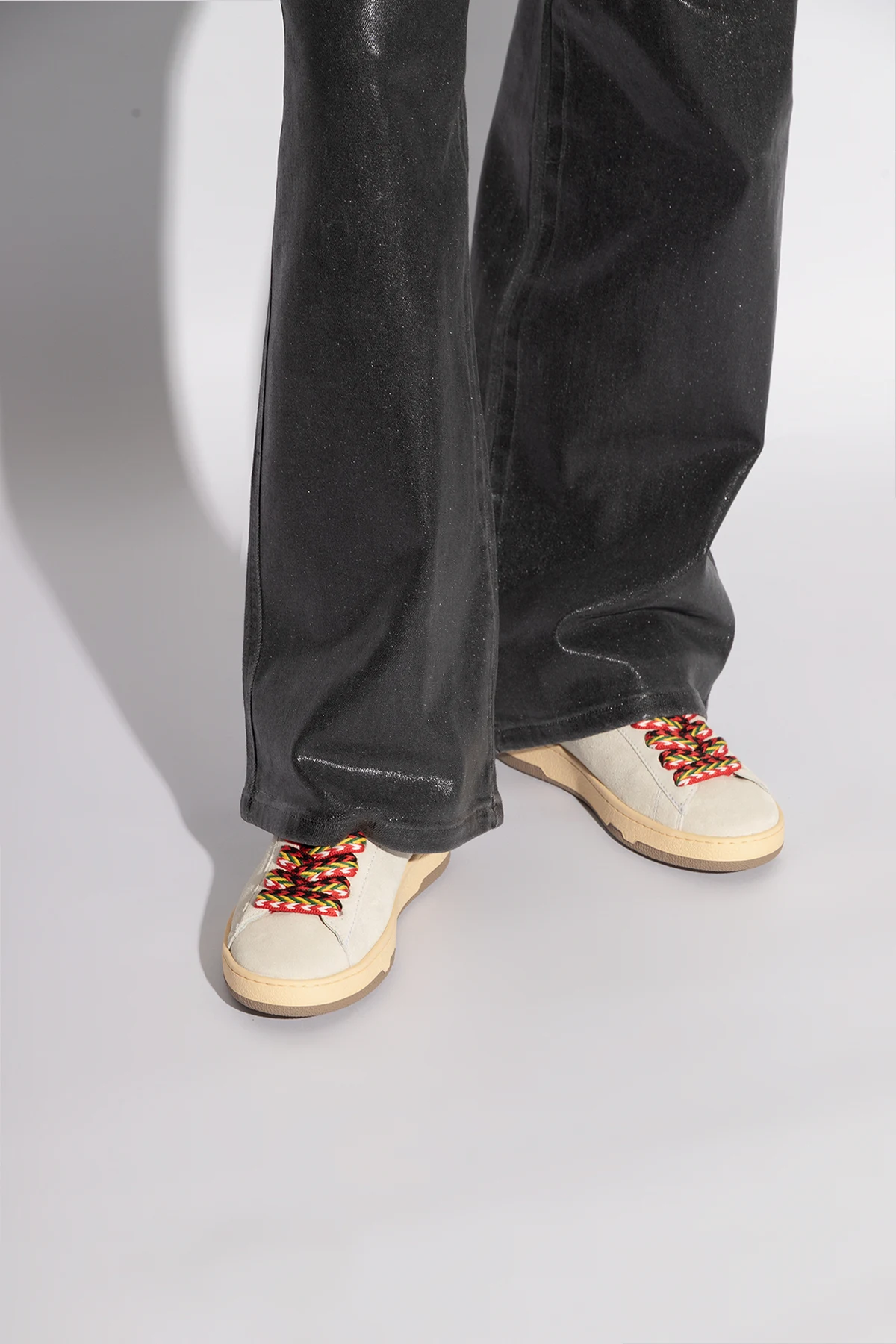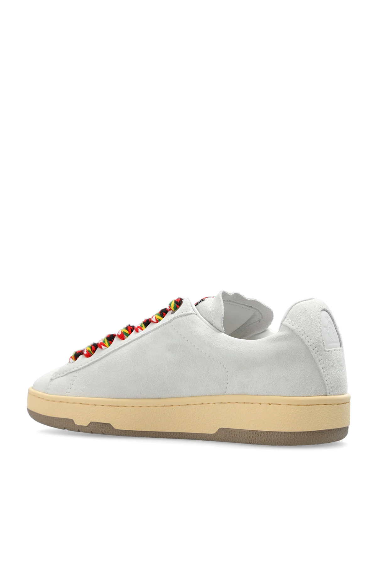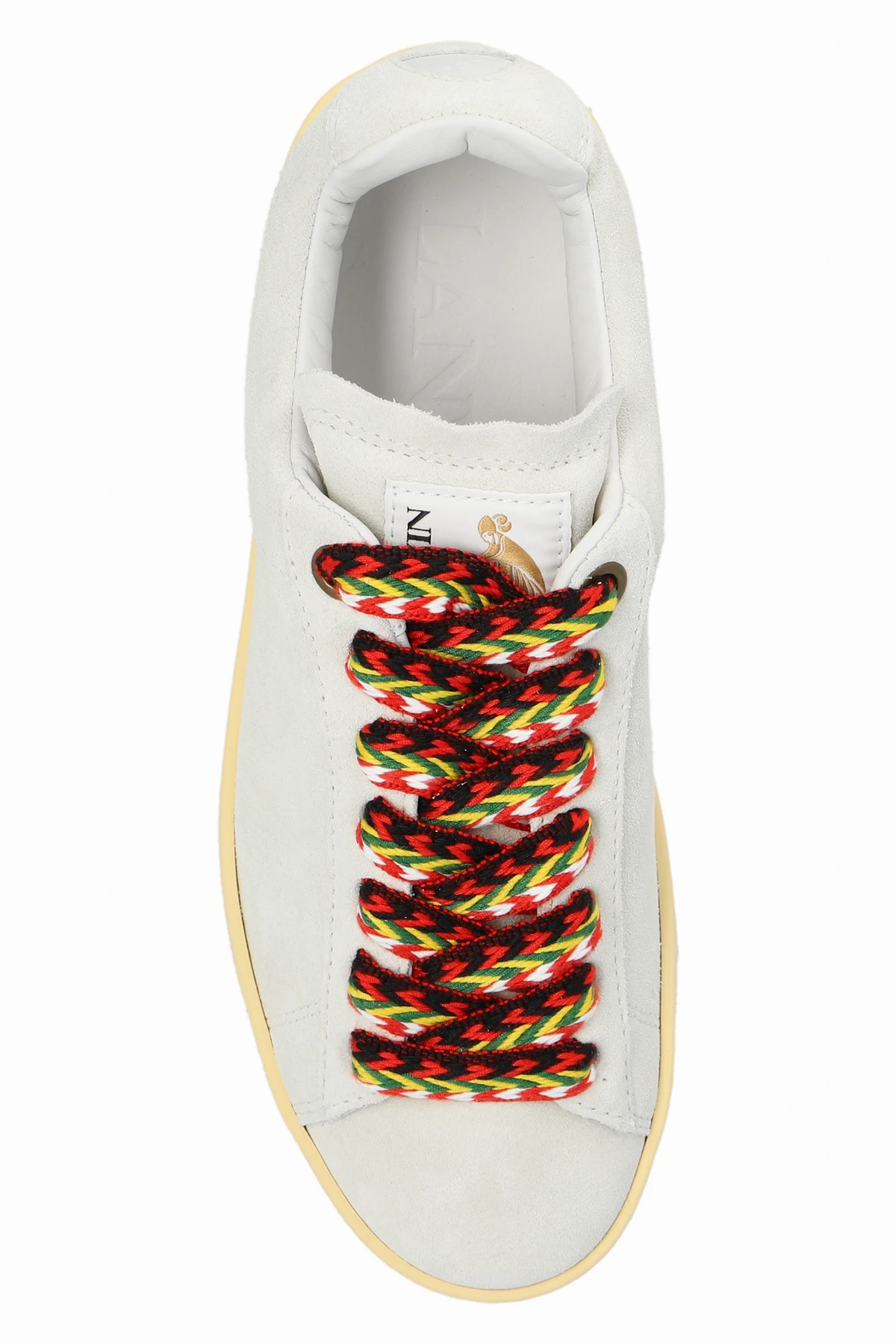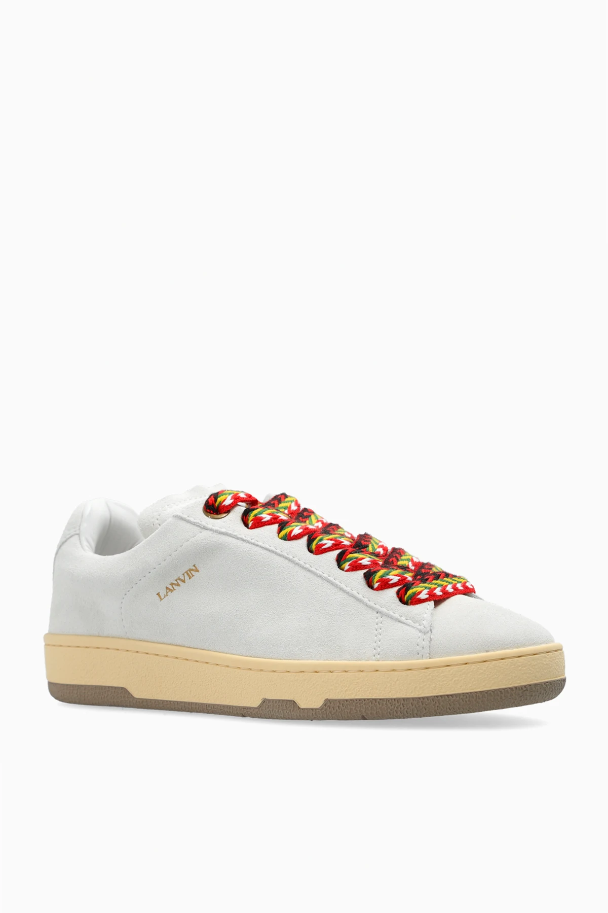 Białe, sznurowane buty sportowe, model 'Curb Lite' Lanvin. Wykonane z zamszu. Z przodu naszywka z logo. Z boku nadrukowane logo w kolorze złotym. Dekoracyjne, kolorowe sznurówki. Brązowa, gumowa podeszwa.