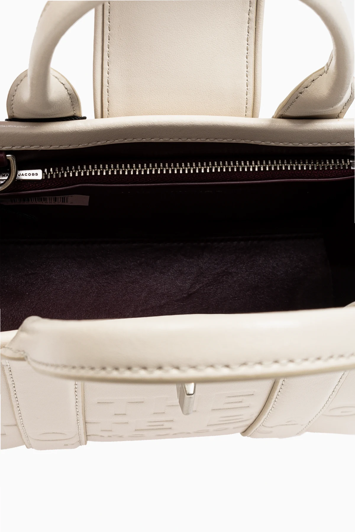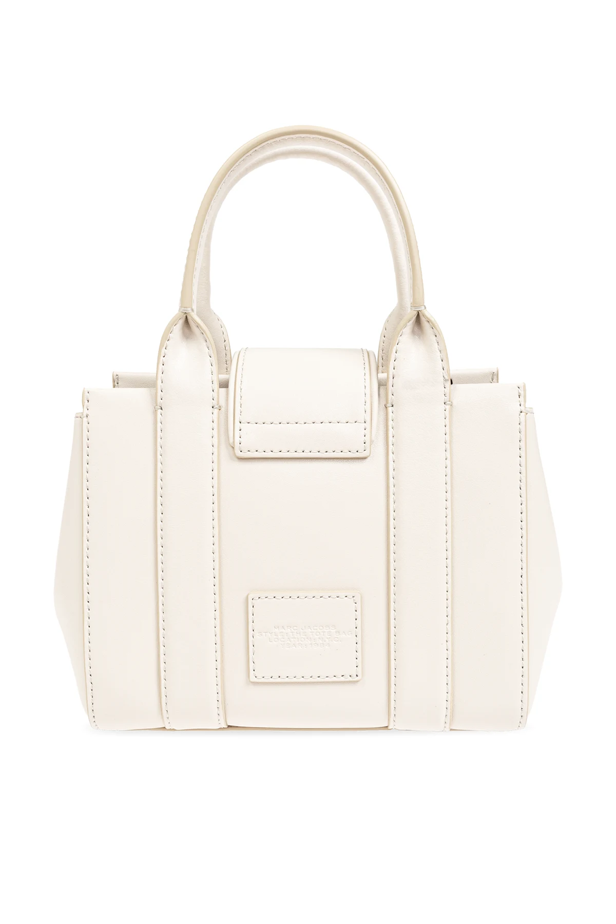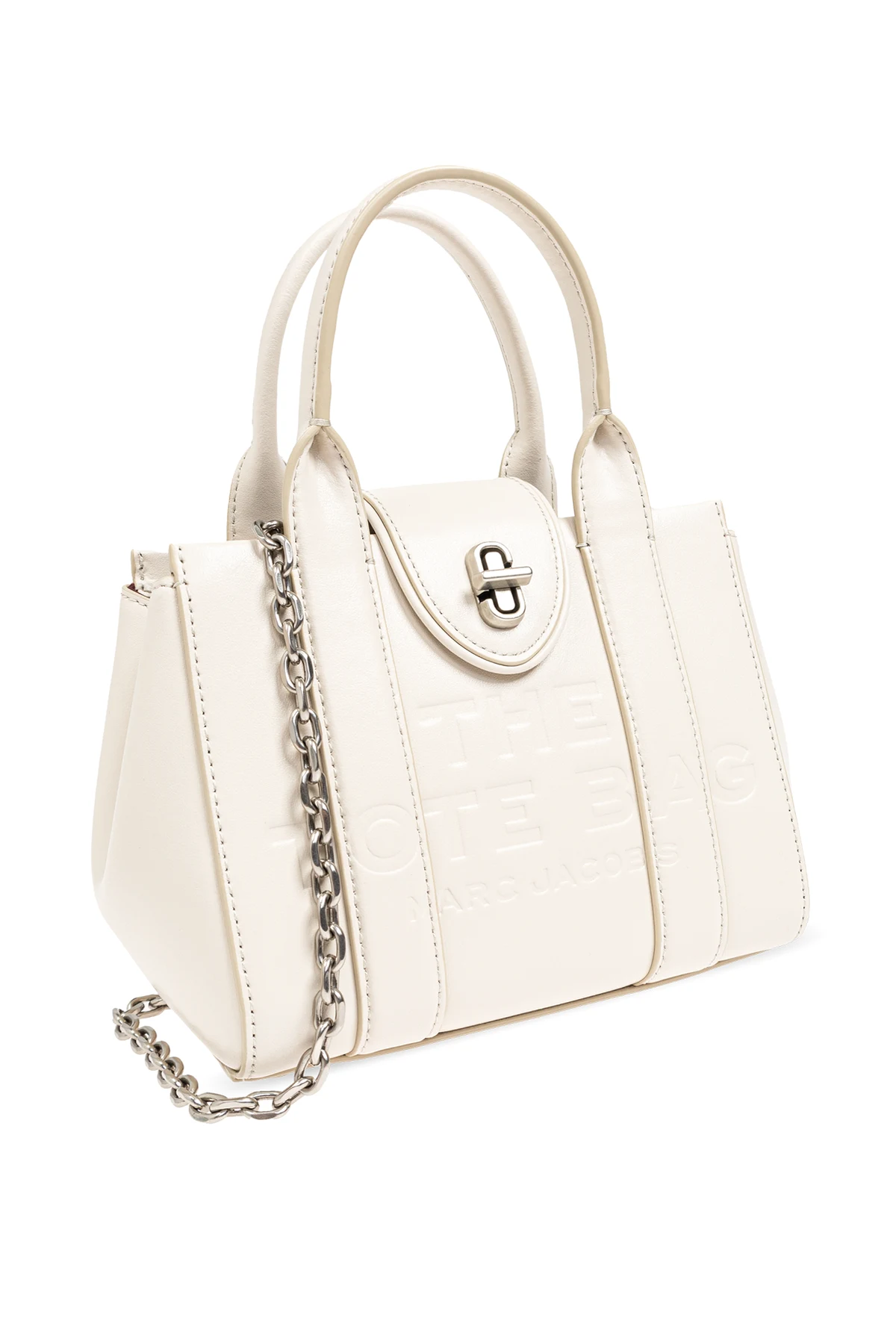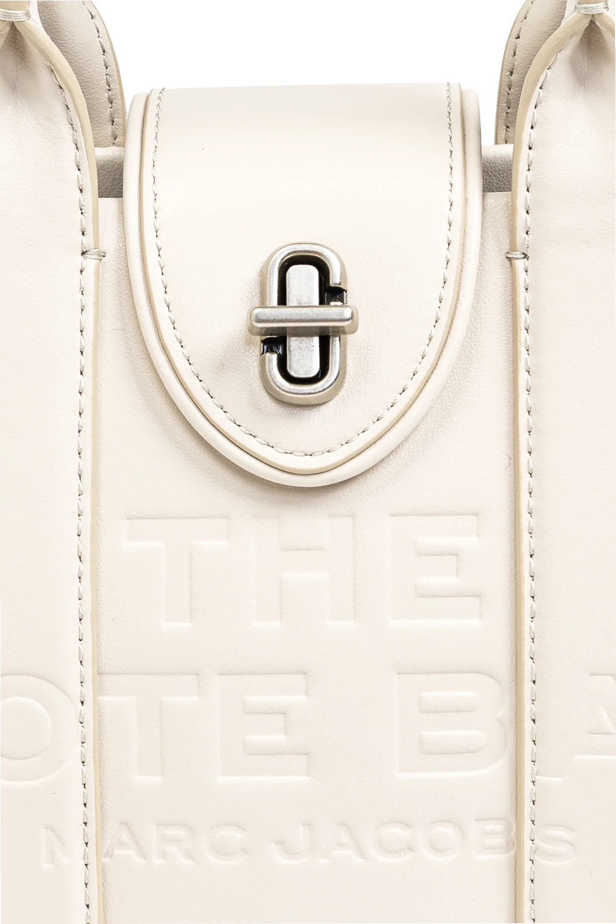 Na przedniej części torby widnieje tłoczenie z napisem "THE TOTE BAG" oraz "MARC JACOBS", co stanowi subtelne podkreślenie jej ekskluzywności. Zapięcie typu twist w kolorze srebrnym dodaje jej luksusowego charakteru. Tył torby jest gładki, z subtelnym logo marki umieszczonym na małym kwadratowym panelu.